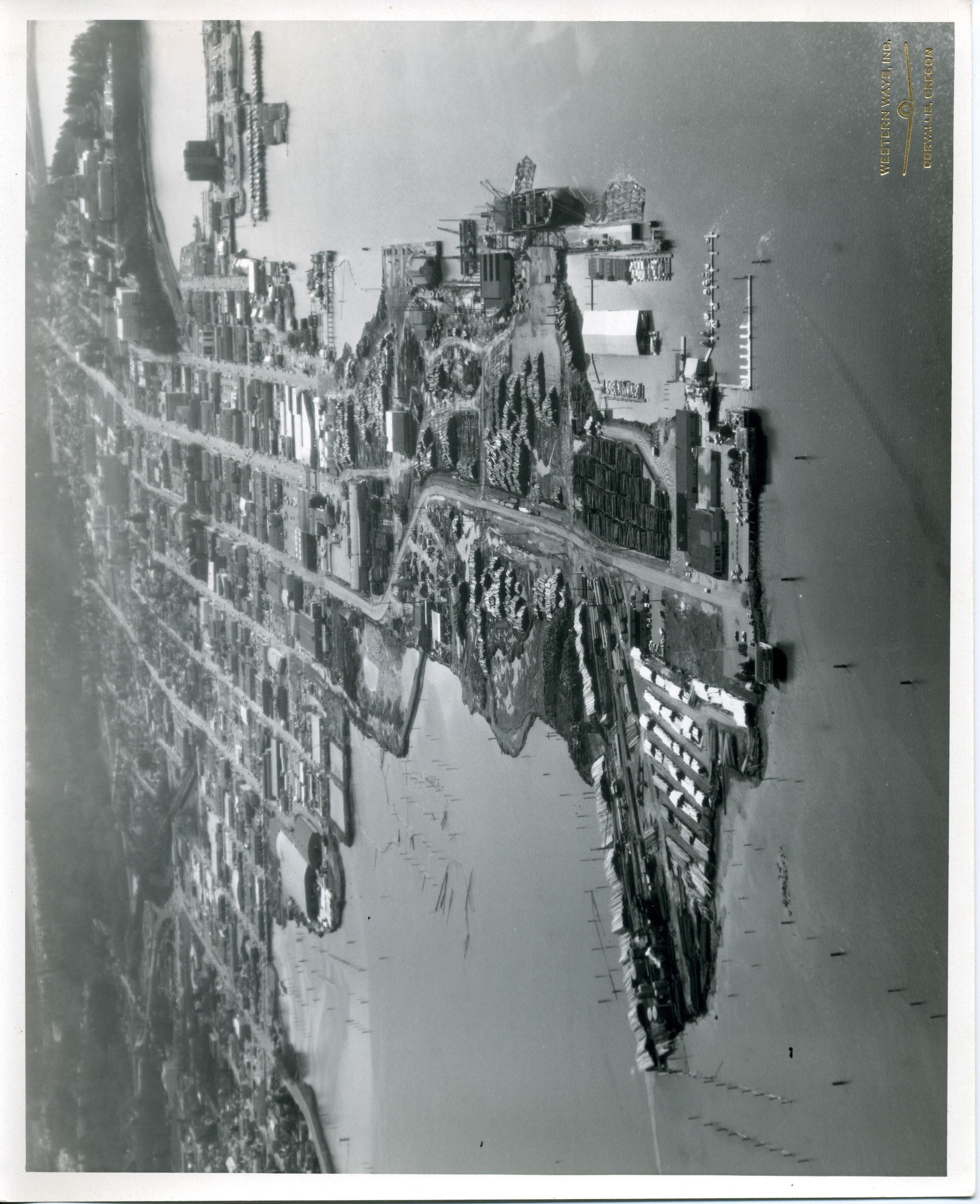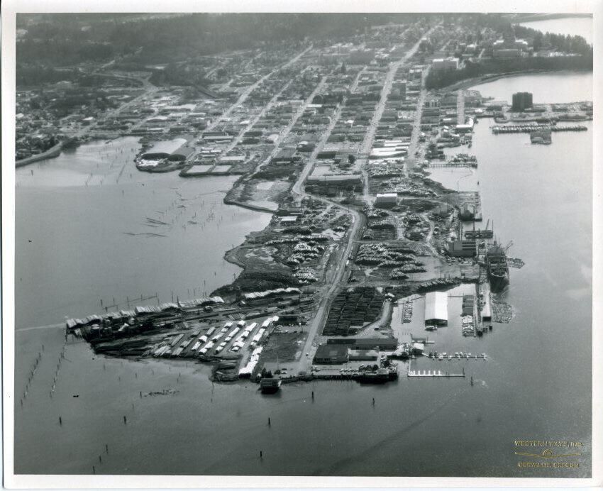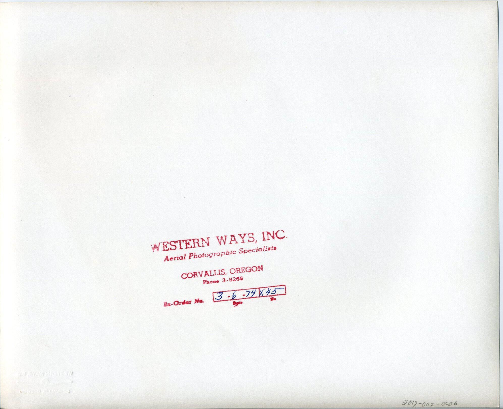 Black and white aerial photo of the Port of Olympia. The image is looking south with the north end of the port peninsula near the bottom of the print. Surrounding the land is the water of Budd Inlet with poles that have been driven into the water visible throughout. On the land are numerous buildings, roads, log stacks, and vehicles. A ship is moored at the wharf near the right of the image. Near the top of the image is the Olympia Yacht Club docks, and the downtown portion of Olympia is visible along with trees and houses. In the upper right corner is the capital campus and a portion of Capital Lake. There is a white border on all sides. In the lower right corner is a stamp in yellow that says "Western Ways, Inc Corvallis, Oregon". On the back is a stamp in red ink that says "Western Ways Inc Aerial Photographic Specialists Corvallis, Oregon Phone 3-5266 Re-Order No." The last part of the stamp is a box in two parts with "Date" below one part and "No." below the other. In the box in blue ink is "3-6-74 x45".Made/Created