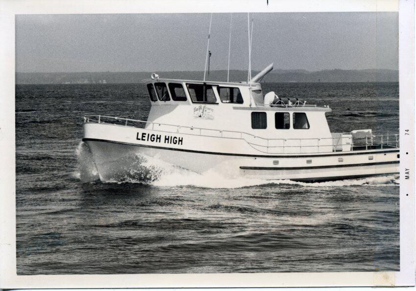Black and white photo of a boat in a body of water. The boat is mostly white and on the side is "Leigh High". There is a railing along the side of the boat and there are windows in a cabin portion and in a bridge section. The boat is moving and there is a wake visible at the bow and along the side. The body of water is extensive and in the background are low hills and sky. There is a white border on all sides and in the right border is "May 74". On the back in pencil is something that is unreadable and also "64%".