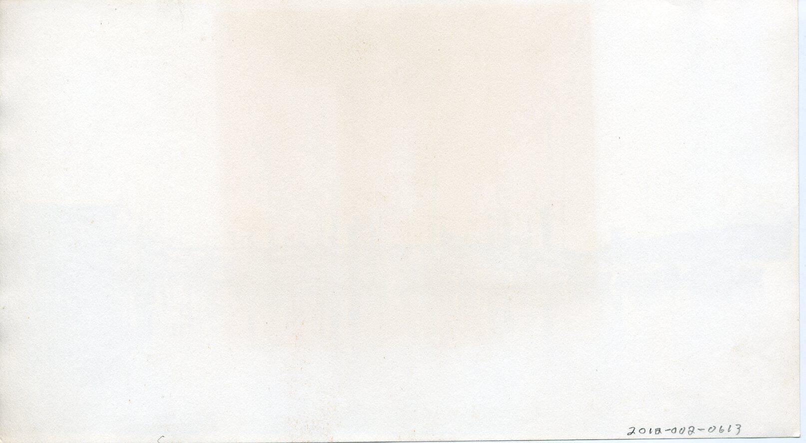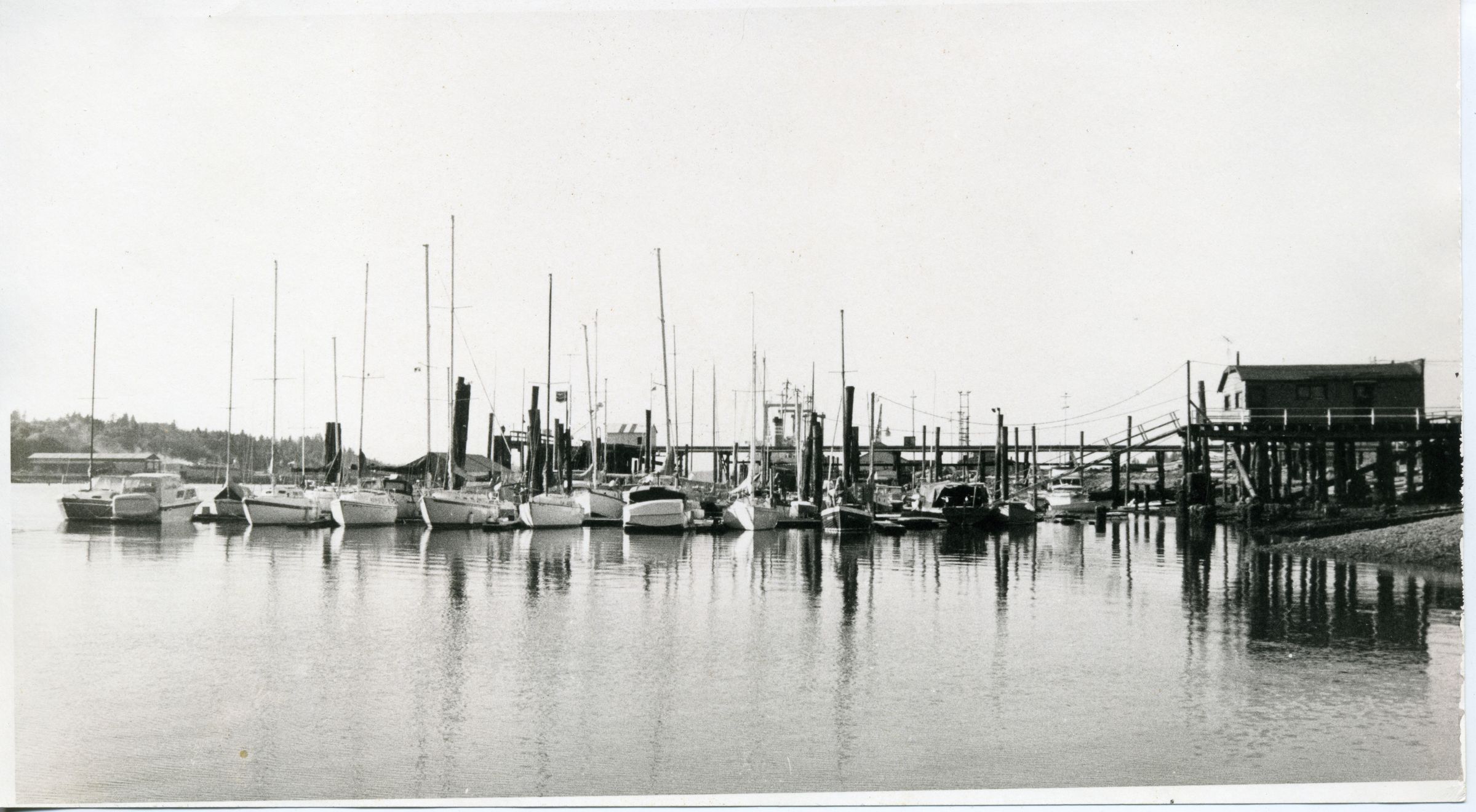 Black and white photo of boats at a marina setting. Approximately 15 boats are visible along with a building with a railing and an adjustable ramp for access to the floats where the boats are moored. There is also a bridge-like structure in the background. At the left of the image in the background is a hill and trees and in the foreground is water with reflections of the boats. Most of the boats have tall masts and are presumed to be sailboats although no sails are seen. There is a thin border at the top and bottom and left side, but none at the right. There is no information on the back.Made/Created