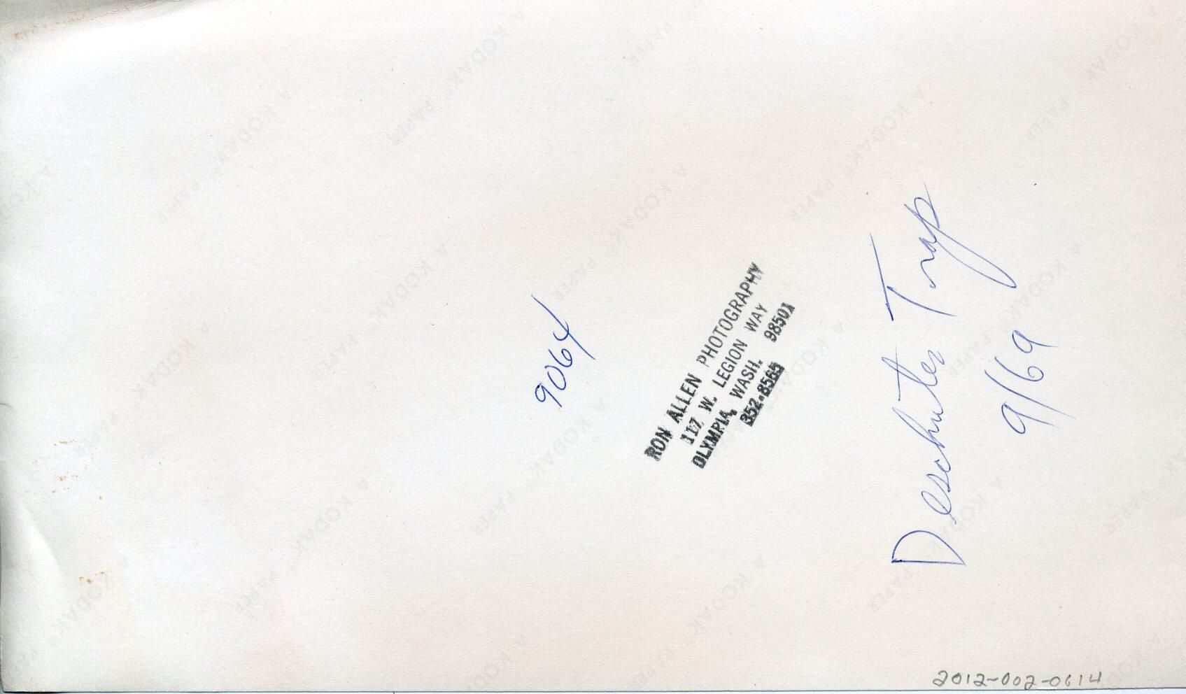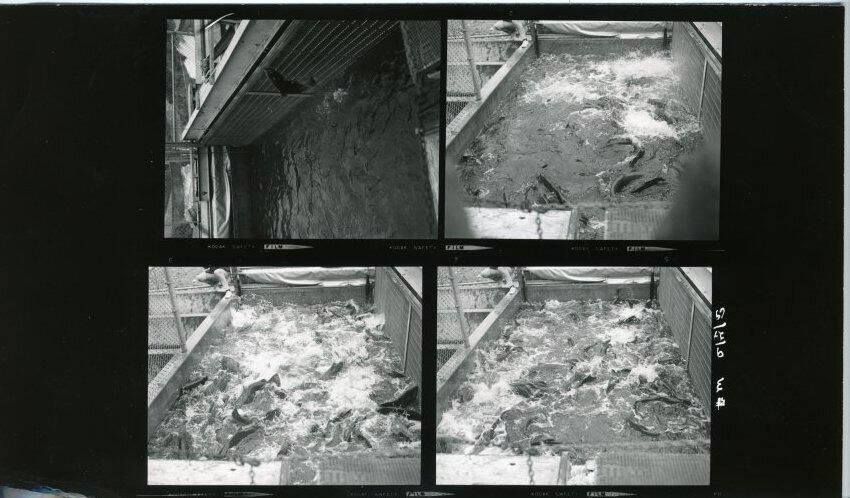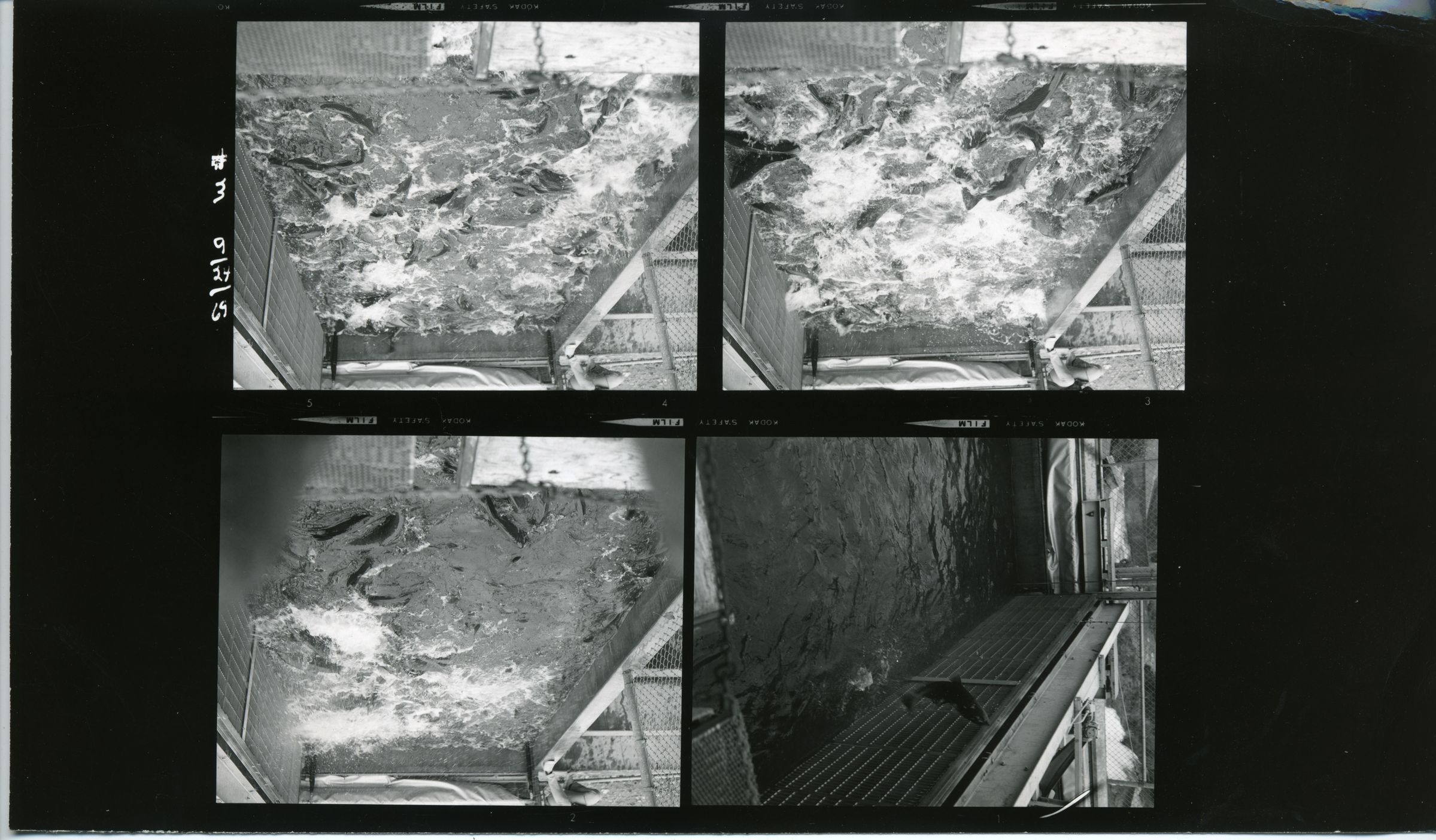 Four black and white images are printed on a black background. The images are of parts of the Dechutes fish hatchery in Tumwater Falls Park. In the upper left is an image of a tank full of water with a single salmon jumping out of the water. Steel beams and other parts of the structure are visible. The other three images show a different tank with many salmon swimming, jumping and thrashing in the water. The water has white splashes, and the parts of the structure visible include a wire fence on the left side and a chain in the foreground. Below each image is information, the only part that is readable says "film". Beside the lower right image is written in white "10 M 9/27/69". On the back in ink is "9064" and "Dechutes trap 9/69". There is a stamp in black ink that says "Ron Allen Photography 117 W. Legion Way Olympia, Wash. 98501 352-8565".Made/Created