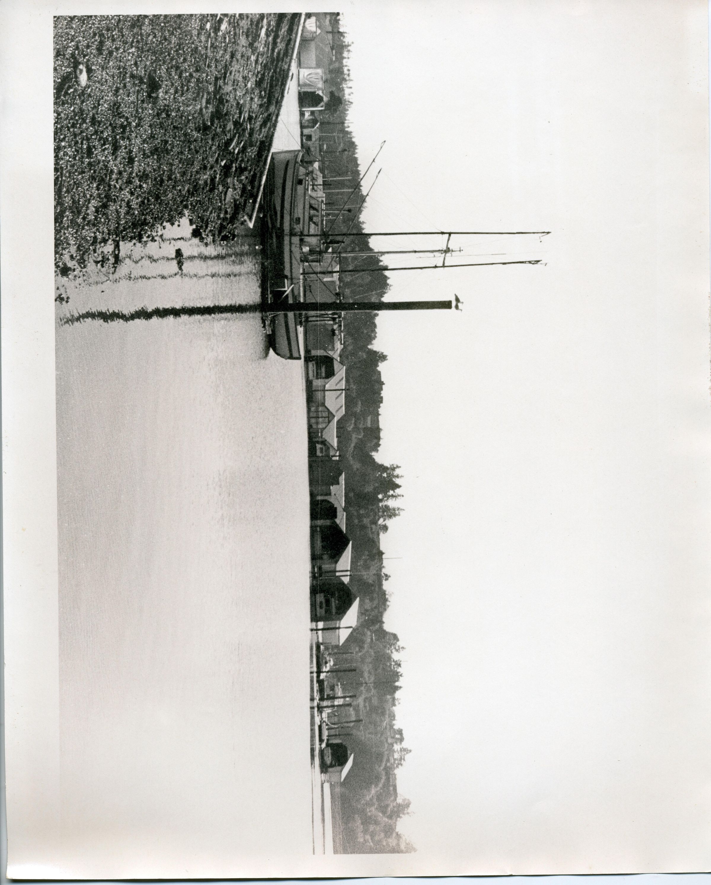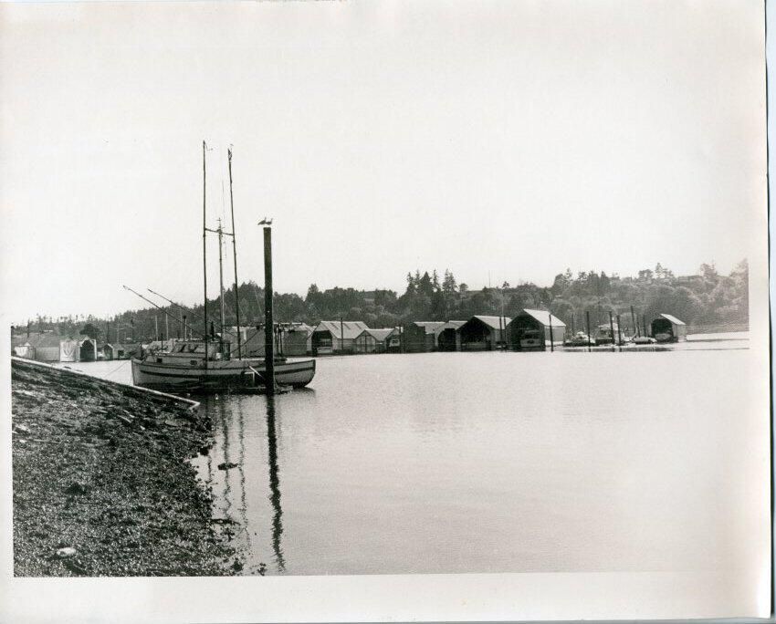 Black and white photo of a marina setting. In the foreground on the left is part of an earthen embankment. Water is present in the right foreground and sticking out of the water is a tall pole with two birds standing on its top. Behind the pole is a commercial fishing boat with masts and booms designed to deploy nets. The hull of the boat is white with a black stripe. In the middle distance is a row of boat houses with parts of boats visible in the opening of some of the houses. Behind the boat houses is a hill with a few houses and lots of trees. There is a white border on all sides with the bottom border being slightly larger. There is no information on the back.Made/Created
