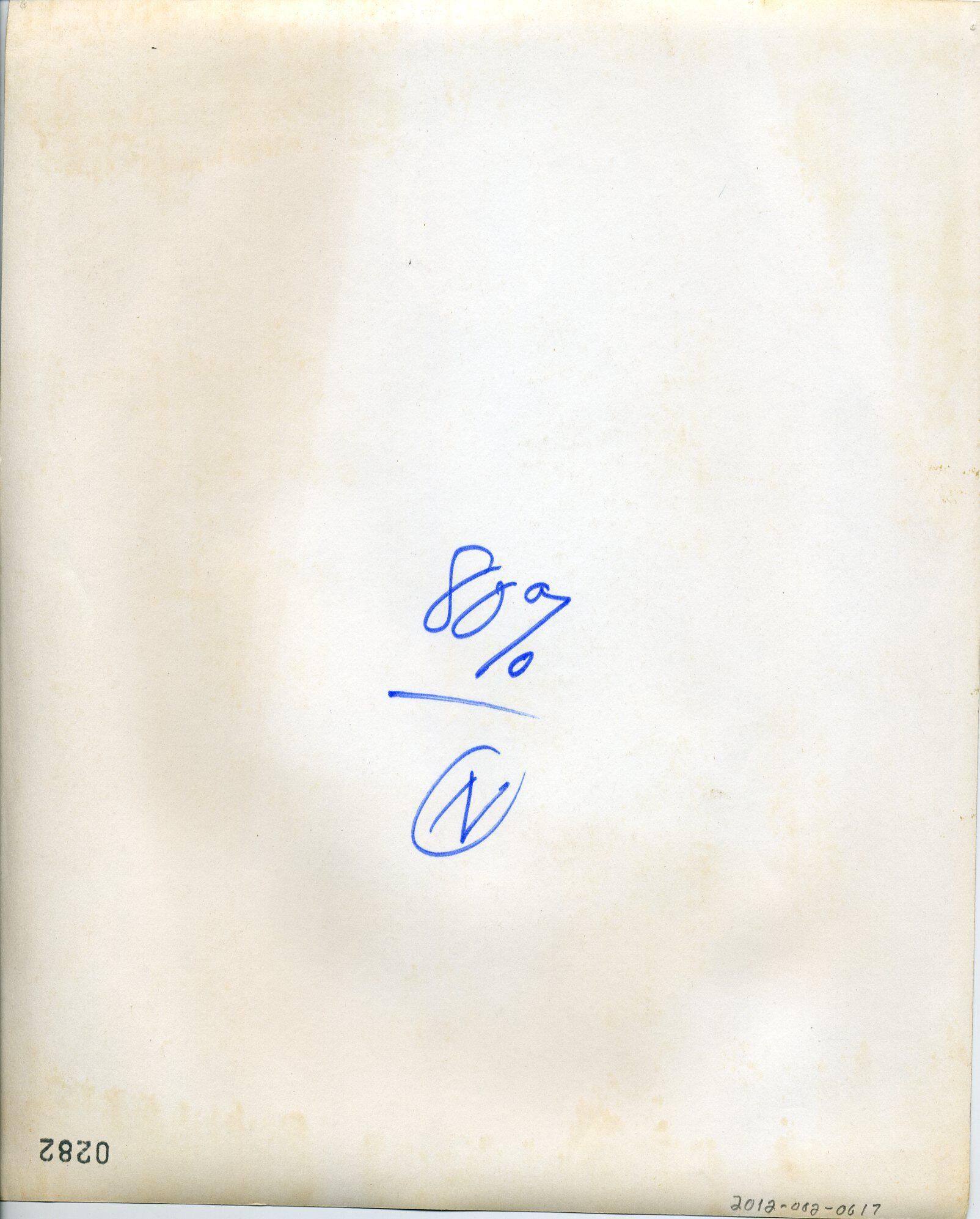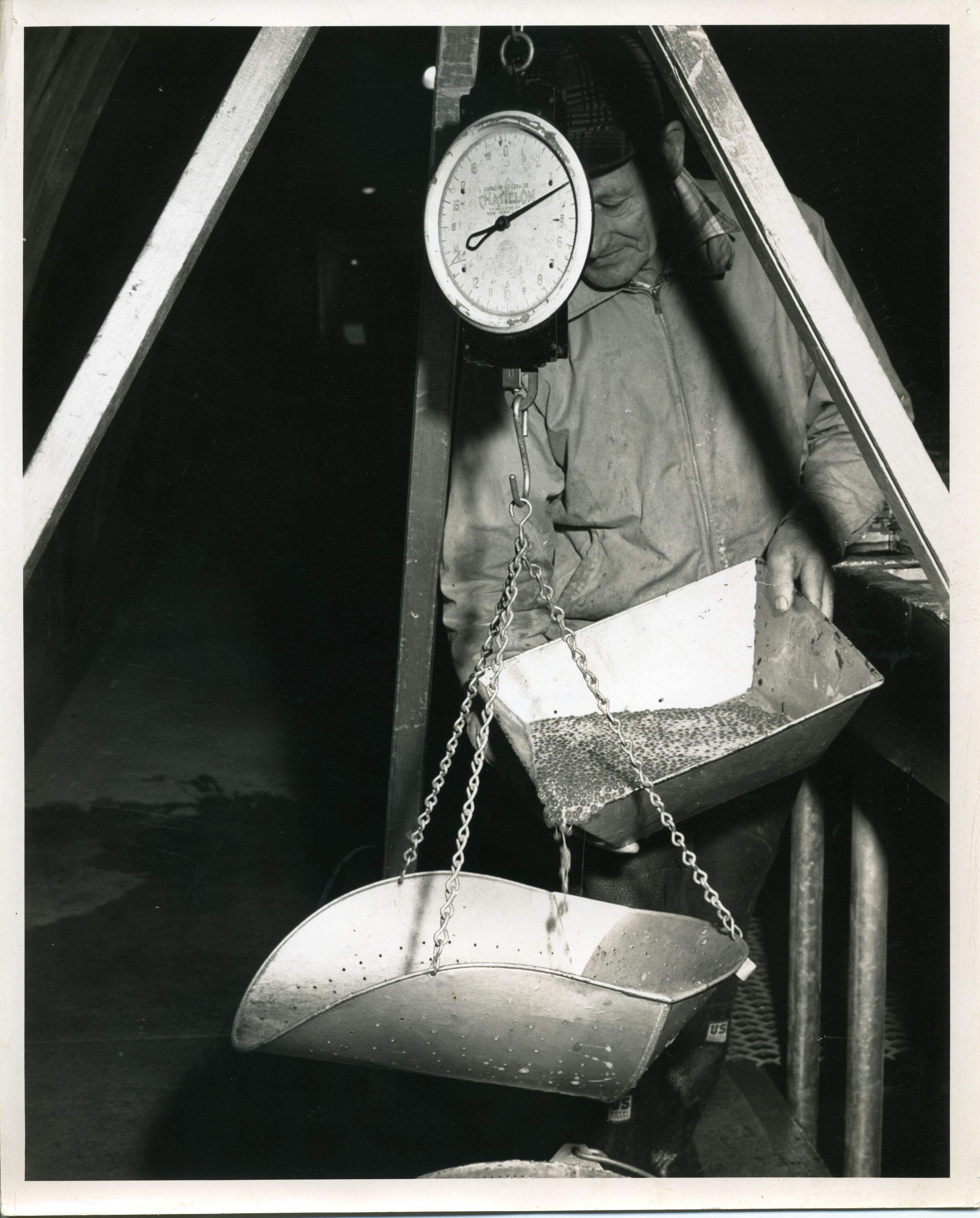 Black and white photo of a man weighing salmon eggs. In the foreground is a metal framework from which is suspended a dial and a chain assembly holding a metal container. Behind that is a man holding a metal container and pouring a substance from that container into the one suspended from the dial. It is assumed that the substance is salmon eggs. The man has on a dark hat with a visor and a light colored jacket over dark trousers and what appears to be rubber boots. The background consists of darkness with what appears to be a concrete floor and some lights on a far wall. There is a white border on all sides. On the back in blue felt pen is "80%" and "N" in a circle. Printed on the back in black is "0282".