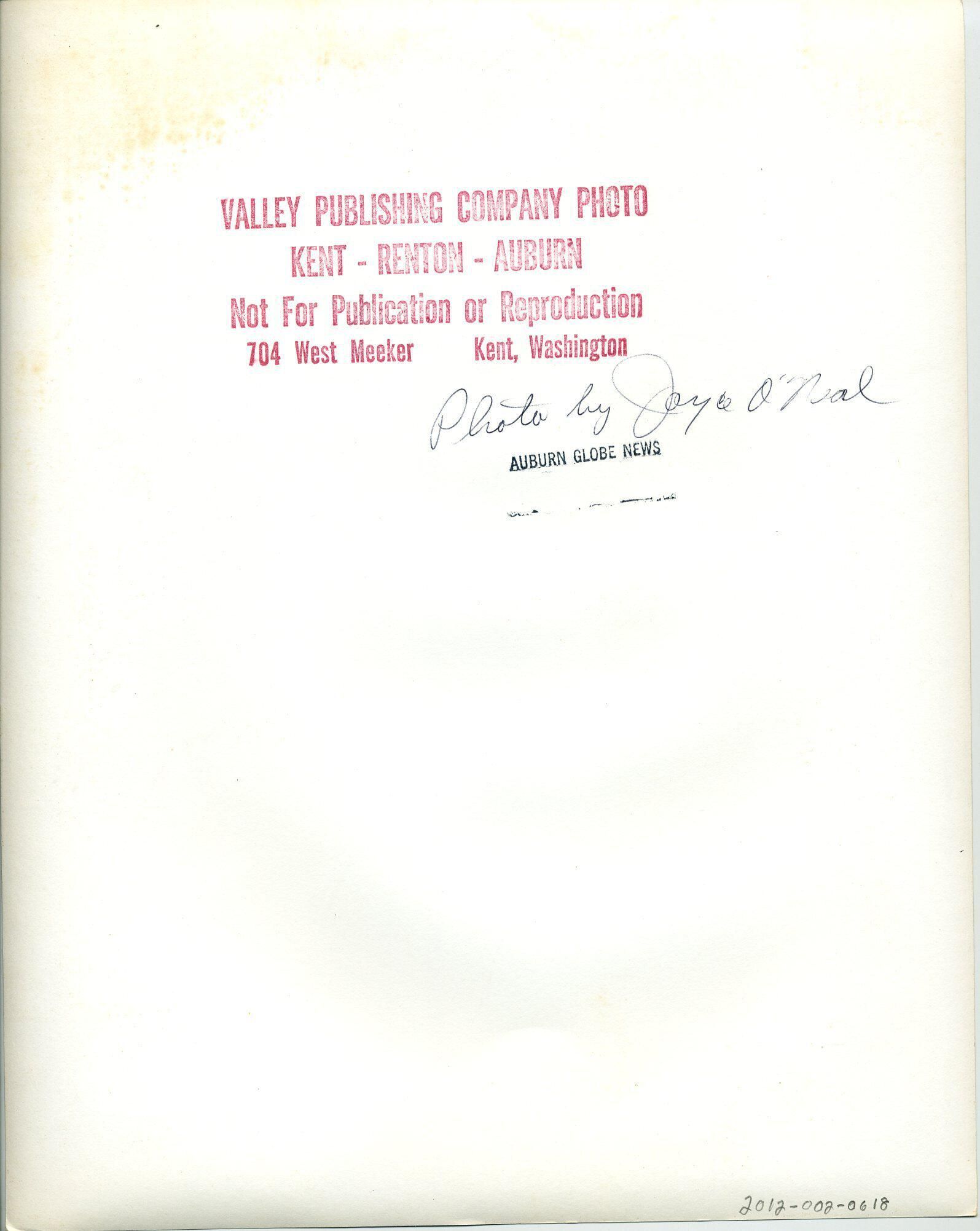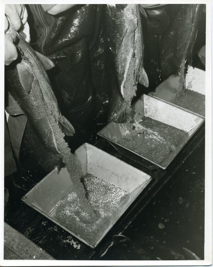 Black and white photo of salmon eggs being extracted from fish bodies. Three salmon are being held above metal containers and from slits in the fish bodies eggs are dropping into metal containers. Fingers can been seen holding the fish on the left and the containers are resting on a shelf above water. Behind the fish are what appears to be rubber garments worn by the workers. There is a white border on all sides. On the back in red is stamped "Valley Publishing Company Photo Kent - Renton - Auburn Not for publication or reproduction 704 West Meeker Kent, Washington". In ink is "Photo by Joyce O'Neal". A black stamp says "Auburn Globe News".Made/Created