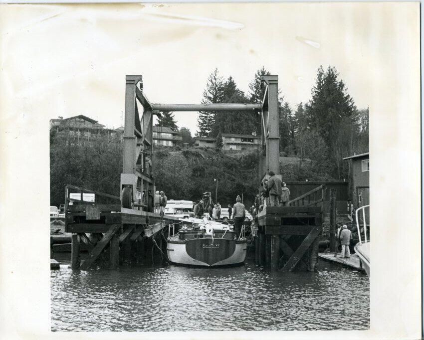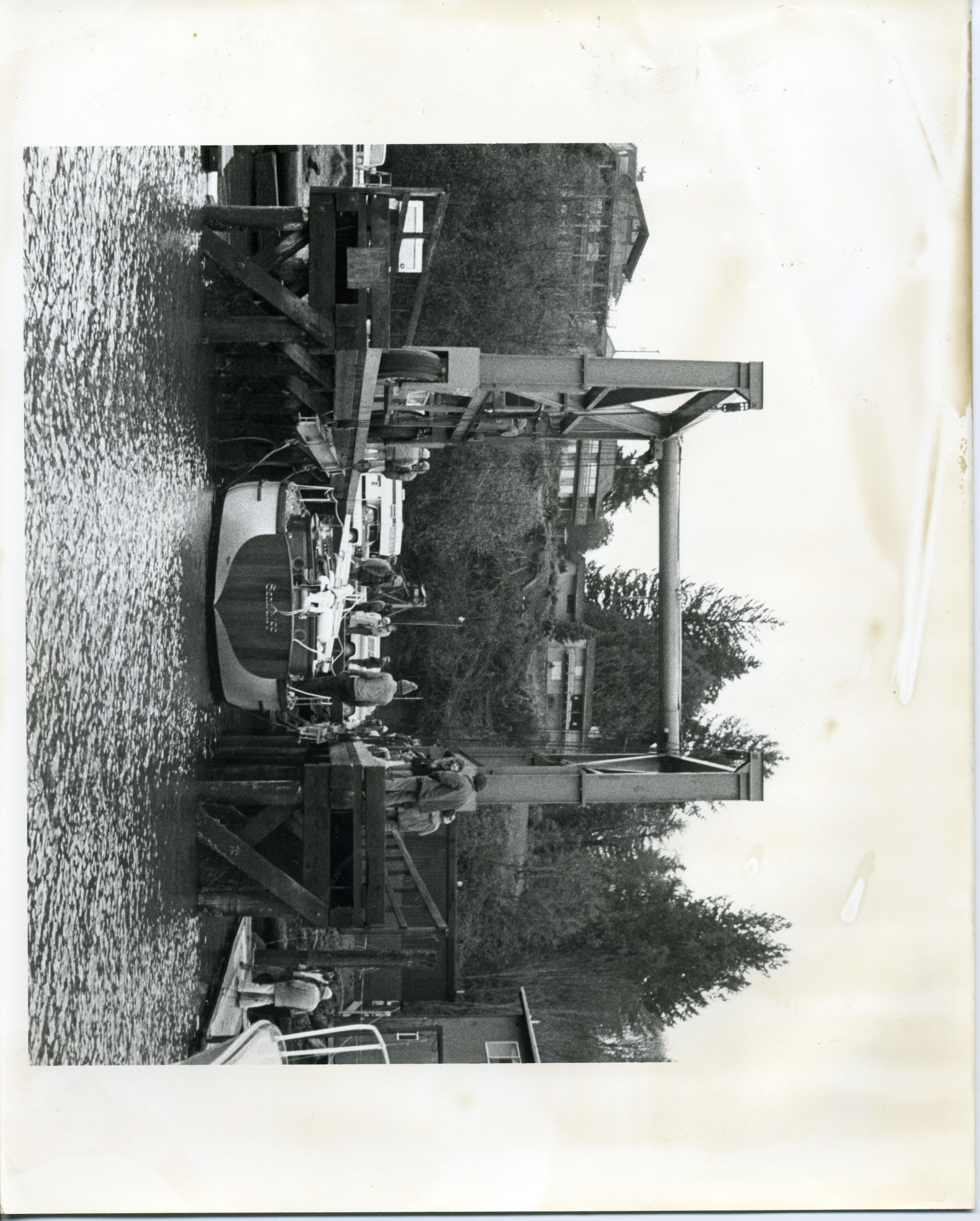 Black and white photo of a structure at a marina used to move boats in and out of the water. The main object of interest in this image is a pier on wooden pilings that has a solid floor near the shore and an open area at the water end. On the pier is a metal framework made up of steel beams and mounted on wheels that run along the sides of the pier. On the framework is hoisting equipment for raising or lowering a boat onto a transport or into the water. In this image the boat has been lowered into the water. The back of the boat is visible. The boat's name can been seen but except that it begins with an "S" it is not readable.The boat's mast is lying flat on the top of the boat. Numerous persons are visible working on the boat or merely observing. All are wearing foul wether gear such as stocking caps or hoods. In the background is a hill covered with foliage and at the top are buildings. There are white borders on all sides with the side borders being larger. There is no information on the back. There is a repeated and very faint statement on the back that says "This paper manufactured by Kodak".Made/Created