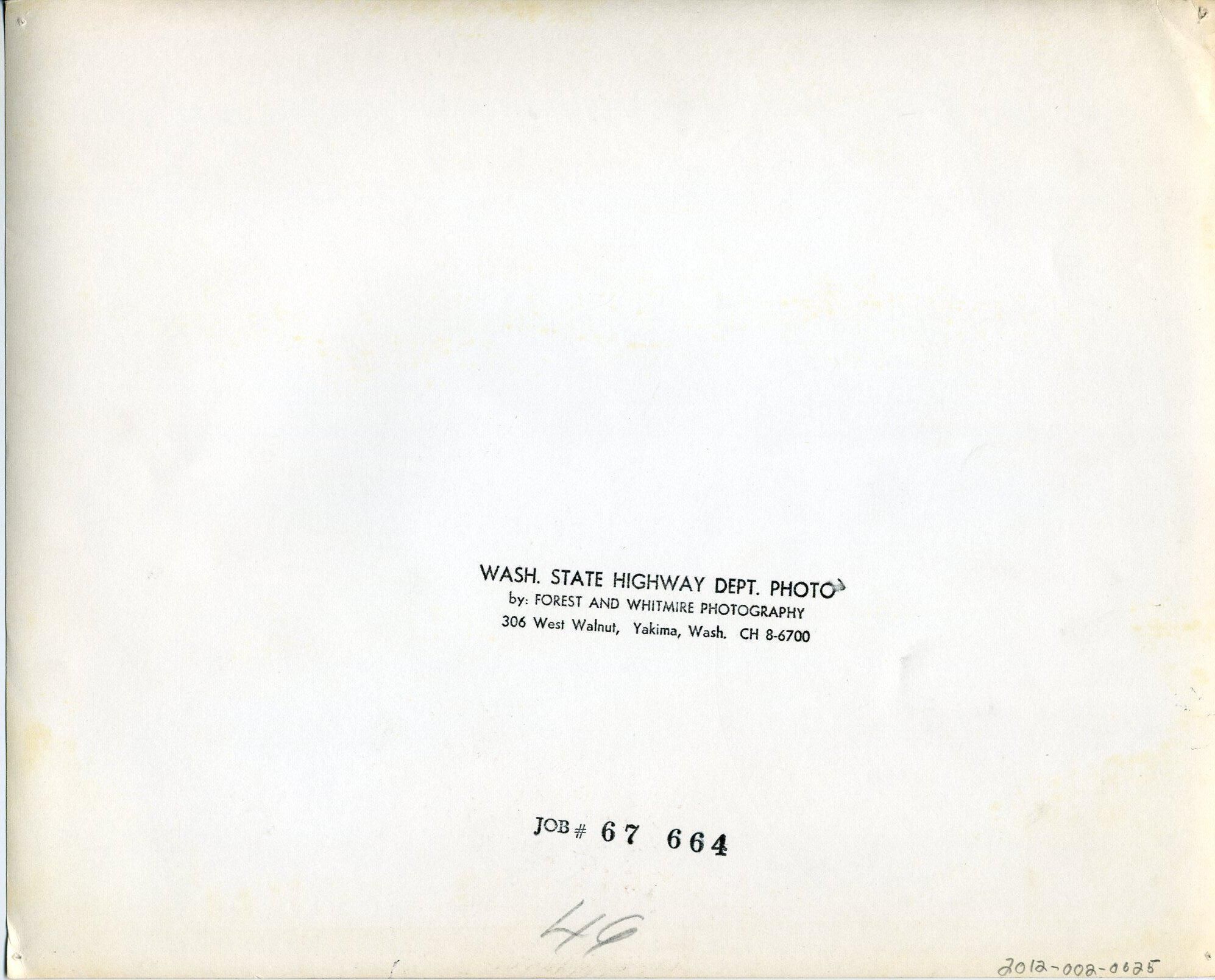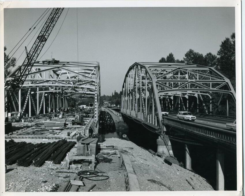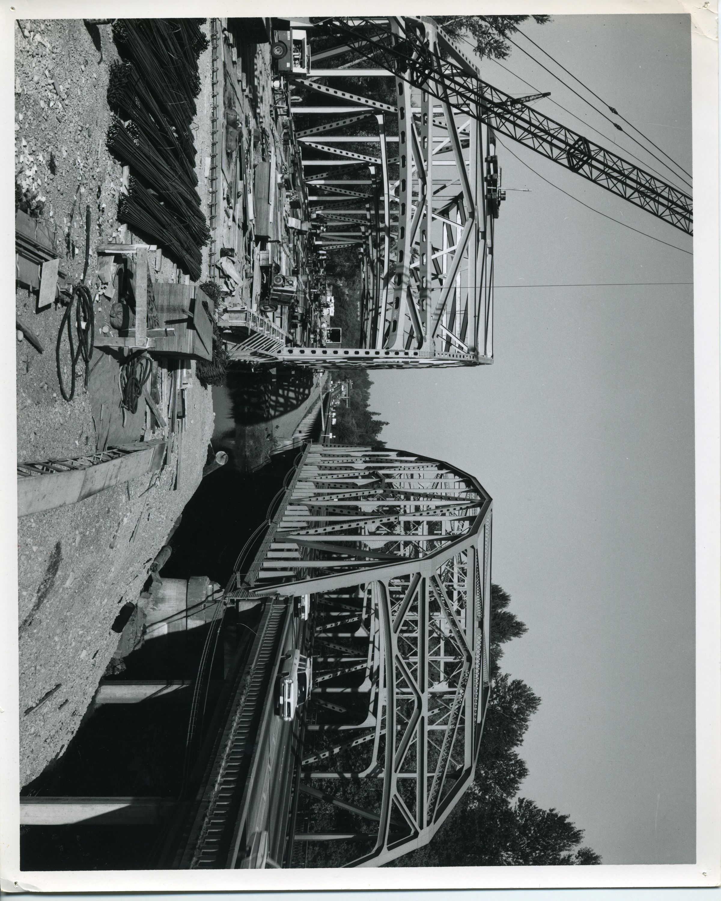 Black and white photo of two side-by-side highway bridges. Both bridges consist of a framework made up of steel girders. The bridge on the right appears to be in use while the one on the left is under construction. Concrete piers supporting he bridge on the right are visible as is a concrete railing. In a gravel area in front of the bridge on the left are various construction equipment and materials including bundles of re-bar. On the bridge deck are materials and equipment including what appears to be an air compressor and two vehicles. The boom of a crane extends from the left side to the top of the image. Trees are visible on the right and left edges. There is a white border on all sides. On the back is a stamp in black ink that says "Wash. State Highway Dept. Photo by Forest and Whitmire Photography 306 West Walnut, Yakima, Wash. CH 8-6700". Another stamp says "job #67 664". In pencil is "49".Made/Created