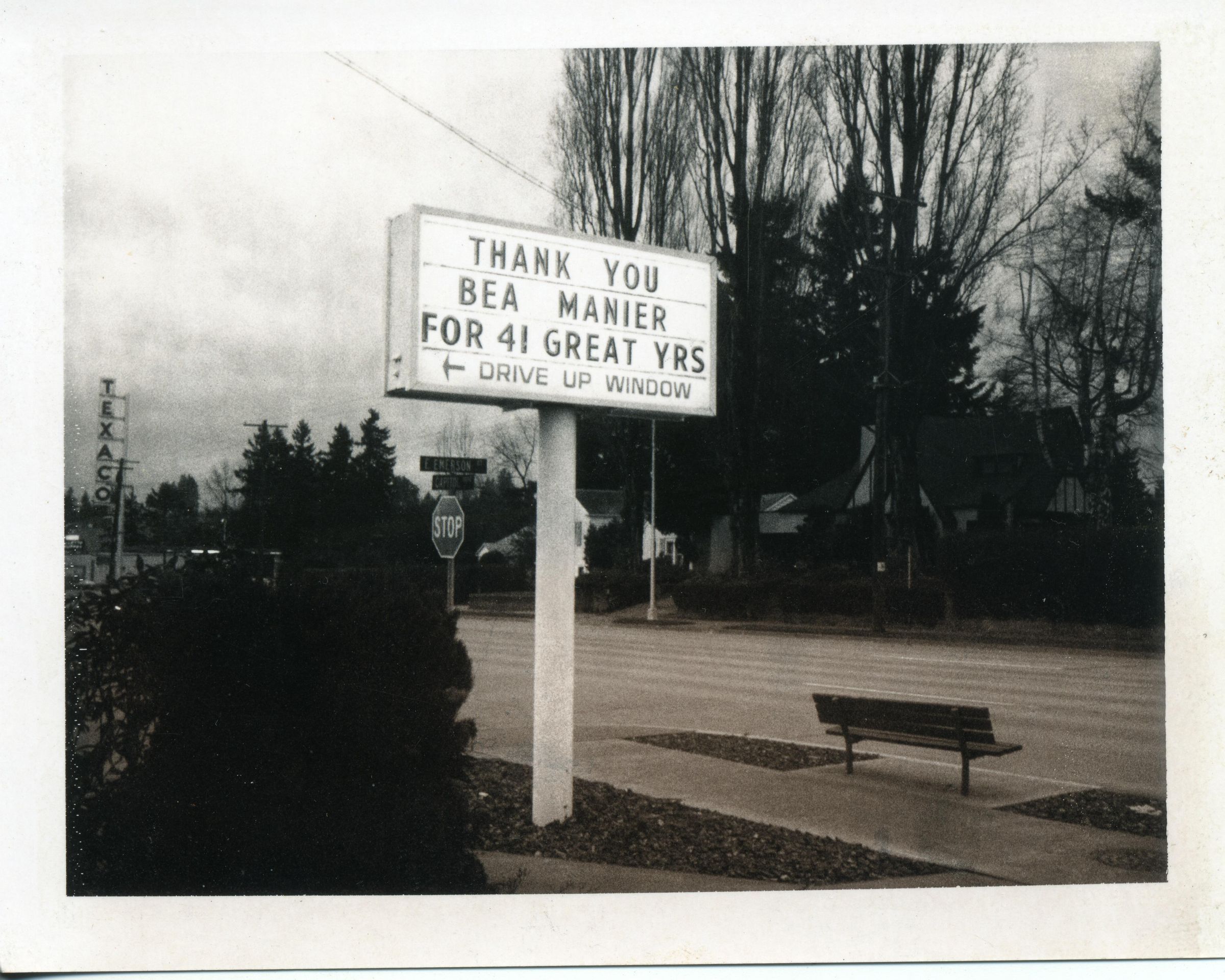 Black and white Polaroid photo of a reader-board beside a street. On the reader-board is "Thank You Bea Manier for 41 Great Yrs Drive up window". Along the street is a bench and a stop sign. Near the left of the print is a sign that says "Texaco". Trees are visible on both sides of the street. There is a white border on all sides. On the back in blue ink is "150%" and printed on the back is "LO Polaroid [R in a circle] Type 107 1406051RR".