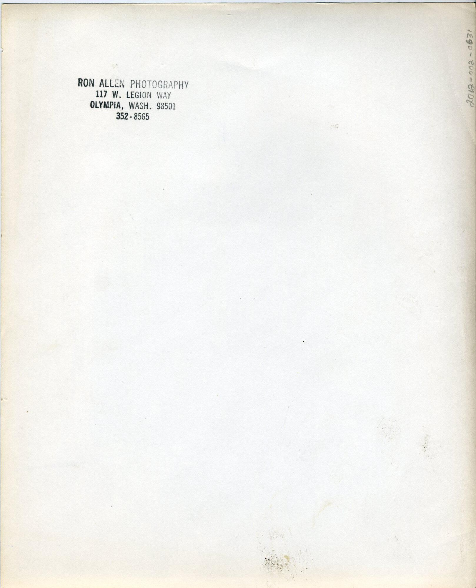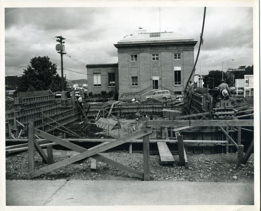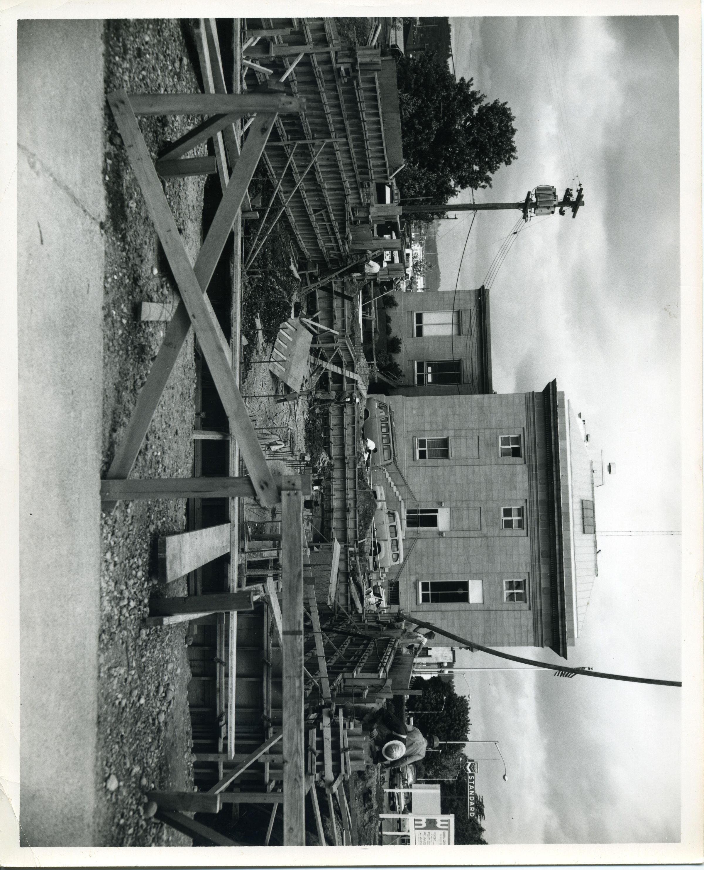 Black and white photo of construction work beside what may be the old Thurston County Courthouse. In the foreground is a sidewalk beyond which are some barriers made up of planks. Behind that is a busy construction scene consisting of concrete forms, rebar, ladders, boards, plywood, and a hose that could be a filler hose for concrete. There are several workmen visible, most of them wearing or carrying hard hats. Further back are vehicles parked beside the building believed to the courthouse. To the left is a power pole and wires and a tree. To the right are signs, light poles, a flag pole and flag, and a sign that says "Standard" More trees are visible in this area. The building has stairs and a railing leading to a door, and has windows of various sizes and a skylight and other items on its roof. There are clouds in the background. There is a white border on all sides. On the back is a stamp in black ink that says "Ron Allen Photography 117 Legion Way Olympia, Wash. 98501 352-8565".Made/Created