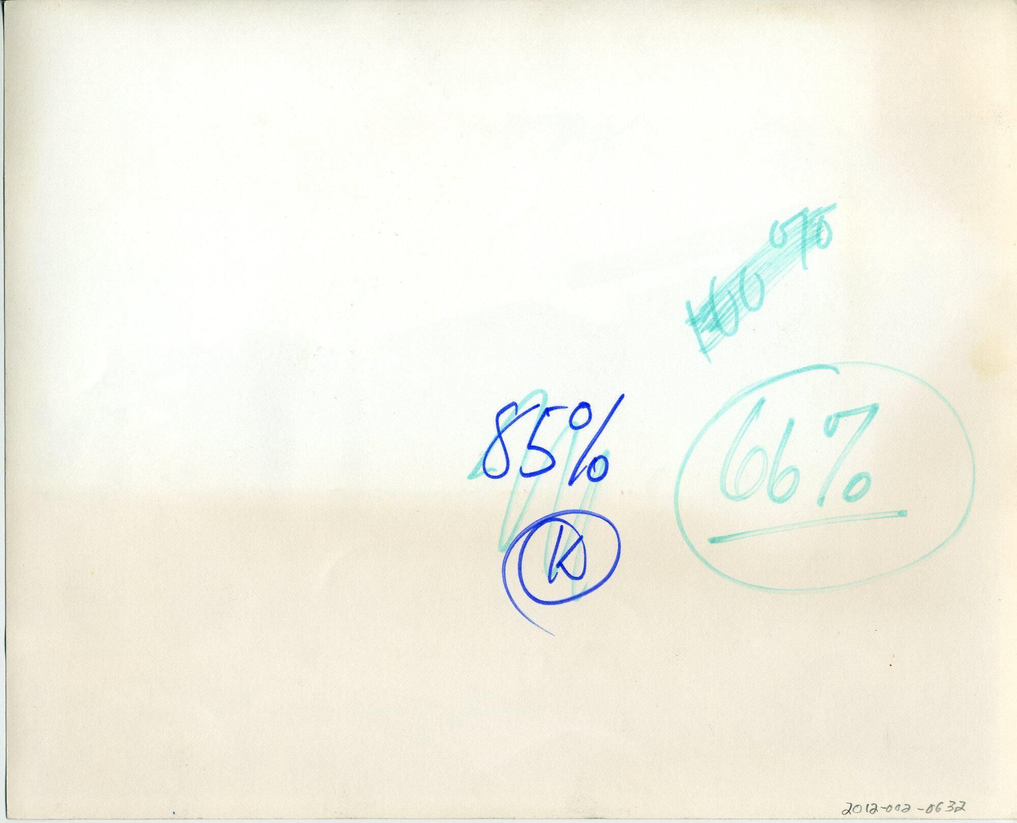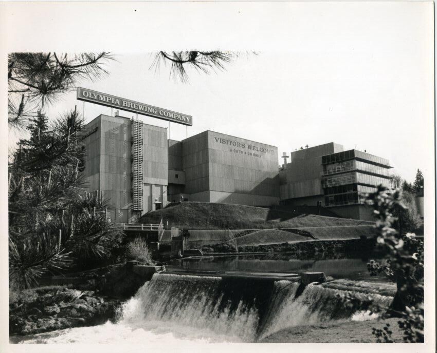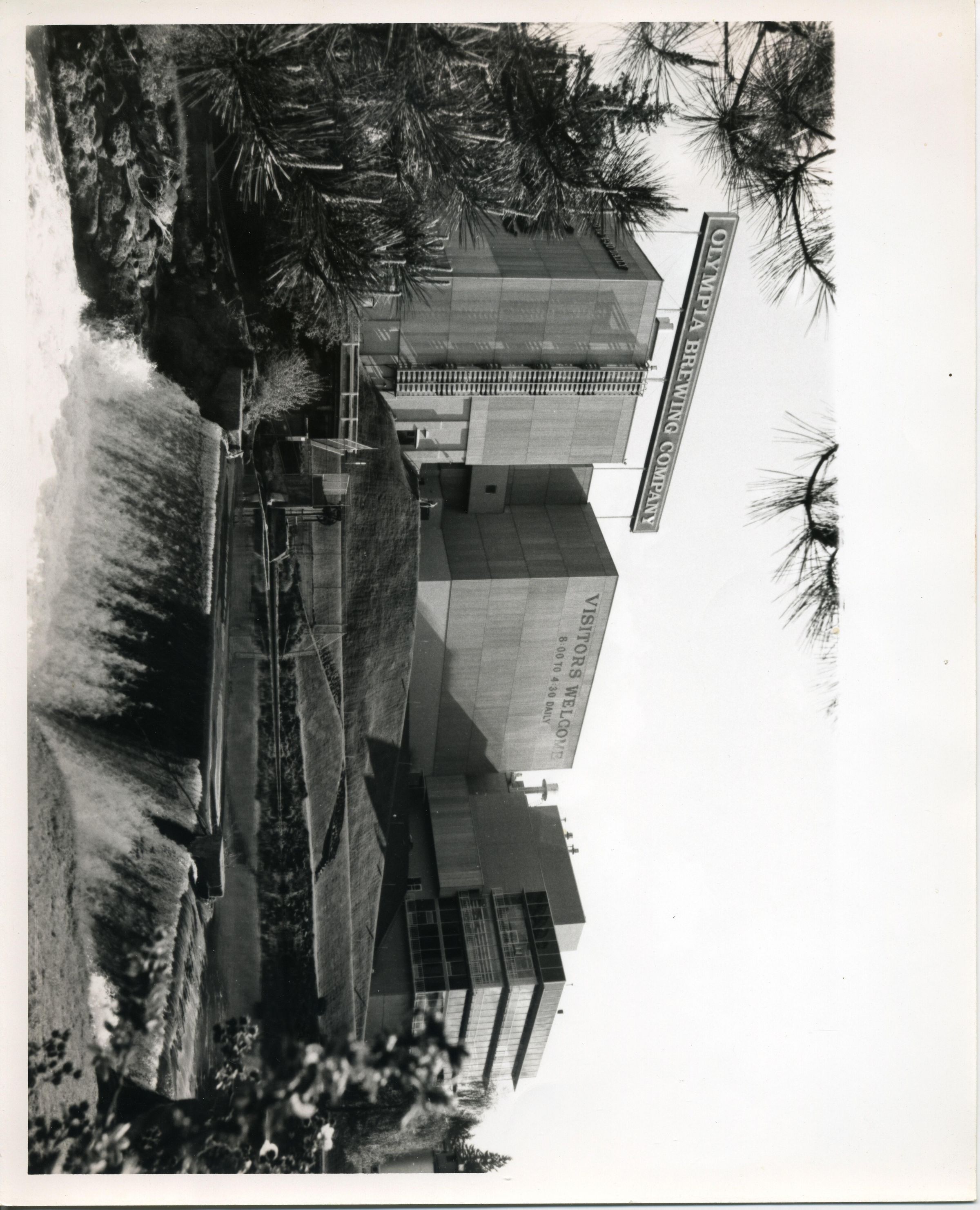 Black and white photo of the Olympia Brewing Company buildings. In the foreground is the falls on the Deschutes River in Tumwater Falls Park. To the left and right is foliage and in the background are several of the main buildings of the brewery. There is a sign above the building on the left that says "Olympia Brewing Company" and on the building next to it is "Visitors Welcome 8 00 to 4 30 Daily". Behind the falls is water, covered areas, lawn, and a stairs and railing. An individual is visible who appears to be operating a lawn mower. There is a white border on all sides. On the back in blue ink is "85%' and a "k" in a circle and "100%" in green ink. All of those notations have been crossed out with green ink. Also in green ink is "66%' in a circle.