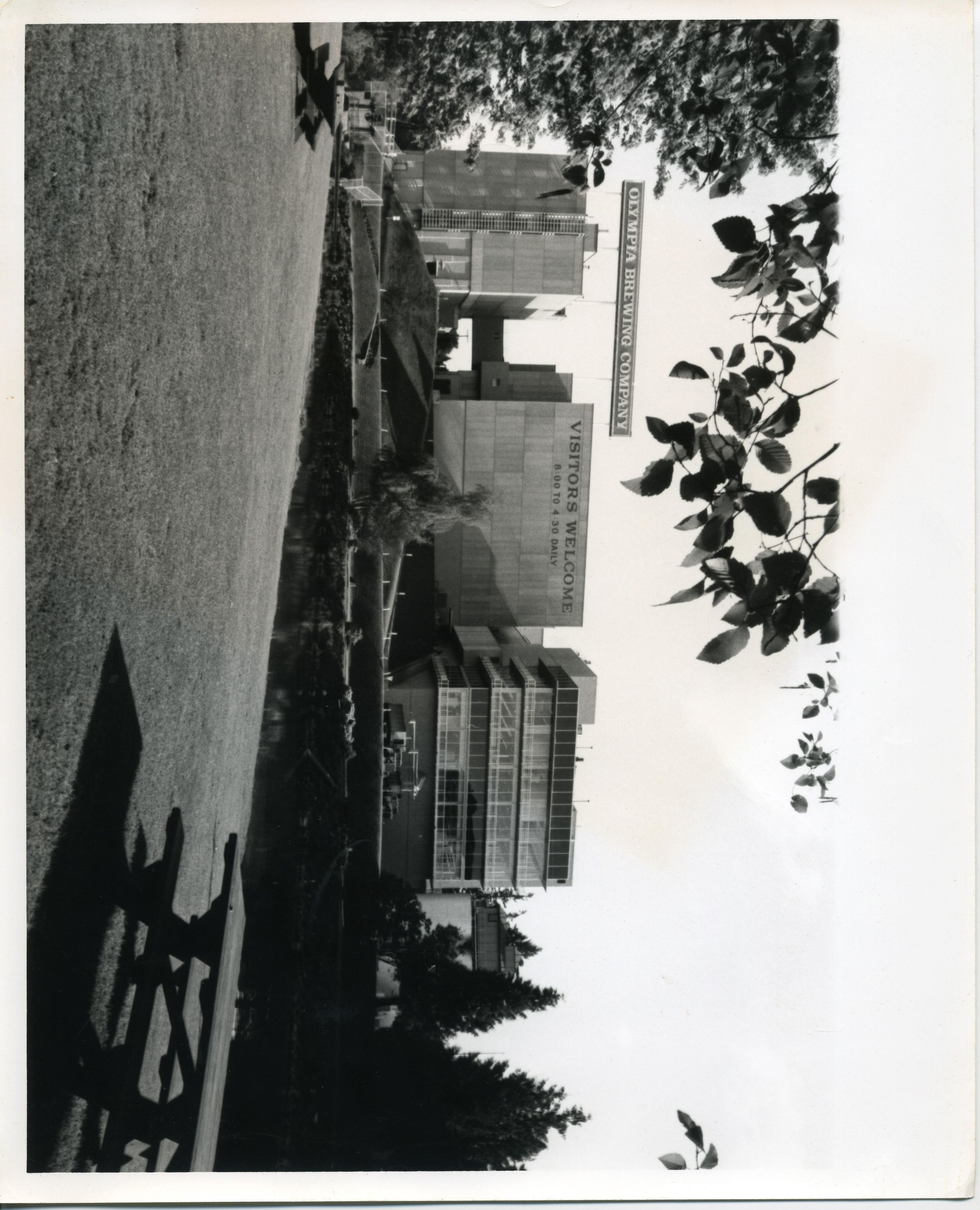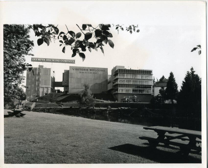 Black and white photo of the Olympia Brewing Company buildings. In the foreground is a lawn and picnic tables. Behind that is water, probably the Deschutes River. To the left and right is foliage and in the background are several of the main buildings of the brewery. There is a sign above the building on the left that says "Olympia Brewing Company" and on the building next to it is "Visitors Welcome 8 00 to 4 30 Daily". Trucks and other vehicles are visible near the building on the right. One or more individuals are visible near the buildings. There is a white border on all sides. There is no information on the back.Made/Created