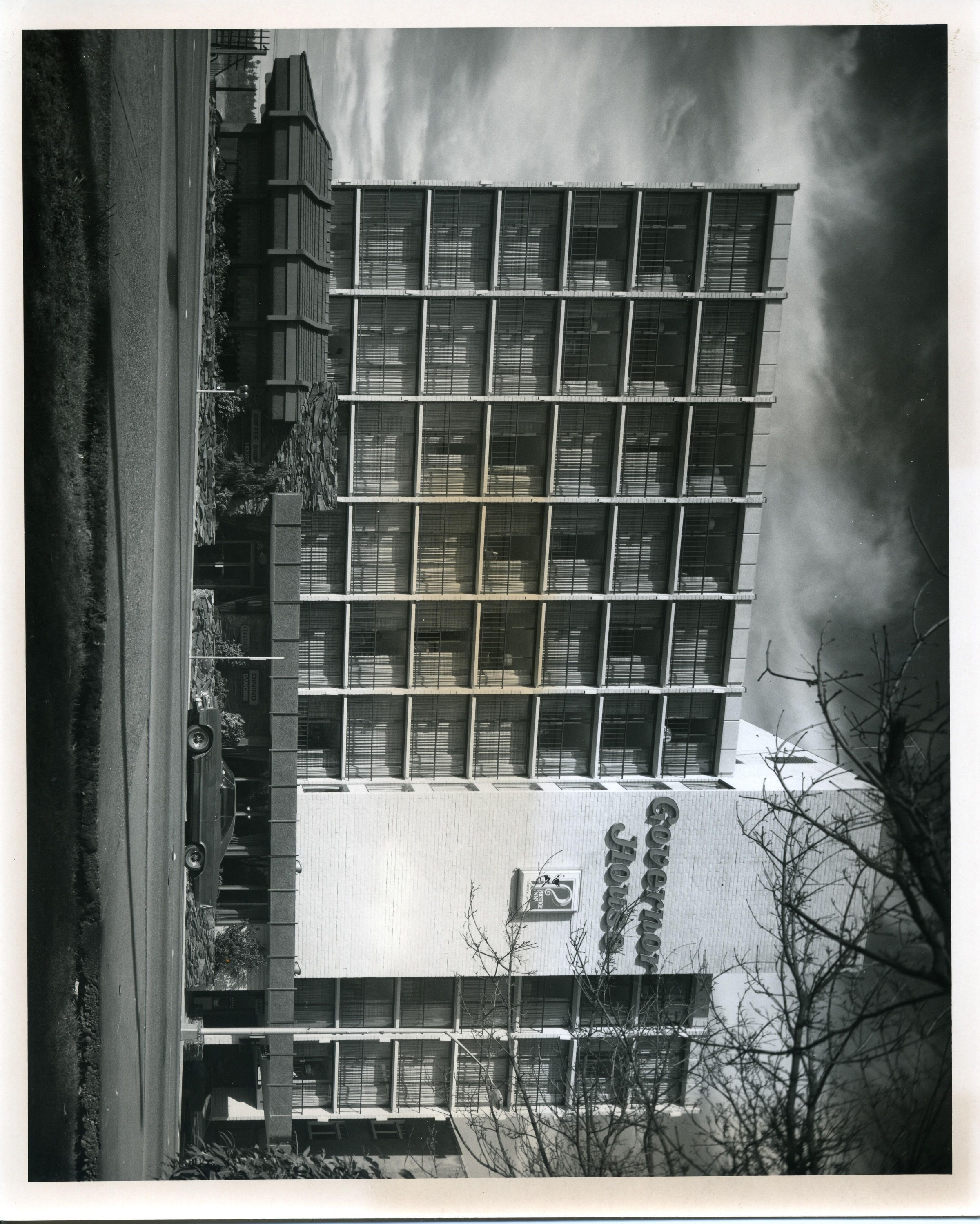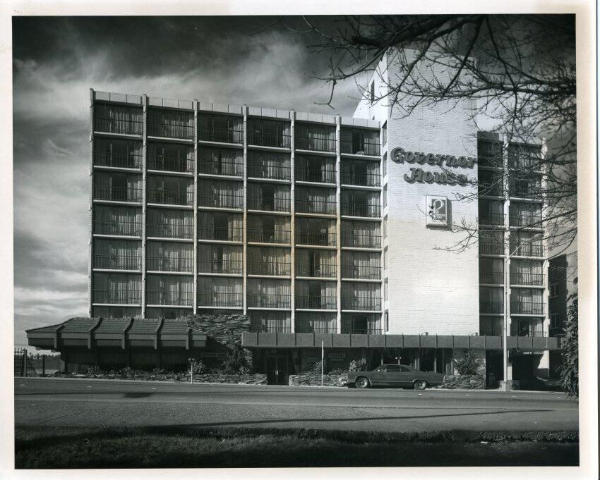 Black and white photo of the Governor House Hotel. In the foreground is a portion of Capital Way and some tree branches on the right. Across the street is a vehicle parked in front of the building, parking meters, a road sign, low stone walls beyond a sidewalk, and awnings. the building itself is mostly a series of square balconies and railings with drapes, some open and some closed. A portion of the building is white in color and appearing to be made up of concrete blocks. The left side of the white portion has windows and upon the main portion are mounted signs that say "Governor House" and a square with a stylized "P" and "Prestige Inns". There are clouds in the background. There is a white border on all sides. On the back in ink is "57%".