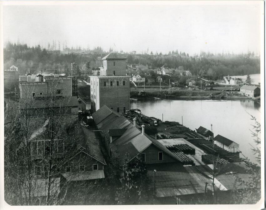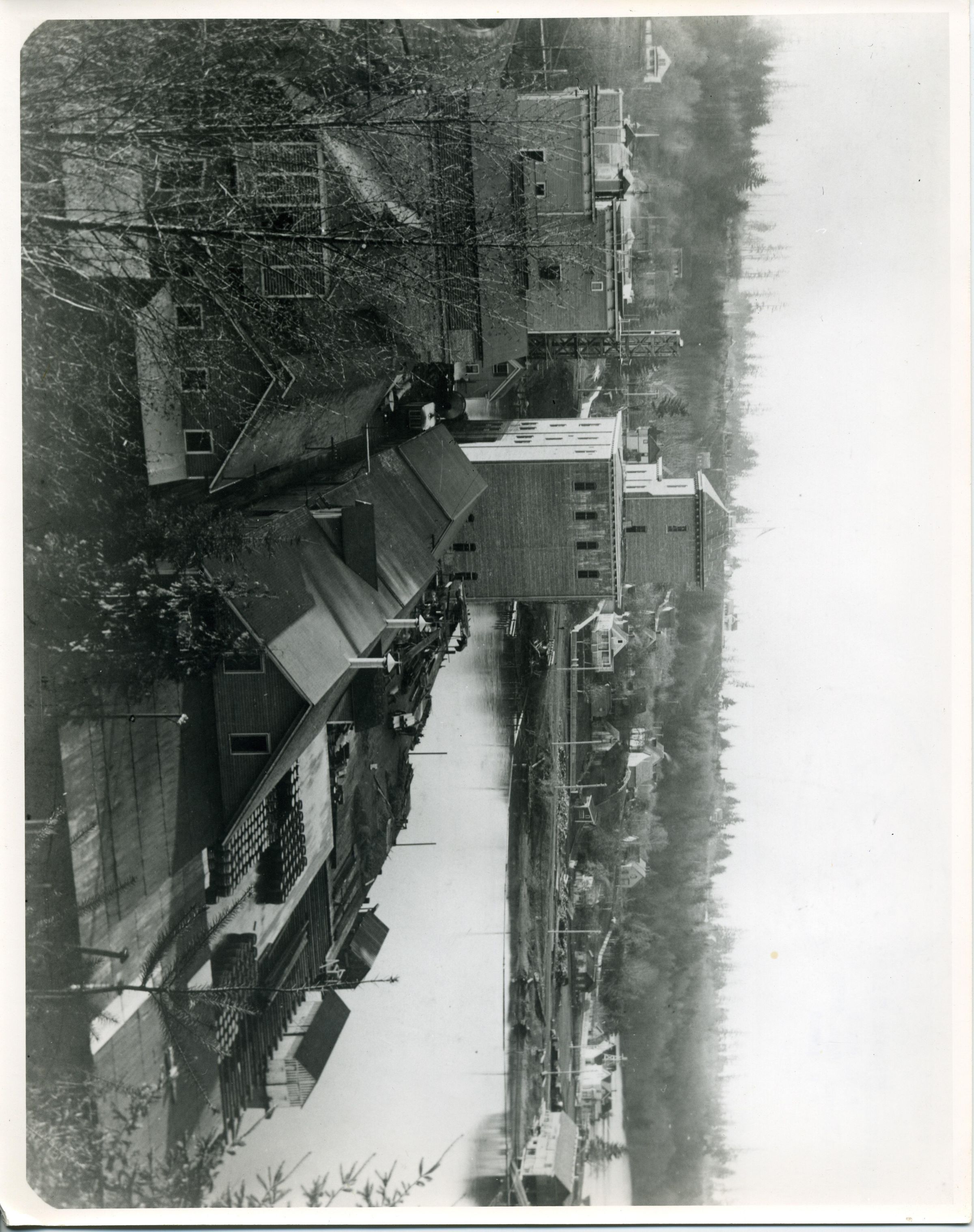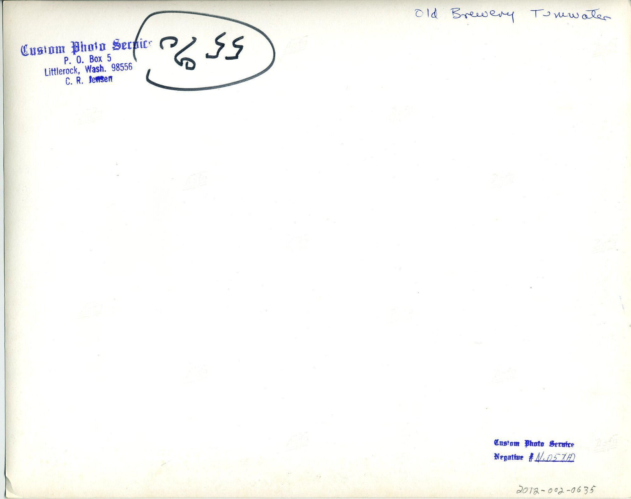 Black and white photo of the old Olympia Brewery. In the foreground are tree branches and houses. To the right is the water of Capital Lake and docks with supplies visible. In the middle distance are two old brick buildings, the one on the right having a tower and metal roof. Further back is a road with street lamps and poles and behind that are houses and trees. Between some of the houses and on the docks are vehicles. There is a white border on all sides. On the back in black felt pen is "55%" in a circle and two stamps in purple ink say "Custom Photo Service P. O. Box 5 Littlerock, Wash. 98556 C. R. Jensen" and "Custom Photo Service Negative # N.057(A)".