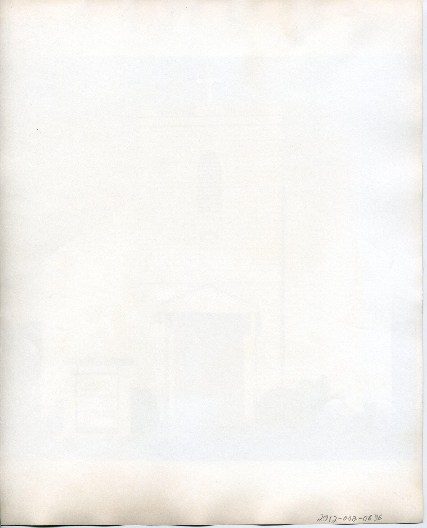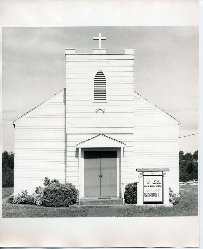 Black and white photo of the Gull Harbor Lutheran Church. The front of the building, facing the camera, is the gable end of the building and has white drop siding, with a rectangular extension in the center that extends above the roof line. At the bottom of the extension is a concrete step under a small porch. There are two doors which are darker and have visible door knobs. There is a mat on the concrete step. Above that is a flood-light assembly, louvers, and at the top are short pedestals with a cross mounted on the center pedestal. To the right of the doors is a reader board, with a short roof and lights, that says "Gull Harbor Lutheran Church Sunday School 10:00 Worship Service 11:00". There is shrubbery on both sides of the doors and a lawn is visible in the foreground. Trees are visible in the background along with a power line. There is a white border on all sides with the top and bottom borders being larger. There is no information on the back.Made/Created