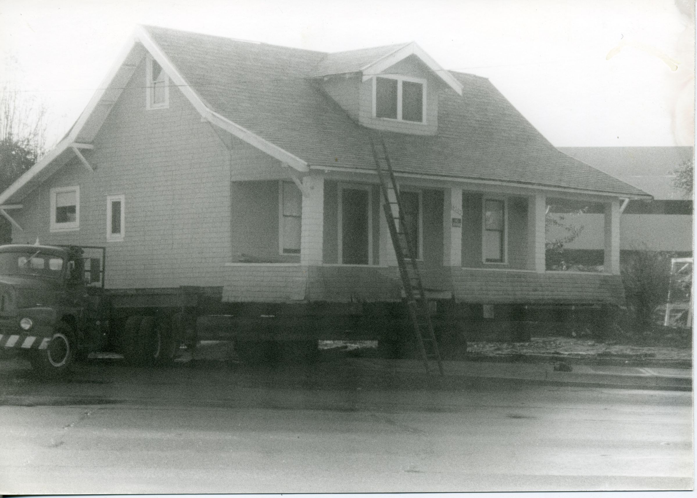 Black and white photo of the Gallagher House being moved. The house is gray with white trim and has a dormer in the roof. The house is sitting on supports used for moving buildings. An extension ladder is leaning on the roof in front of the porch, and a truck is partially visible at the left of the print. There is no border and no information on the back except a repeated statement "This paper manufactured by Kodak".Made/Created