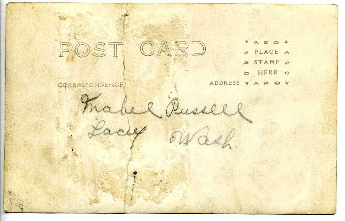 Postcard, Lacey School 2nd grade class photograph for the 1920-1921 school year. A 3 1/2" x 5 1/2" black and white photographic print. 51 students are pictured, 22 girls and 29 boys on the steps of the Lacey School. At the bottom of the photo, near the center is written in white: "No 3750". Pictured in this photo are the following students, beginning in the front row, left to right: Tessa Ross, Fred Daly, Donald Naismith, unknown student, _____ Brooks, Catherine Miller, Louise Koehler, Rose Nichols, Violet Larson, Bessie Yates, Iona Easton, unknown student, and Helen Huntamer. In the second row: Unknown student, Bertha Muzatko, Marie Dow, unknown student, May Gillis, Edith Ball, Anna Danell, Eva Schuffert and an unknown student. In the third row: Two unknown students, Margarate Reinhart, Linnea Peterson, Clarence Reaves, Phoevie Greenman, Mabel Russell, two unknown students, Herman Hannge, and John Lockwood. In the fourth row: Two unknown students, Theodor ______, Melvin Heusman, Albert Bowker, Clarence Robbins, unknown student, Bill Kohten and Harrison Travis. In the fifth, or back, row: Three unknown students, Harold Skinner, Eroll Mattson, Clifford Radcliff, Elvin Reeves, Alex Muzatko, Alvin Smith and an unknown student. On the reverse is a pre-printed postcard with the words "POST CARD" at top left and below in smaller letters: "CORRESPONDENCE" at the left and "ADDRESS" at the right. In the upper right corner is a square which inside reads: "PLACE STAMP HERE" and the stamp area border is created by the word "AZO" with triangles stamped in the corner. Handwritten in pencil in the center are: "Mabel Russell Lacey Wash." in cursive.