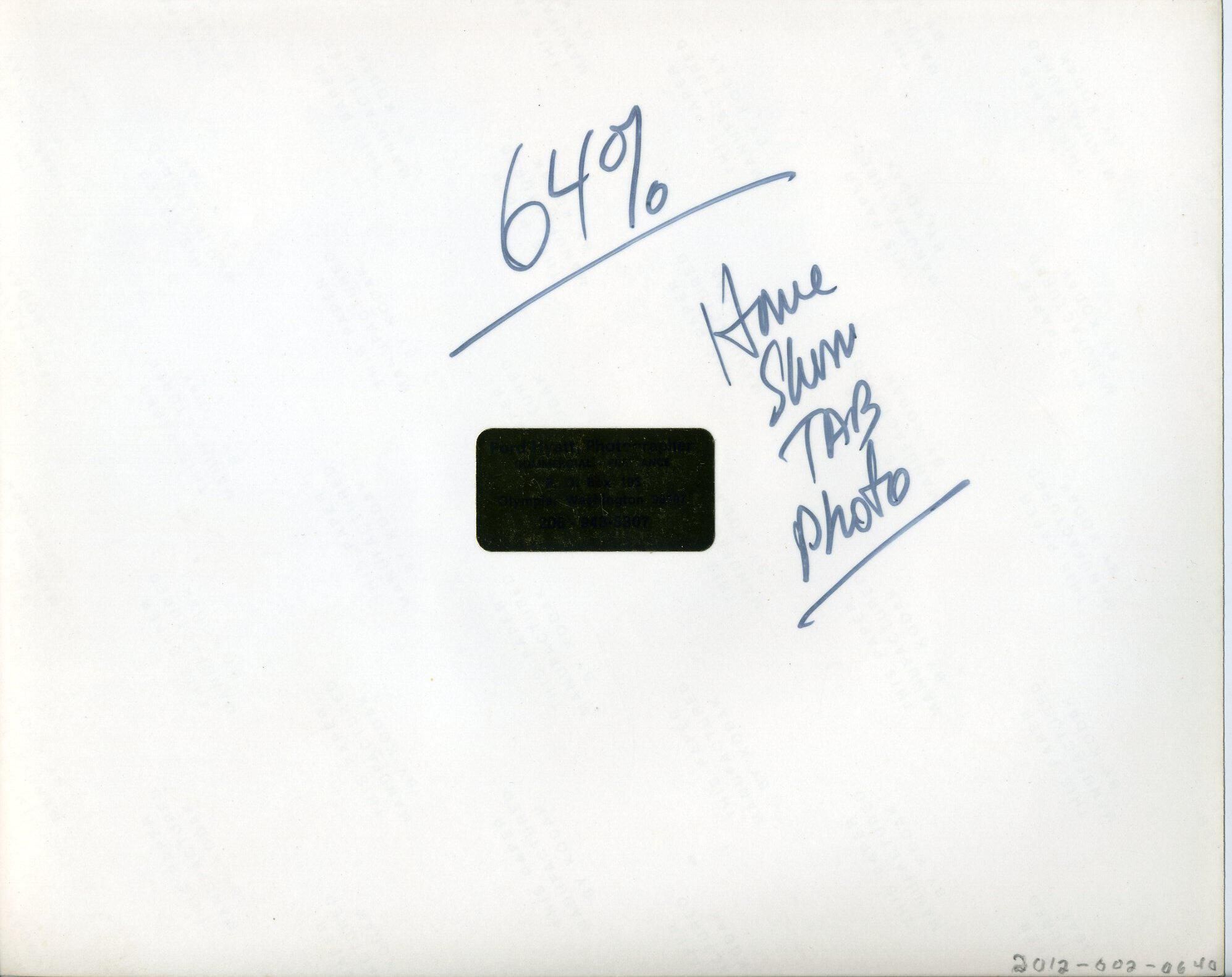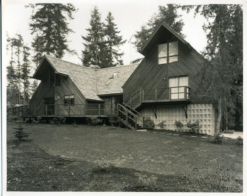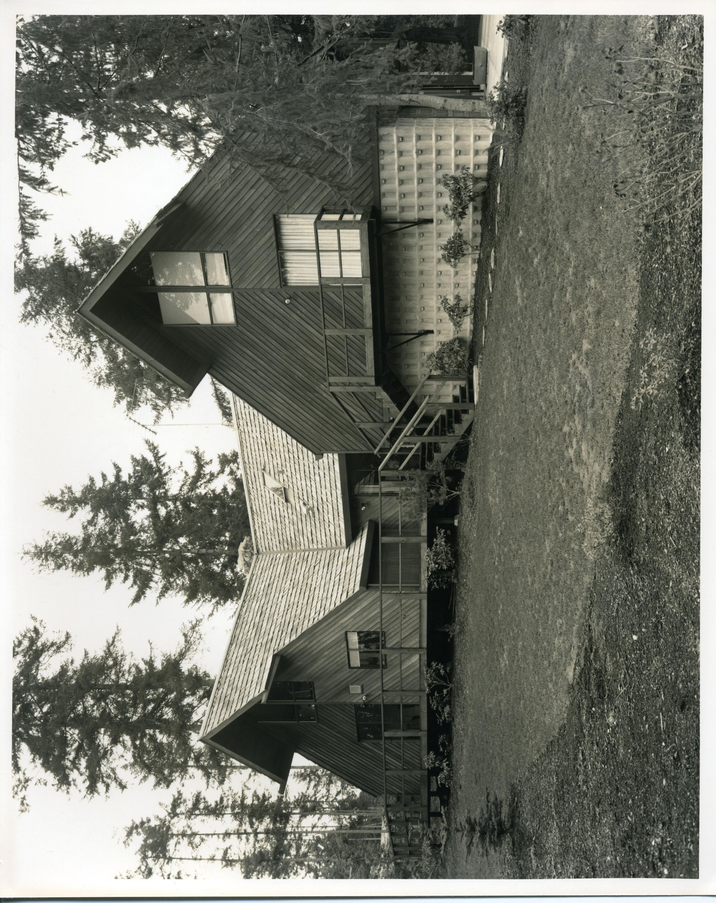 Black and white photo of a large house. It consists of two A-frame portions connected by a perpendicular section. The foreground has what appears to be gravel and lawn with a small Evergreen at the left of the image. The front of the house has porches with railings, stairs, and stepping stones, as well as a light-colored tile portion that seems to be the side of a garage. The face of the house has siding boards at a 45 degree angle and windows and sliding doors with curtains visible. The roof is covered with shakes and has a sky-light and a TV antenna. Behind the house are fir trees. There is a white border on all sides. On the back in blue felt pen is "64% House Stum Tab Photo" and a gold-colored sticker that has printed on it "Ford Hyatt, Photographer Commercial - Free Lance P. O. Box 193 Olympia, Washington 98507 206-943-5307".