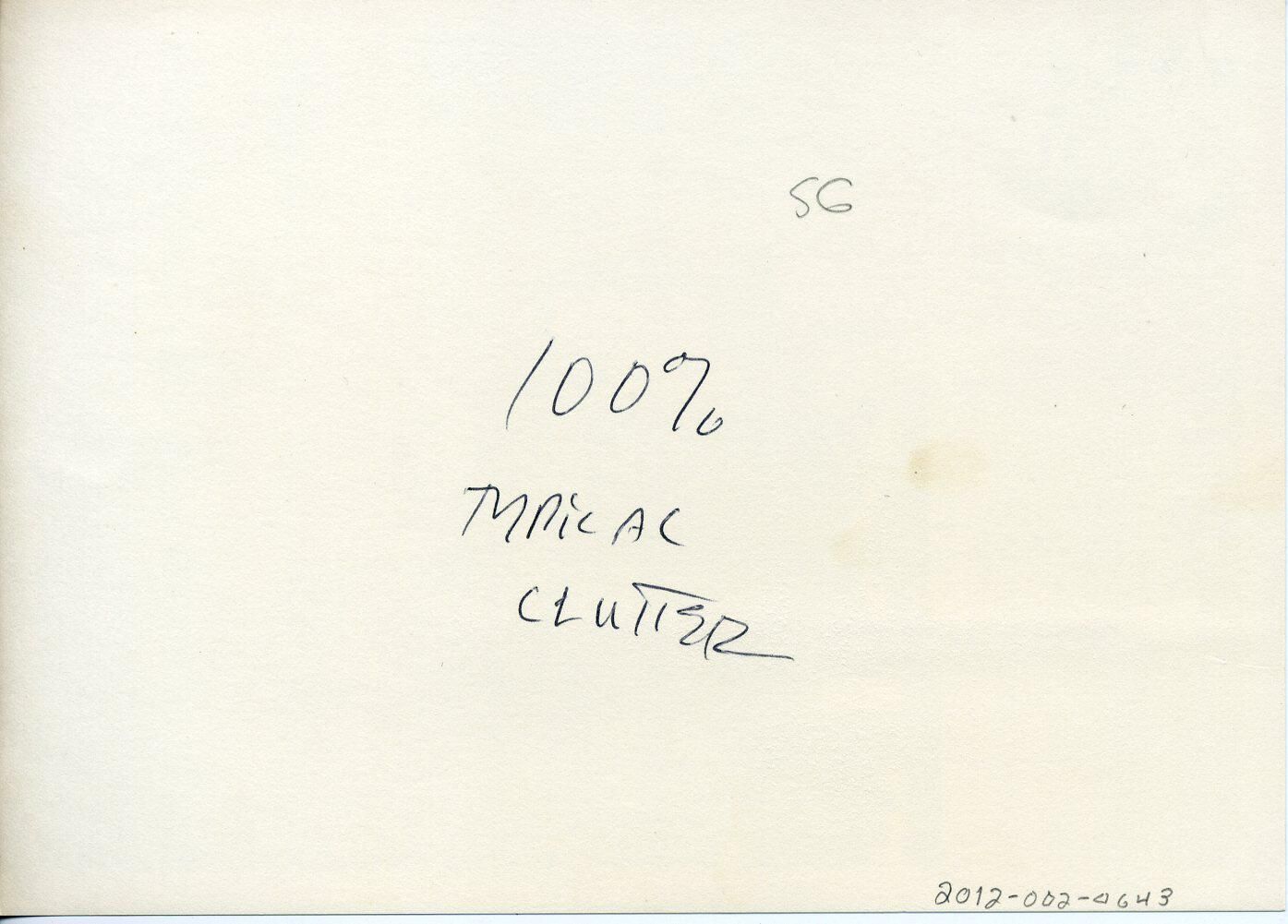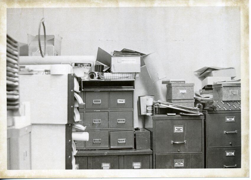Black and white photo of metal file cabinets and other items. Because of this print's placement in relation to other images, it is presumed to be inside the old Thurston County Courthouse. The metal cabinets are of varying sizes and on top of them is a clutter of items such as file boxes, boards with wire prongs, wire baskets, loose papers, containers, and rolled documents. At the left is a stand with papers extending out of various shelves. A rack for book forms is at the very left. A ring is hanging near the left top of the print. There is a white border on all sides. On the back in ink is "SC" and "100% Typical Clutter".