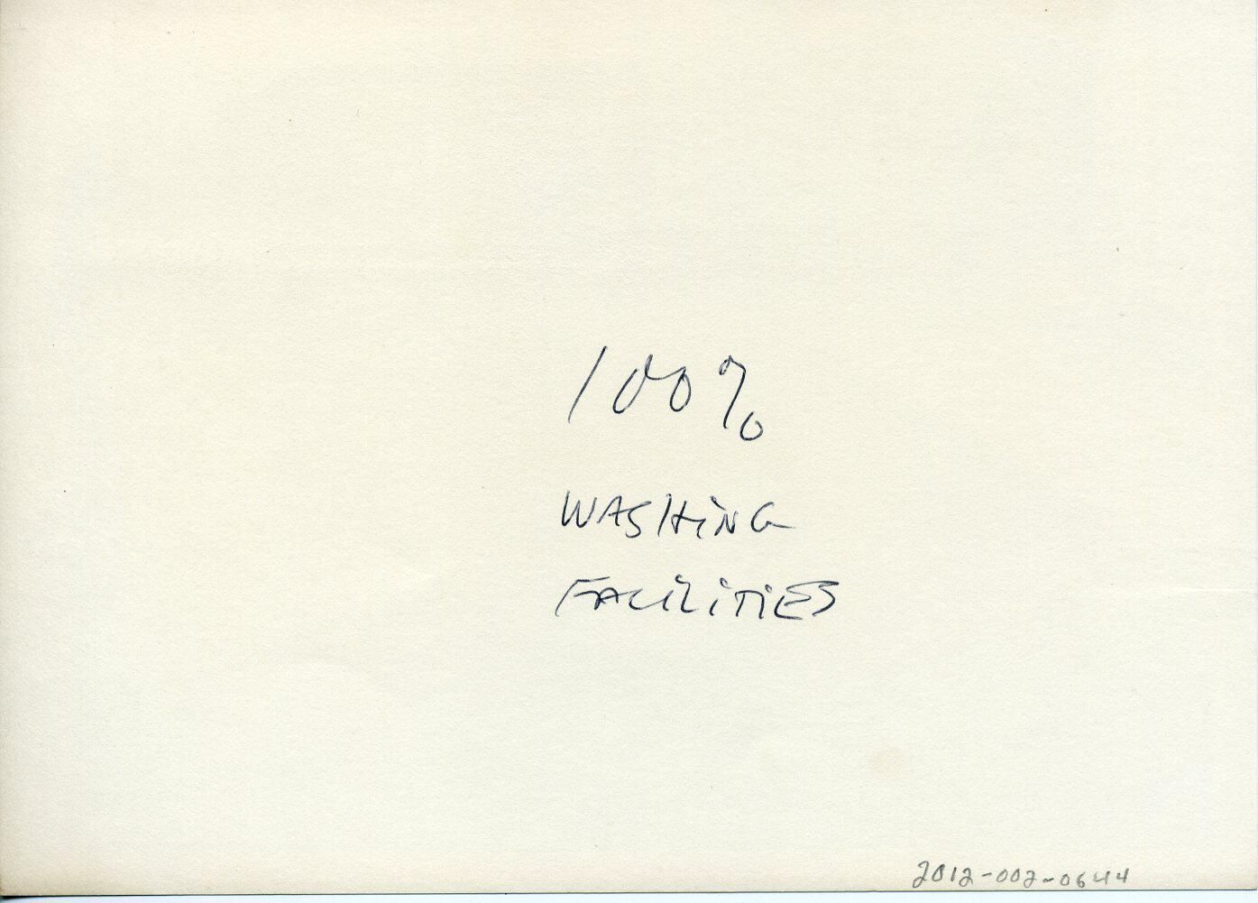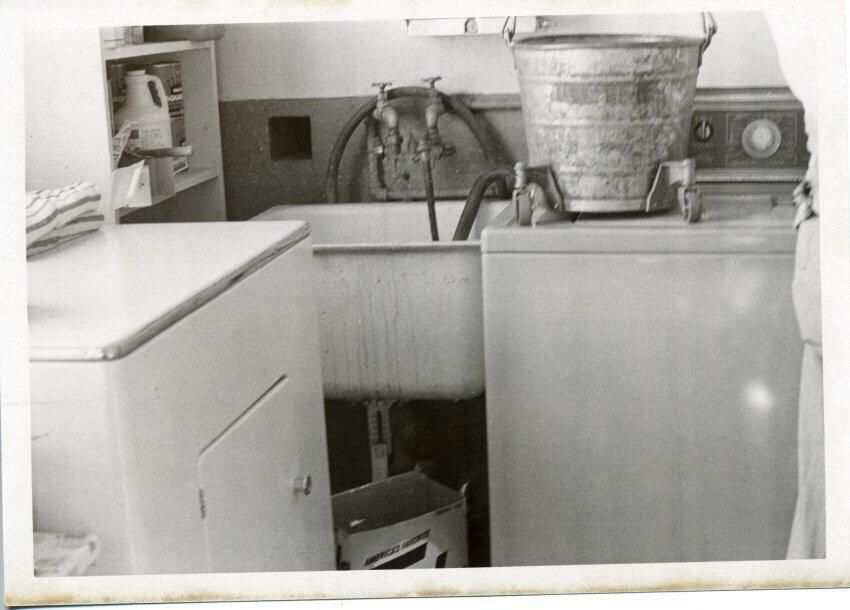 Black and white photo of washing machines, tubs, buckets, etc. Because of this print's placement in relation to other images, it is presumed to be inside the old Thurston County Courthouse. It appears that there is a dryer at the left of the image and a washer on the right. There is a sink with faucets and hoses, a bucket, and containers on a shelf. At the bottom of the image is a box. There is a white border on all sides. On the back in ink is "100% Washing Facilities".