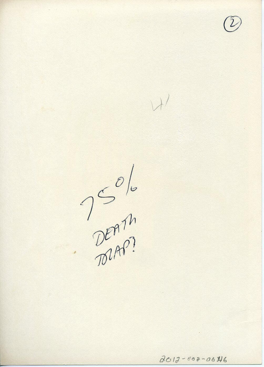 Black and white photo of stairs and railings. Because of this print's placement in relation to other images, it is presumed to be inside the old Thurston County Courthouse. The photo looks down a stair well and metal railings are visible beginning in the foreground and proceeding (down) to the center and to the left. The steps are of concrete and at the bottom of the stair well a door is visible. There is a white border on all sides. On the back in ink is "75% Death Trap?" and "2" in a circle.