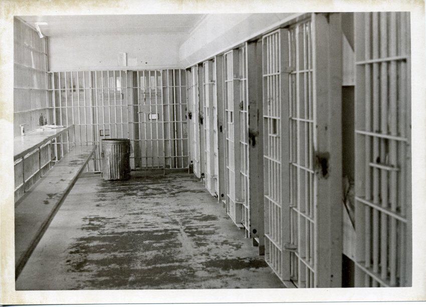 Black and white photo the barred doors of jail cells. Because of this print's placement in relation to other images, it is presumed to be inside the old Thurston County Courthouse. In the center of the image is an open area with a concrete floor and a counter and bench at the left and a metal can such as a trash can.. On the right and at the far end are the barred cell doors. There is a white border on all sides. On the back in ink is "100%" and in pencil "SC".