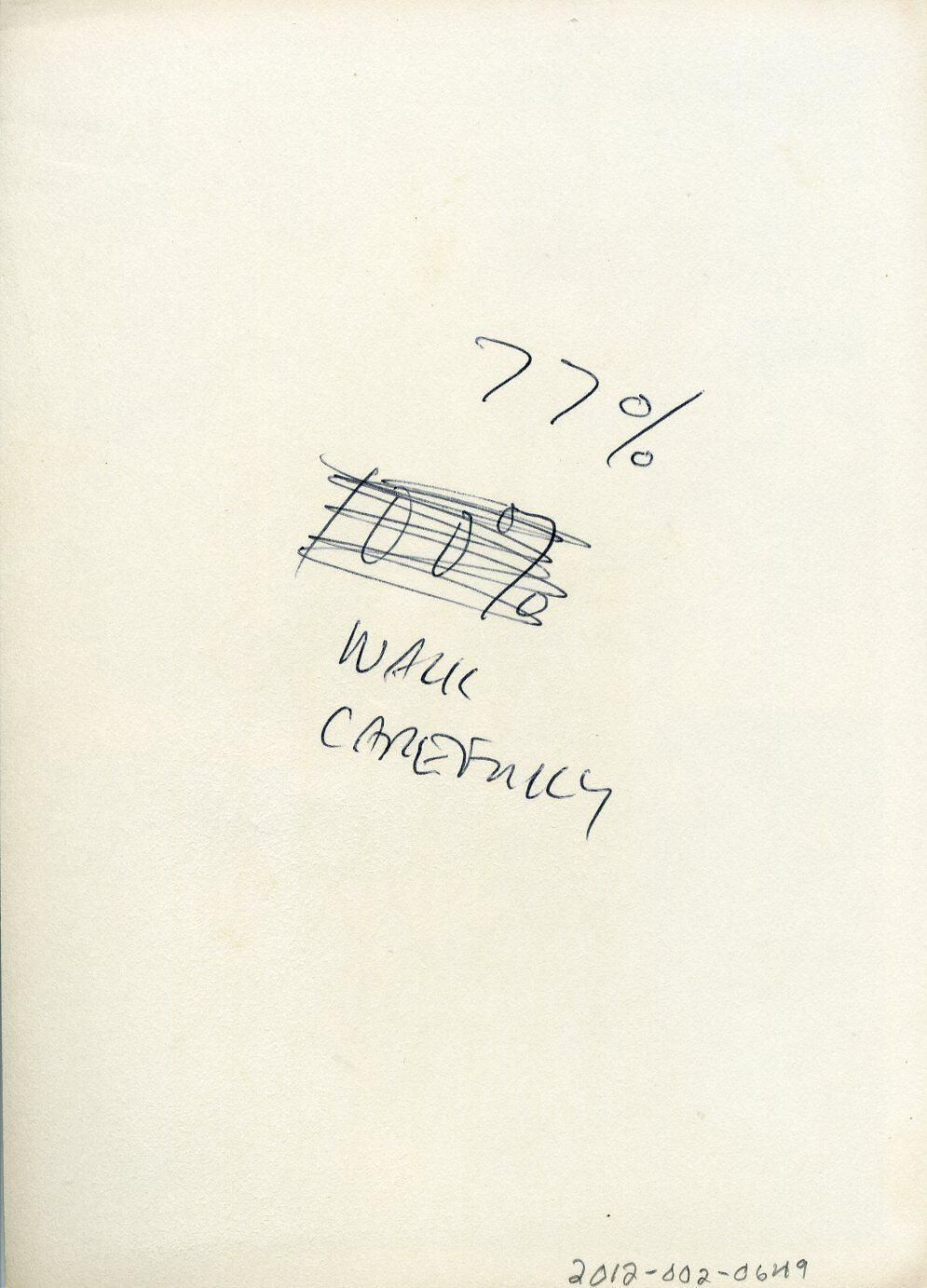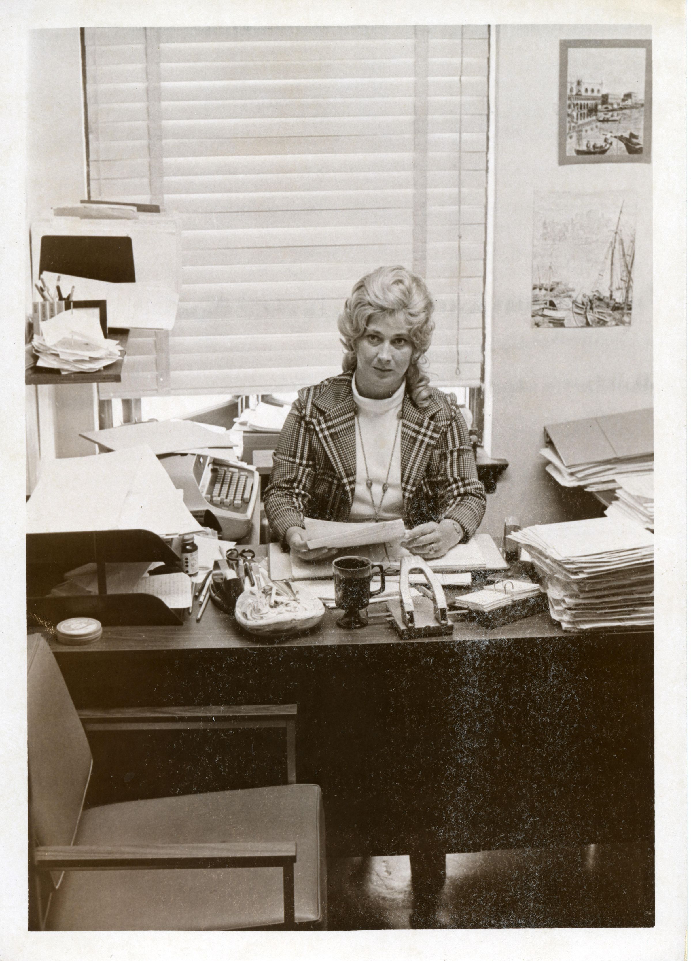 Black and white photo of a woman sitting at a desk facing the camera. In the foreground is a visitor's chair in front of the desk. On the desk are papers, an in-out frame with papers, a punch, a coffee mug, a desk calendar, pencils, and a blotter. The woman has light colored hair and is wearing a plaid jacket over a white turtle neck sweater. She has a necklace and is holding papers. To her right is an electric typewriter and above it is a shelf with papers and files. To her left is a table with papers and a notebook. In the background is a wall with blinds over a window and two pictures. There is a white border on all sides. It is believed that this photo was taken in the old Thurston County courthouse. On the back in ink is "77%" and "100%" crossed out. Also in ink is "walk carefully".