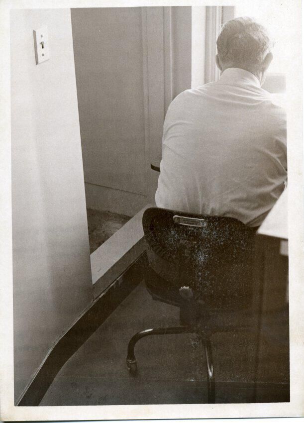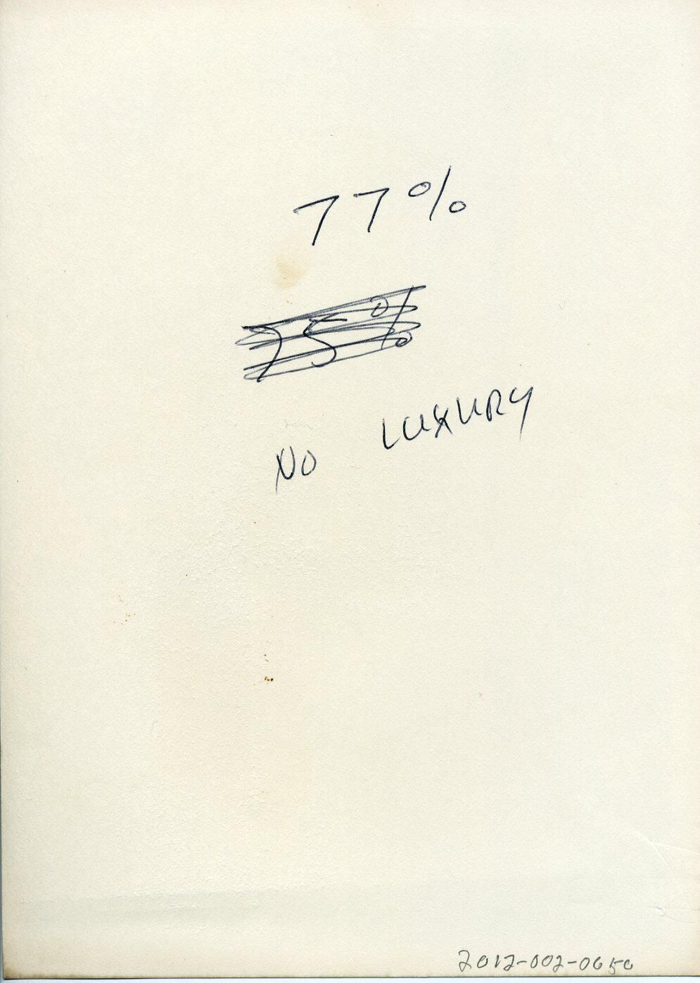 Black and white photo of the back of a man sitting in a chair. Only the back of the man is visible. He has short dark hair and is wearing a white shirt. The chair he is sitting in has tubular legs with casters. On the back of the chair is a metal label frame and a knob for adjustments. At the right of the image is a portion of a table and at the left is a wall with a light switch and an opening like a doorway. The opening, however, does not extend to the floor, and the impression it gives is like an opening for a shower stall. There does seem to be a plastic curtain at one side of the opening. There is a white border on all sides. On the back in ink is "77%" and "75%" crossed out. Also in ink is "no luxury".