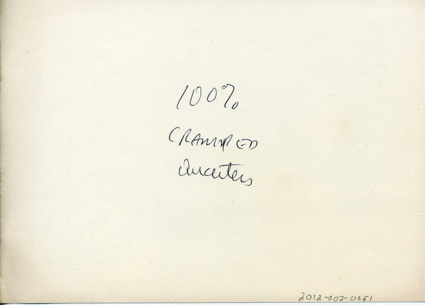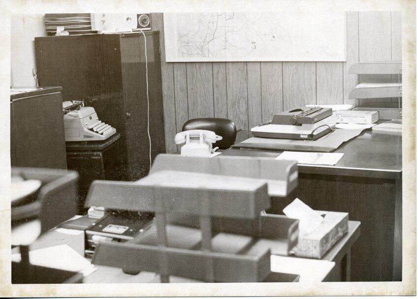 Black and white photo of desks. In the foreground is part of a desk with a three level paper bin. Also on the desk are various items including what appears to be a box of tissues. Behind that desk is another desk with a blotter, an electric typewriter, and a telephone. Other items are on the desk including a three-level paper bin. Part of a chair is visible and at the left of the image is file cabinets with another typewriter and a large metal object that may be a safe. On top of that item is a small radio with the cord running down to the floor. In the background is a wall with panelling and a map. There is a white border on all sides. On the back in ink is "100% cramped quarters".