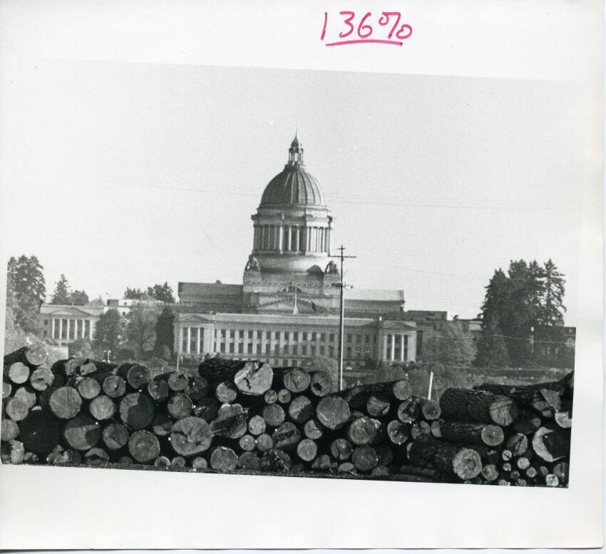 Black and white photo of the Washington State Legislative Building. In the very foreground is a stack of firewood. Further back is a telephone pole and some trees. Other state buildings are visible in front of or around the Legislative Building, such as the Temple of Justice, the Insurance Building, and the Governor's Mansion. The white border is larger at the top and bottom but is crooked and smaller at the sides. In the top border in red ink is "136%". There is no information on the back.