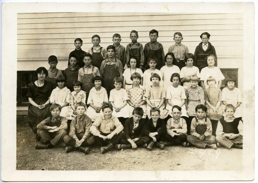 Pictured in this photo are the following students, beginning in the front row, left to right: Four unknown students, Harold Yates and Frank Daley. In the second row: Miss Mildred Nuttall, an unknown student, Ruth Heusman, Marie Hartman, four unknown students, Hilder Larson, an unknown student, and Elsie Huntamer. In the third row: an unknown student, Clarence Robbins, Clifford Radcliff, four unknown students, Viola Larson, and an unknown student. In the fourth/back row: four unknown students, Herman Hangge, Bill Cohton and an unknown student.