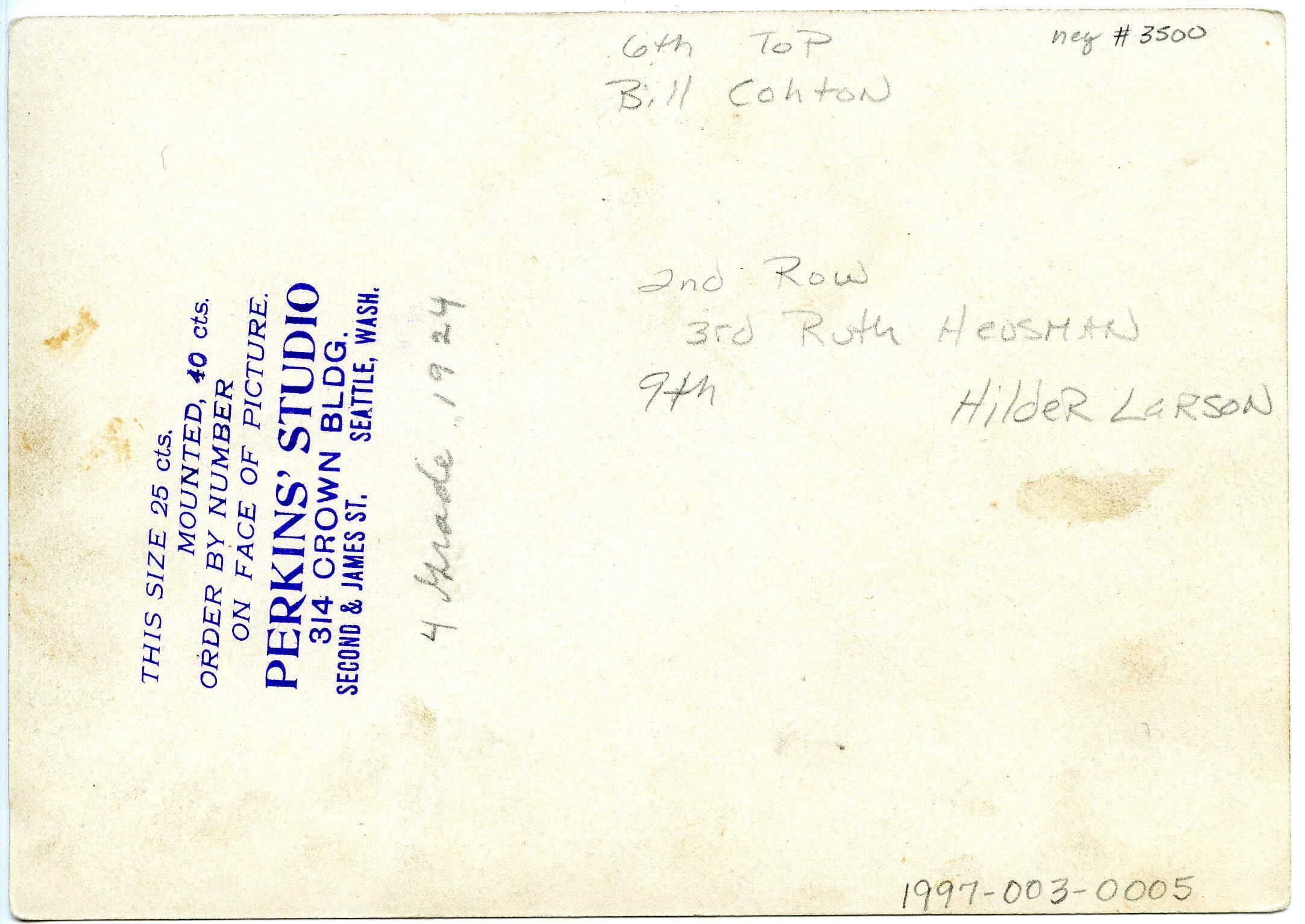 On the reverse in the upper right corner is written in pencil: "neg #3500" presumably by museum staff. On the top edge center, written in pencil is: "6th top Bill Cohton" In the center is the note: "2nd Row, 3rd Ruth Heusman, 9th Hilder Larson." A blue ink stamp vertically reads: "This size 25 cts. Mounted, 40 cts. Order by number on face of picture. Perkins' Studio, 314 Crown Bldg. Second & James St. Seattle, Wash."Made/Created