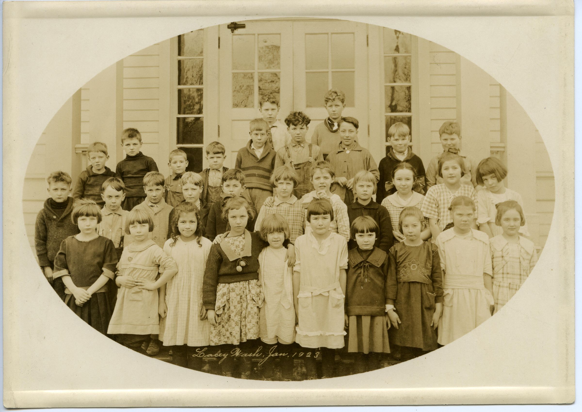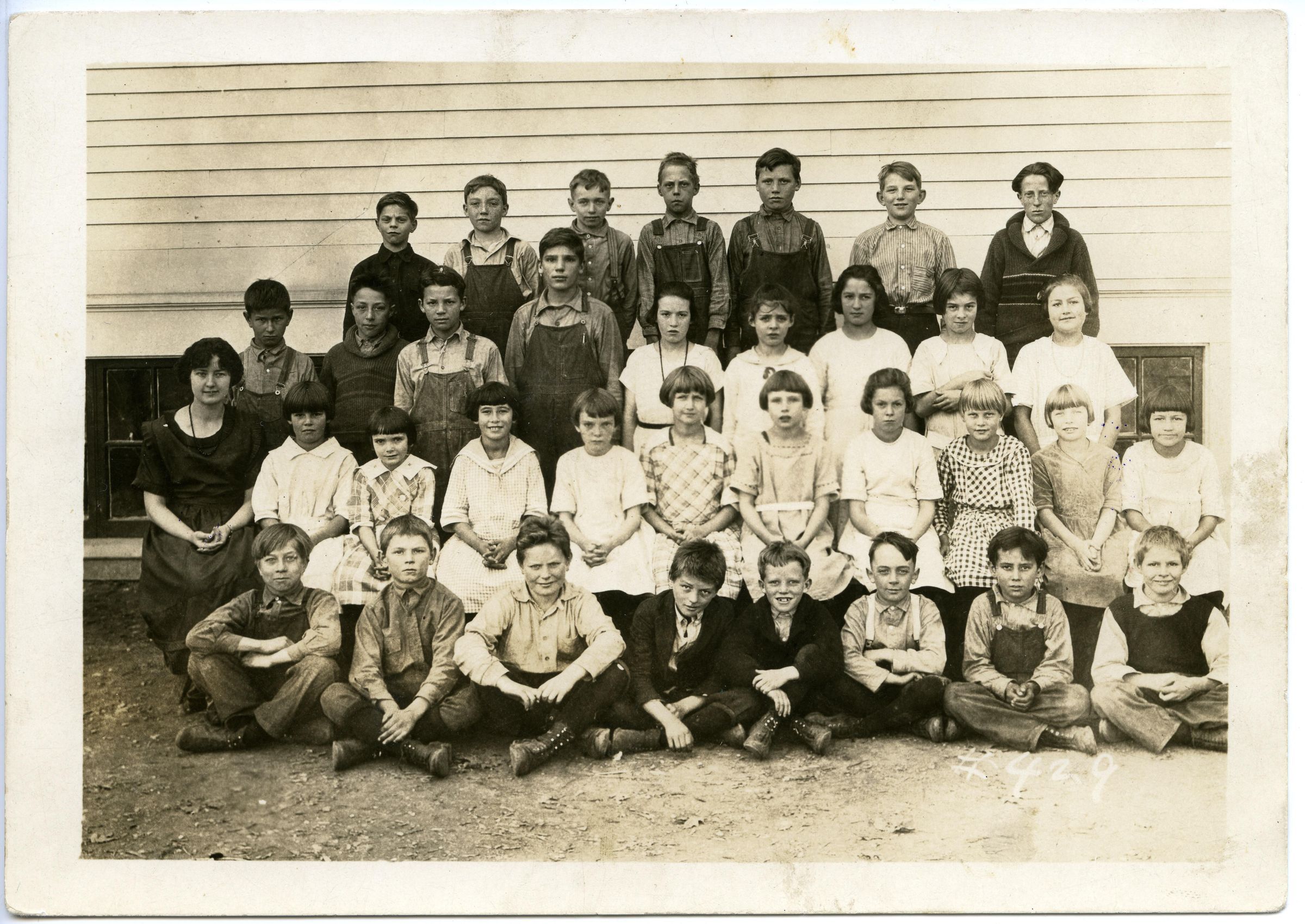 Lacey School 4th grade class from the 1923-1924 school year depicted in a brown-toned black and white 5" x 7"photograph. There is a border around the image. There are 35 people pictured; 34 students and one teacher. The front row is comprised of eight boys, the second row includes the teacher and ten girls, the third row four boys and five girls and the back row has seven boys. The group is pictured outside on the side of the Lacey School. Students in the front row are sitting cross-legged on the ground, those in the second row are sitting on a bench and the remainder are standing. The back row appears to be standing on a raised surface, possibly a bench.
