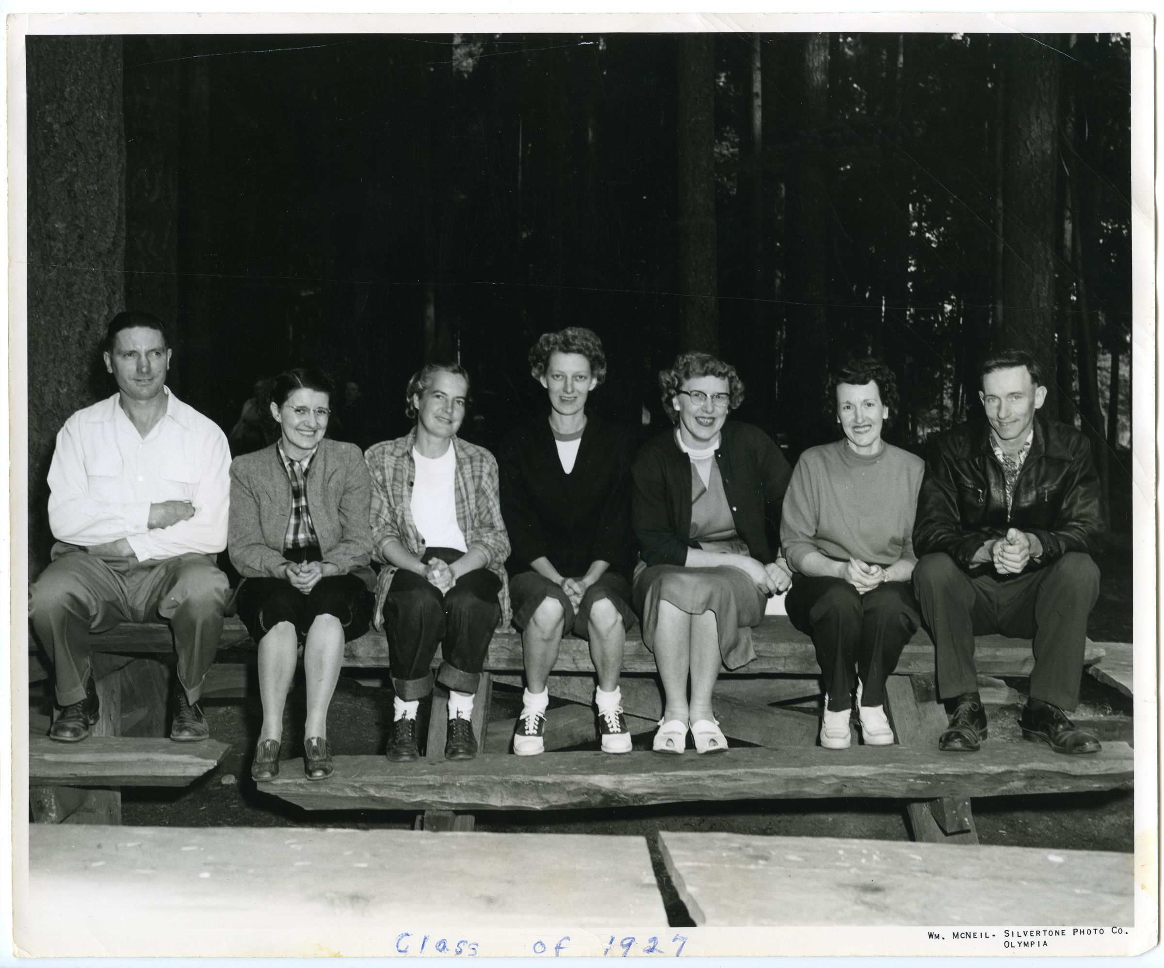 Lacey School 8th grade class of 1927 reunion depicted in a black and white 8" x 10" photograph. There is a small border around the image. There are seven people pictured, five women and two men. The group is pictured outside, sitting on benches with their feet on benches in front of them. There is a forest of trees behind them. Judging by their age, hair and clothes, the photo was probably taken in the 40s or early 50s. Written in pen at the bottom center is: "Class of 1927". Printed at right is: "Wm. McNeil - Silvertone Photo Co. Olympia."
