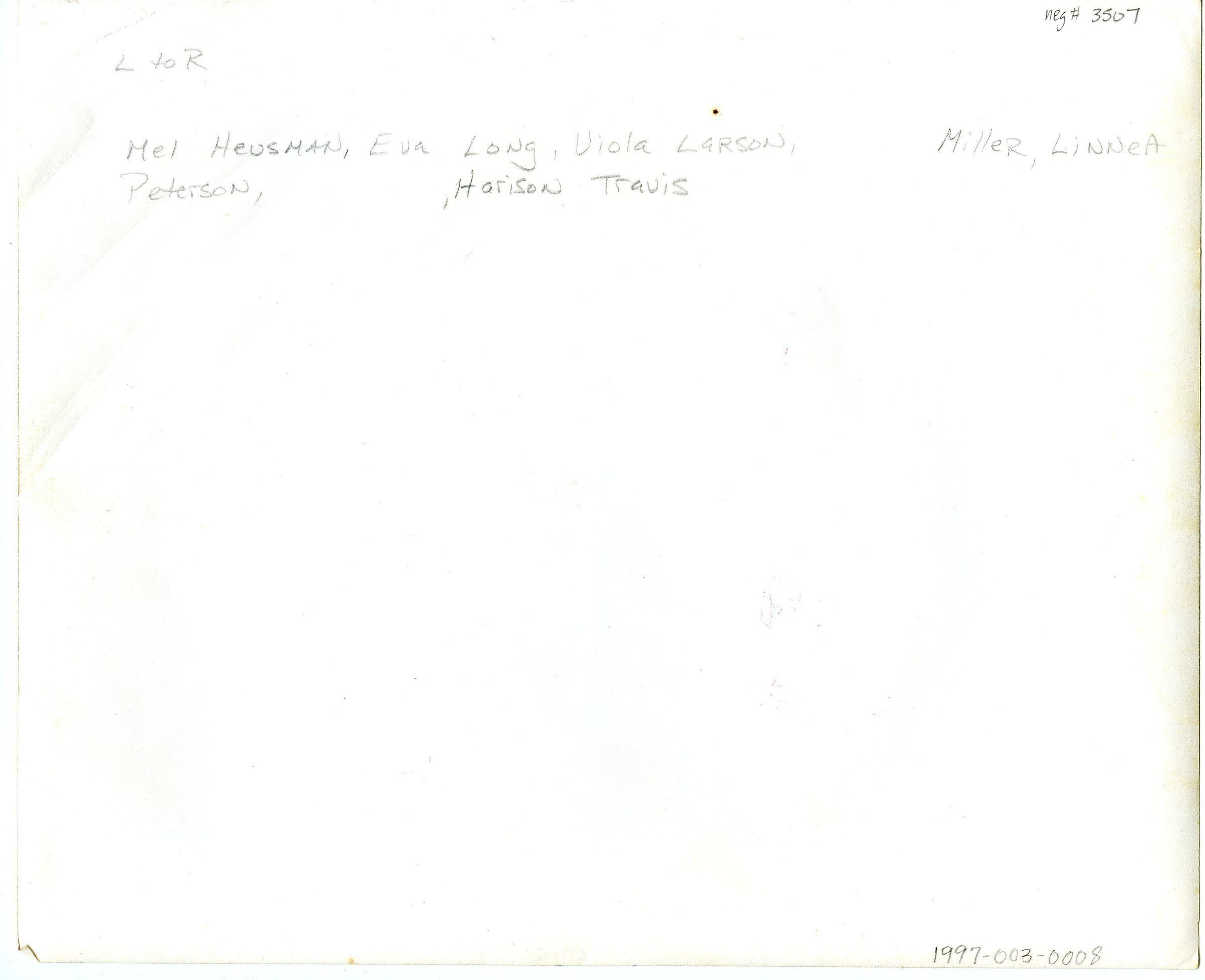 On the reverse in the upper right corner is written in pencil: "neg #3507". Near the top is written: "L to R Mel Heusman, Eva Long, Viola Larson, _____ Miller, Linnea Peterson, ______, Harison Travis." All inscriptions are written by museum staff.Made/Created