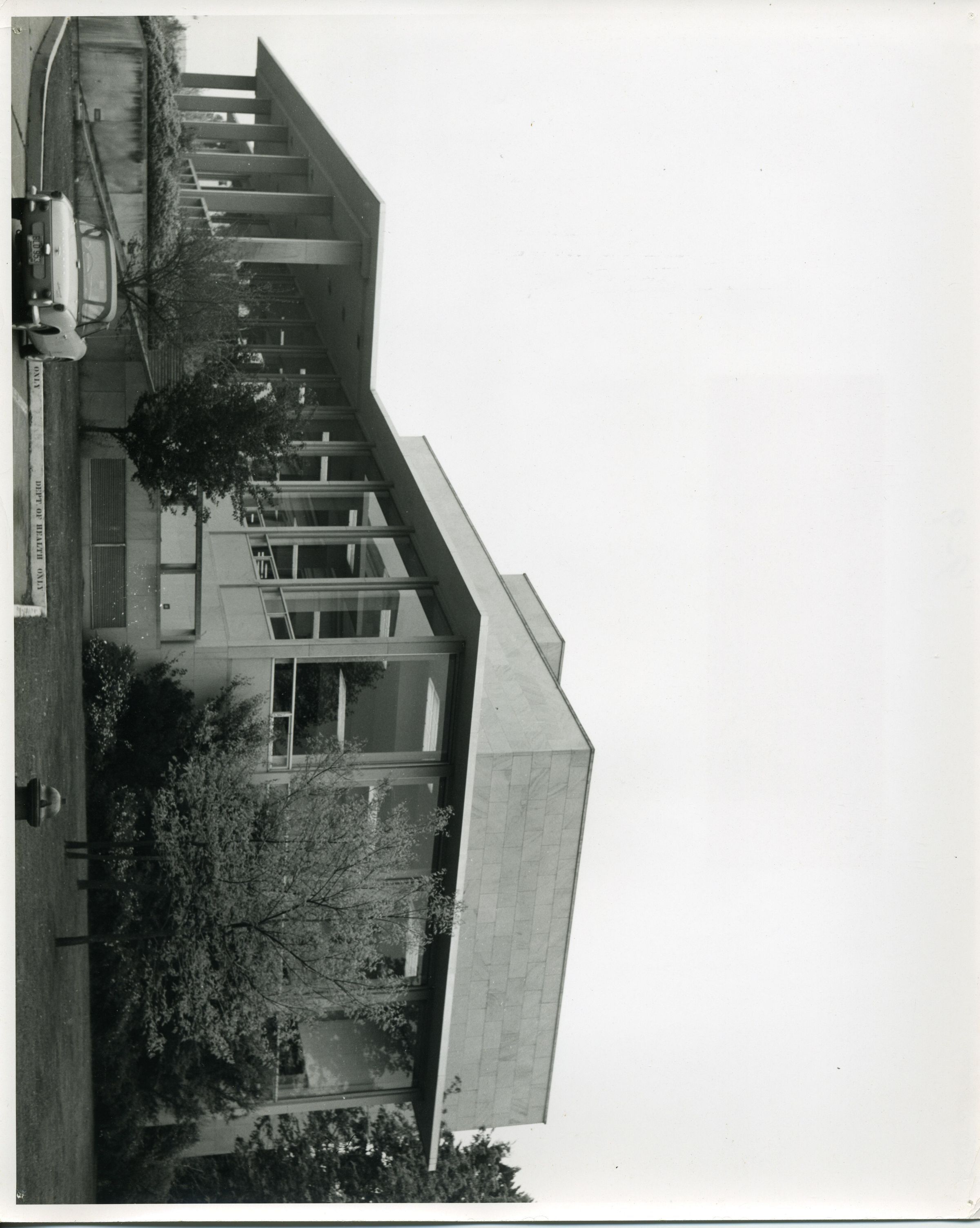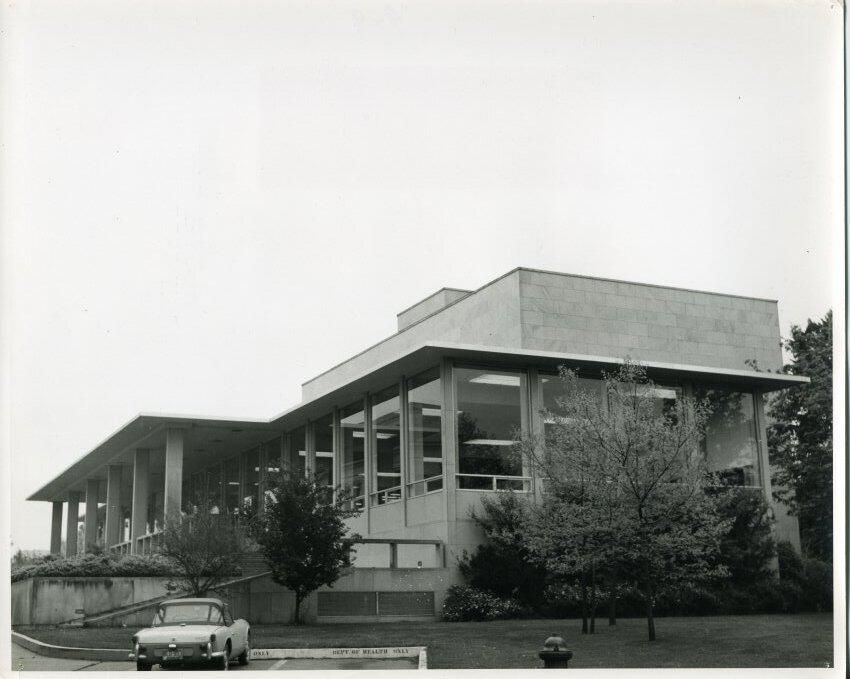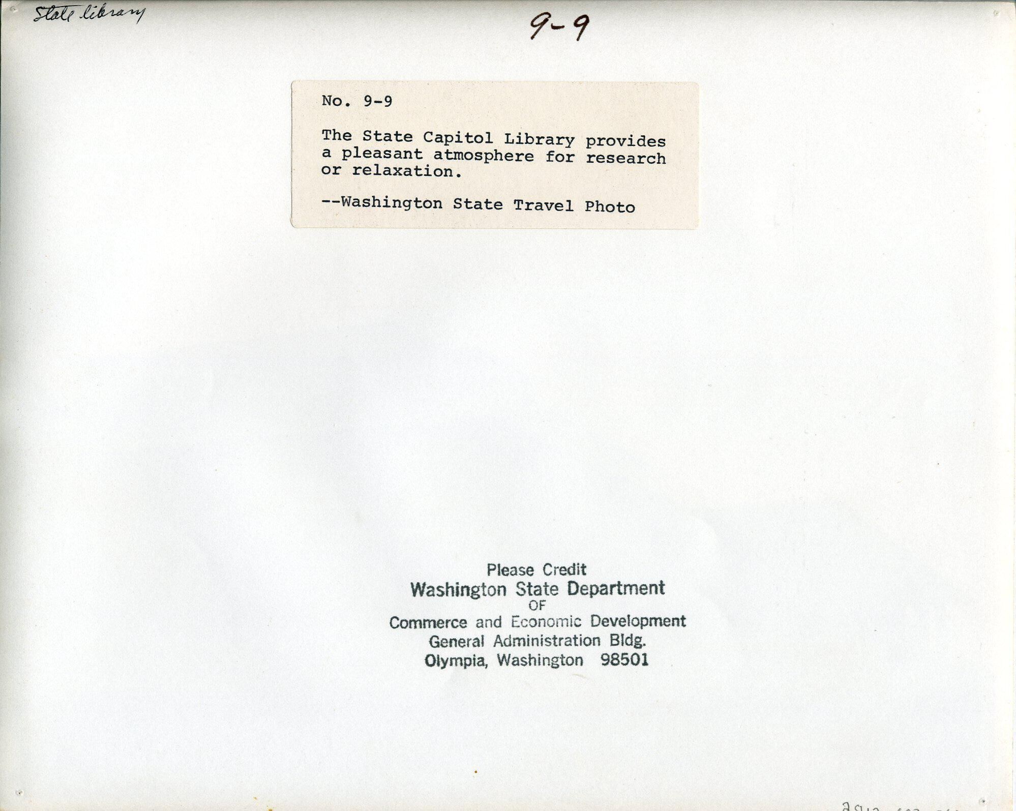 Black and white photo of the Washington State Library building. The building is built of stone blocks and has large windows visible on the side and front. Above the window level is additional stories without windows. In the foreground is a ramp and railing, next to a concrete retaining wall, leading to a porch, which to the left of the image is covered by a roof supported by stone columns. In the foreground is a lawn, a fireplug, and trees and shrubs. At the left foreground is a parking area with one vehicle and painted on the curb is "Dept of Health Only". There is a white border on all sides. On the back on a pasted-on paper is typed "No. 9-9 The State Capitol Library provides a pleasant atmosphere for research or relaxation. Washington State Travel Photo". A stamp in black ink says "Please Credit Washington State Department of Commerce and Economic Development General Administration Bldg. Olympia, Washington 98501". In ink is written "state library" and "9-9".Made/Created