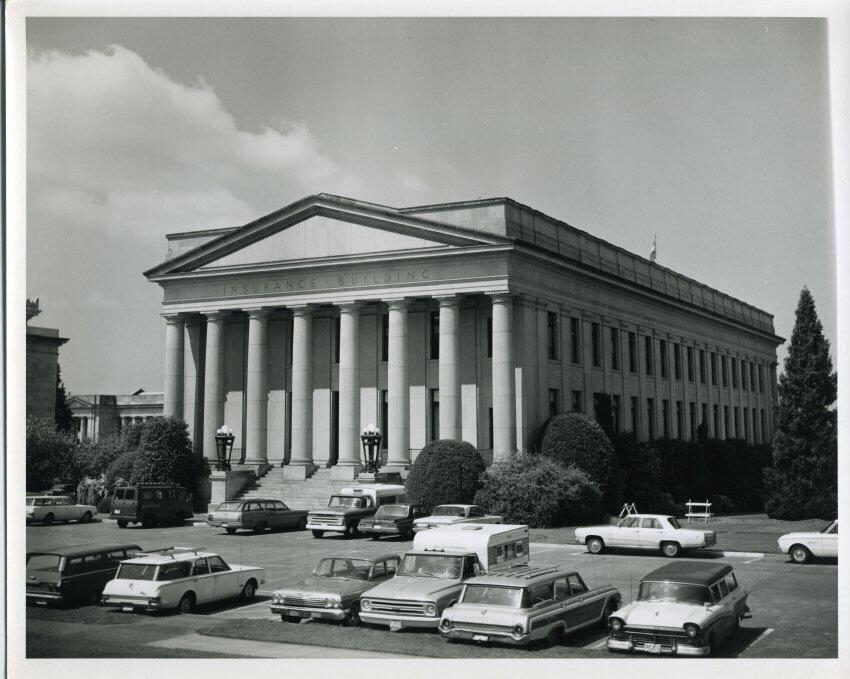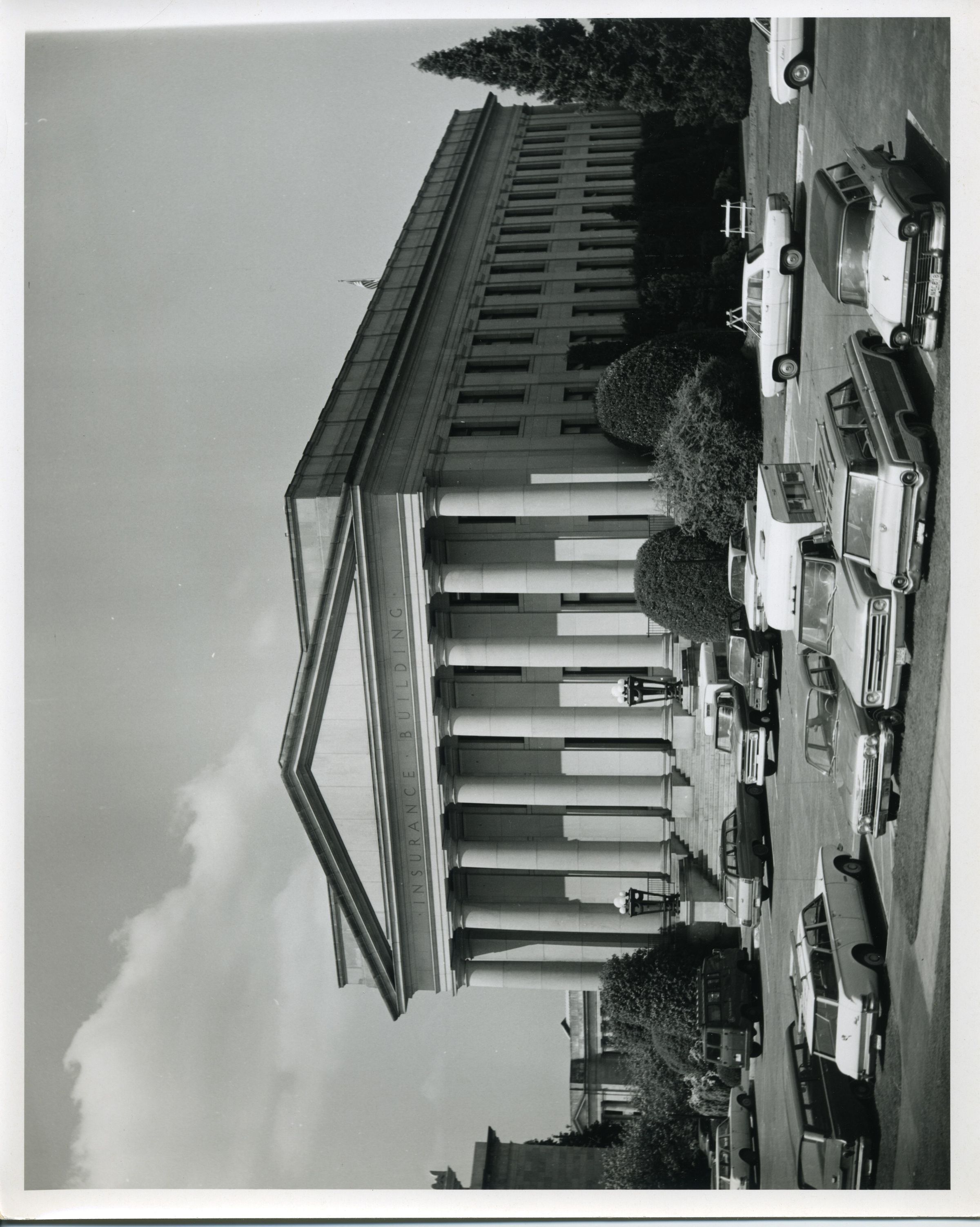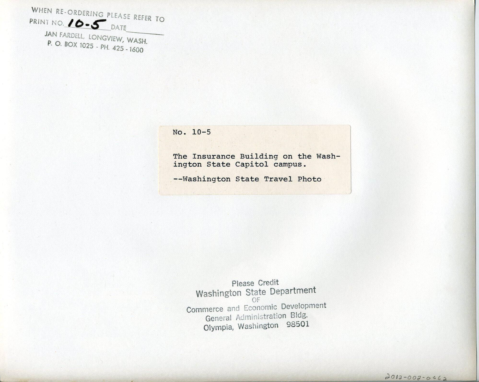 Black and white photo of the Washington State Insurance Building.The view shows the front and one side. The building is constructed of sandstone. There are eight columns supporting a roof over a porch. In front of the porch are stone steps and side walls upon which are large metal and glass lamps. Above the roof is a gable and a flat portion that has inscribed the words "Insurance Building". On the side of the building are two stories of windows There are evergreen shrubs and trees around the building. A portion of another building is visible in the left background. In the foreground is a parking area with numerous vehicles, and a portion of lawn with two wooden barriers. There is a white border on all sides. On the back is a pasted-on paper that has typed "No. 10-5 The Insurance Building on the Washington State Capitol campus. --Washington State Travel Photo". A stamp in the upper left corner says "When re-ordering please refer to print No. ____ date ____ Jan Fardell, Longview, Wash. P. O. Box 1025 - Ph. 425-1600". In a blank after the word "No." is written in black pen "10-5". A stamp at the bottom says "Please Credit Washington State Department of Commerce and Economic Development General Administration Bldg. Olympia, Washington 98501".Made/Created