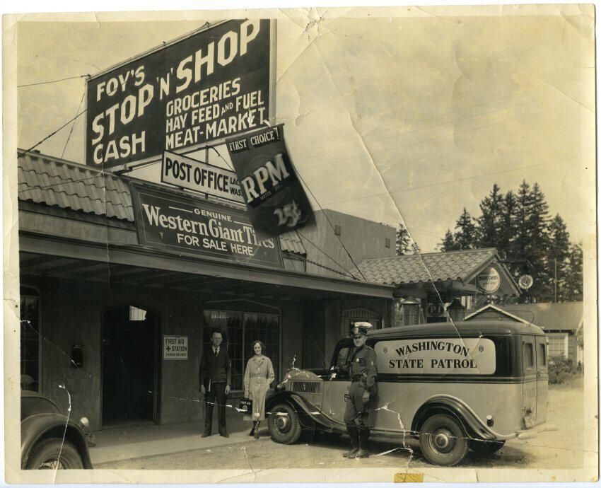 Foy Store, Unknown Date. This black and white photograph shows the exterior front of the Foy Store. It also shows, from left to right, an unknown man (most likely either Gordon L. Foy, Sr. or Henry Turner), Billie Bragg and an unknown state patrolman (likely Stacey Mattson). The unknown man on the left has closely cropped dark hair and is wearing circular-framed glasses. He is also wearing a buttoned cardigan over a dress shirt and tie, and slacks. He is holdig a binder or ledger in his right hand. Ms. Bragg has chin-length, somewhat curly hair and may be wearing glasses with very thin frames. She is also wearing a long, buttoned jacket. In her right hand is a kit case which reads "FIRST AID" on the side. The state patrolman is wearing a state patrol uniform, including the cap. Immediately behind the state patrolman is a Washington State Patrol automobile. This automobile has a van-style back end with double doors at the rear. Printed on the side is "WASHINGTON STATE PATROL." This vehicle is parked immediately in front of the store, and it is facing the store. The state patrolman is resting his right arm on the open driver's side window of the automobile. The store itself has a front door with a peaked arch. This door is open. To the right of the door is a sign which reads "FIRST AID STATION" and "AMERICAN RED CROSS." To the right of this sign is a double window with many small panes of glass. To the left of the front door is a small box on the wall which reads "DROP LETTERS." To the left of this box a portion of a window like the one previously described is visible. A portion of roof projects horizontally out from the front of the store. Above this roof portion is a sign which reads "GENUINE Western Giant Tiles FOR SALE HERE." Above this sign is another sign, which reads "POST OFFICE LACEY WASHINGTON." Above this post office sign is another sign, which reads "FOY'S STOP 'N' SHOP" and "CASH" and "GROCERIES HAY FEED AND FUEL MEAT-MARKET." Hanging off of this sign is a flag-style sign which reads "FIRST CHOICE! RPM MOTOR OIL 25 c." A portion of the front tire, fender and hood of a second car is visible in the bottom-left corner of the image. On the far right-hand end of the store is a portion of peaked roof which projects out from the front of the building. A circular sign hanging from the roof reads "Standard Oil CREDIT CARDS good here." A smaller circular sign hangs from a rod projecting horizontally from the peak of the roof. This sign reads "NORTH COAST LINES." A house is partially visible beyond the right hand end of the store building.
