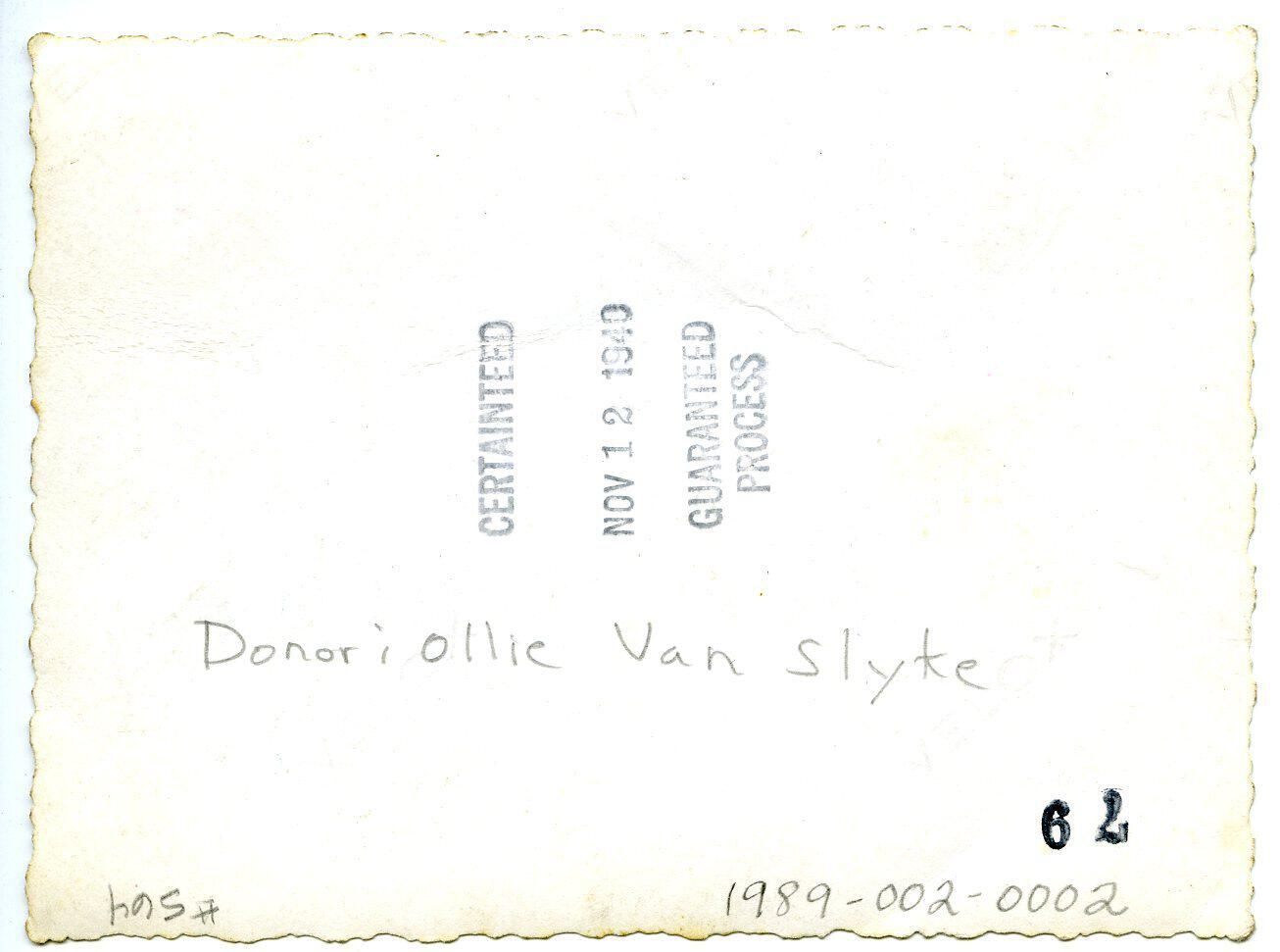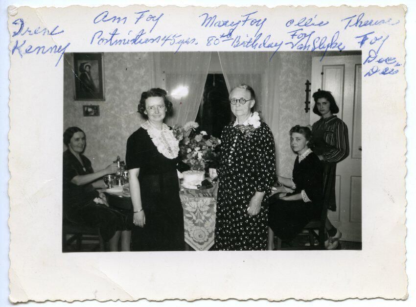Written in blue pen along the top border, from left to right, is: "Irene Kenny," "Ann Foy Postmistress 45 yrs.," "Mary Foy 80th Birthday," "Ollie Foy VanSlyke," "Theresa Foy" and two words which are indecipherable that both begin with the letter D. Note that "Kenny" is misspelled on the top of the photograph. Sources disagree on whether "Ann" or "Anne" is the correct spelling for Ms. Foy's name. The note stating that the photograph depicts Mary Foy's 80th birthday is also incorrect. ("Town of Lacey Honors Postmistress Anne Foy," Daily Olympian, November 13, 1940)Made/Created