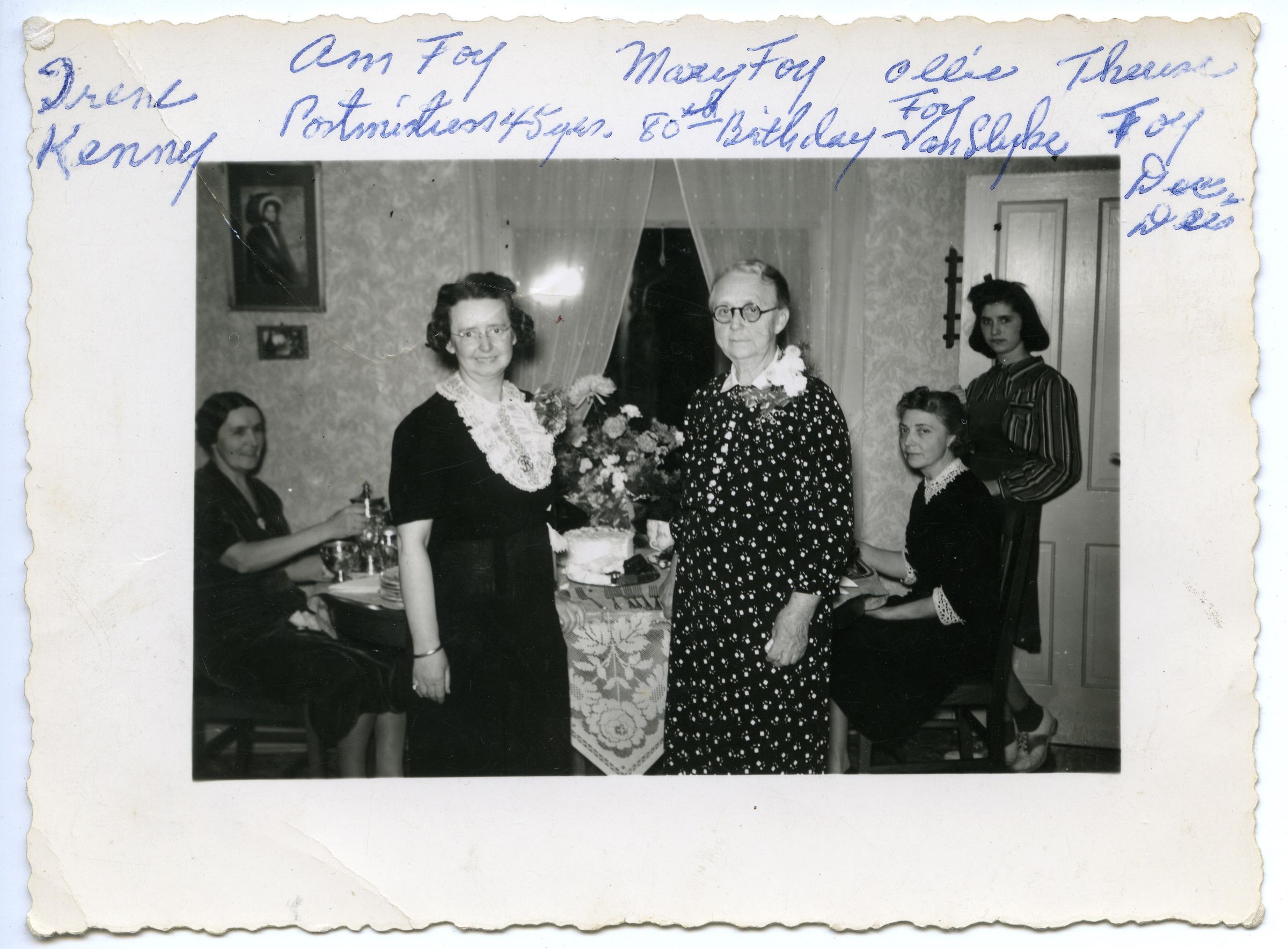 Party for Ann Foy, 1940. This black and white photograph shows five women gathered around a dinner table in a home. They are celebrating Anne Foy's 25th year as Lacey's postmistress. The party was held at Anne Foy's home. From left to right the women are: Irene Kenney, Anne Foy, Mary Foy, Ollie Foy VanSlyke and Theresa Foy. Ms. Kenney is seated at the table, and her back is nearly in line with the left-hand edge of the image. Her hair is up and she is wearing a dark, short-sleeved dress. She is smiling and her head is oriented somehat toward the right-hand side of the image. Her right arm is raised, but it does not appear that anything is in her hand. Anne Foy is facing toward the camera and smiling, and her body is oriented somewhat toward the right-hand side of the image. She has chin-length, curly hair and is wearing glasses. She is also wearing a dark, short-sleeved dress with a white frill at the neck and chest. Her arms are down at her sides. Mary Foy is also looking toward the camera, but she is not smiling. Her body is oriented somewhat toward the left-hand side of the image. Her hair is up and she is wearing glasses with thick, circular rims. She is wearing a dark, long-sleeved dress with a pattern of small, light-colored objects which are likely flowers. She is wearing a corsage to the left-hand side of the neck. There are buttons down thr front of her dress. Her arms are down at her sides. Ollie Foy VanSlyke is seated at the table and her body is oriented toward the left-hand side of the image. Her head is turned somewhat toward the camera, and she is looking toward the camera. She either has short hair or is wearing her hair up. She is wearing a dark dress with sleeves to the mid-forearm. There is lace at the neck and sleeve ends. Her hands are in her lap. Theresa Foy is standing with her body oriented somewhat toward the left-hand side of the image and she is facing the camera. She has chin-length hair with the ends and bangs curled. She is wearing a vertically-striped shirt and a knee-length skirt. The dinner table has a lace tablecloth and a bouquet in a vase at the center. Next to the vase is a frosted cake. A window with sheer curtains is beyond the table. To the left of the window is a piece of art depicting what appears to be a person in a hooded robe. Below this piece of art is a much smaller piece of art. The subject matter of this second piece of art is unclear because it is so small. To the right of the window is a paneled door.