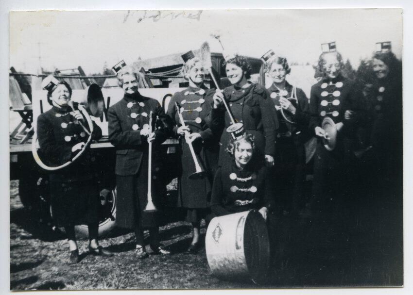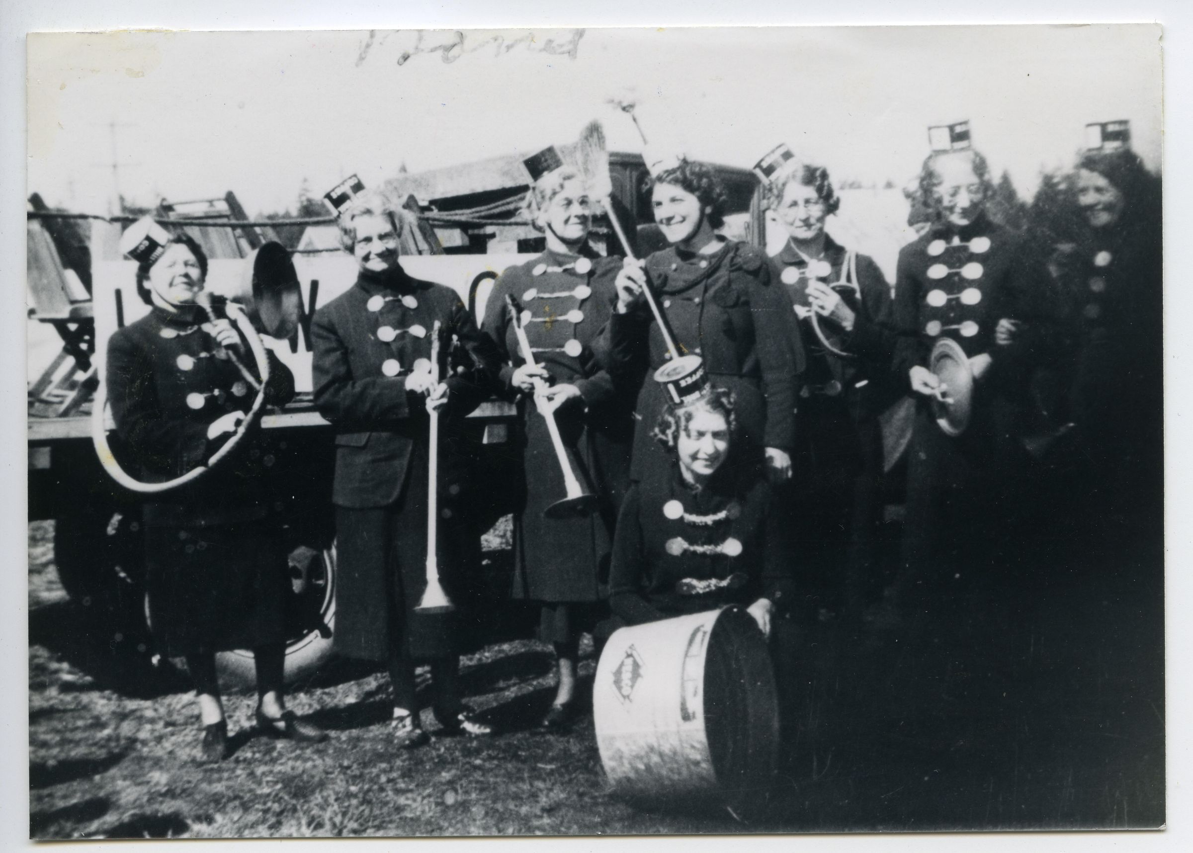 The donor provided a list of women in the Lacey Kitchen Band, but the individuals are not specifically identified according to the photo. They are: Carol Van Slyke, Hazel Hoffman, Grace Dent, Marie McNamara, Martha Bowker, Alma Watkins, Margarete McKibbin, and Ollie Foy.Made/Created