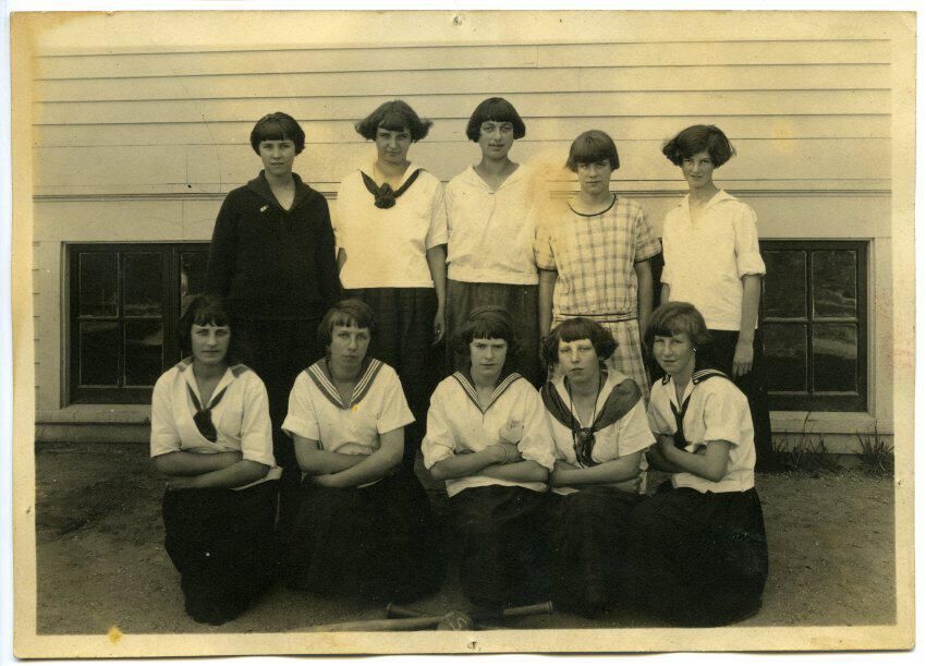 Lacey School girls baseball team from the 1923-1924 school year depicted in a black and white (brown-toned) 5" x 7" photograph with an unevenly spaced white border. There are 10 girls pictured outside on the side of the Lacey School. Garden level windows are visible behind them. The girls in the front row are squatting, each with their arms crossed. In front of them are two baseball bats and what appears to be a softball. The back row is facing forward. The girls are wearing similar, but not identically styled skirts and shirts with sailor type collars.