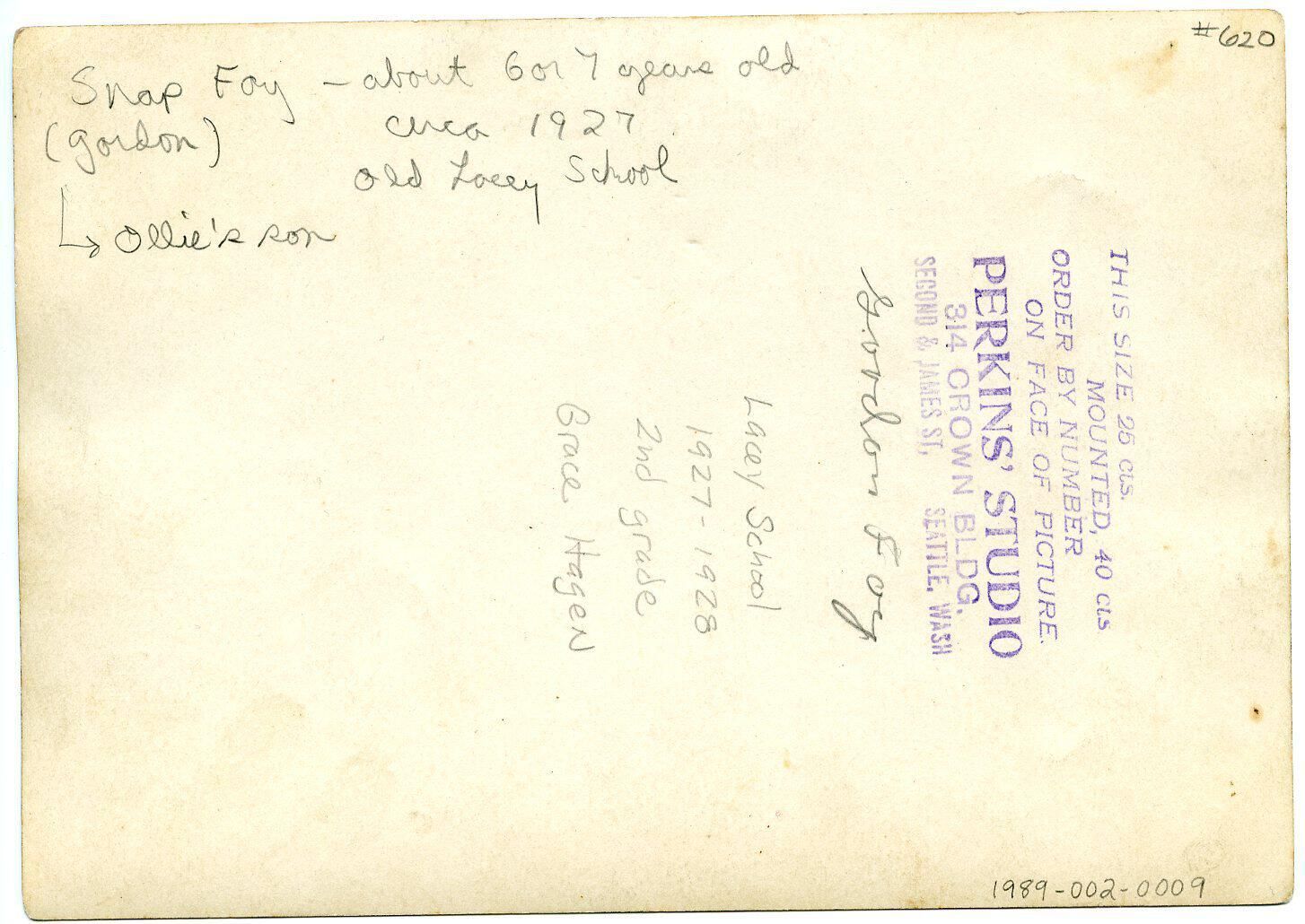 On the back of the photo, in the upper right corner is written in pencil: "#620" presumably by museum staff and at left "Snap Foy (Gordon) Ollie's son -- about 6 or 7 years old circa 1927 Old Lacey School." At right, oriented vertically is the photographer's stamp: " This size 25cts. Mounted, 40cts. Order by Number on face of picture. Perkins Studio, 314 Crown Bldg. Second & James St., Seattle, Wash" and next to this in pencil is "Gordon Foy" and then "Lacey School 1927-1928 2nd grade Grace Hagen".Made/Created
