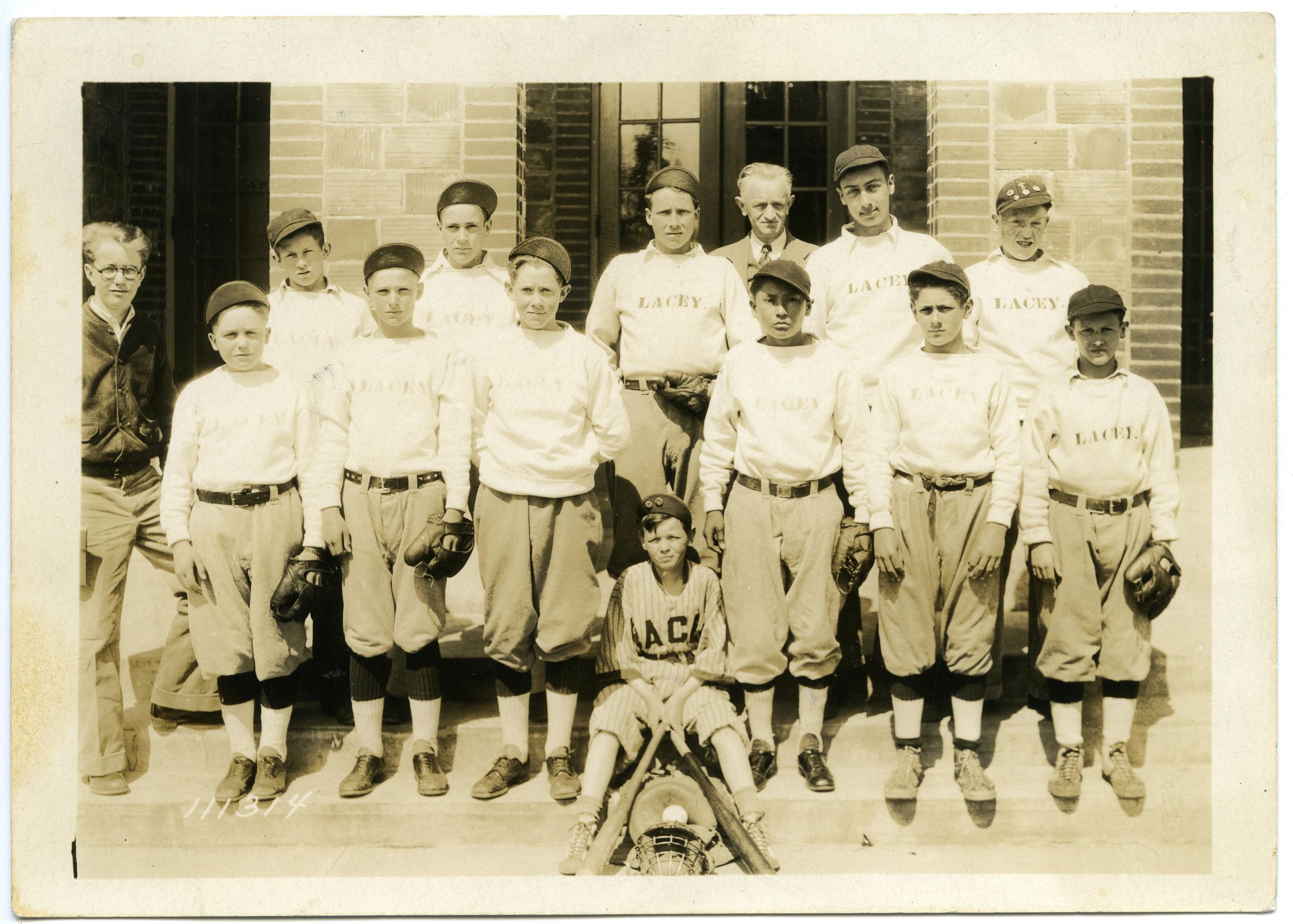 Lacey School boys' baseball team from the 1932-1933 school year depicted in a black and white 5" x 7 " photograph with an uneven white border. There are 13 boys and one teacher (coach) pictured. There is one boy sitting in the center of the front row while the other seven boys are standing. The second row is comprised of five boys and the teacher/coach. Most of the boys are wearing a light colored long-sleeved shirt with "Lacey" on the front, and some of the letters are faded. The boy sitting in the front row is dressed in a light colored shirt with vertical pinstripes and the word "Lacey" emblazoned on the front. In front of him is an aesthetic arrangement of baseball equipment, including a baseball in a baseball glove, a catcher's mask and two baseball bats in a "V" shape. Most of the boys appear to be wearing bi-colored knee socks. Eight of the boys are visibly holding baseball gloves. The boy at far left is wearing regular clothes and glasses. The teacher, Mr. Claude M. Manley, is wearing a suit, including vest, tie and jacket. The group is pictured outside on the front steps of the Lacey School. The doors are visible behind them. The students are facing forward. At the bottom left of the image is written in white: "111314".