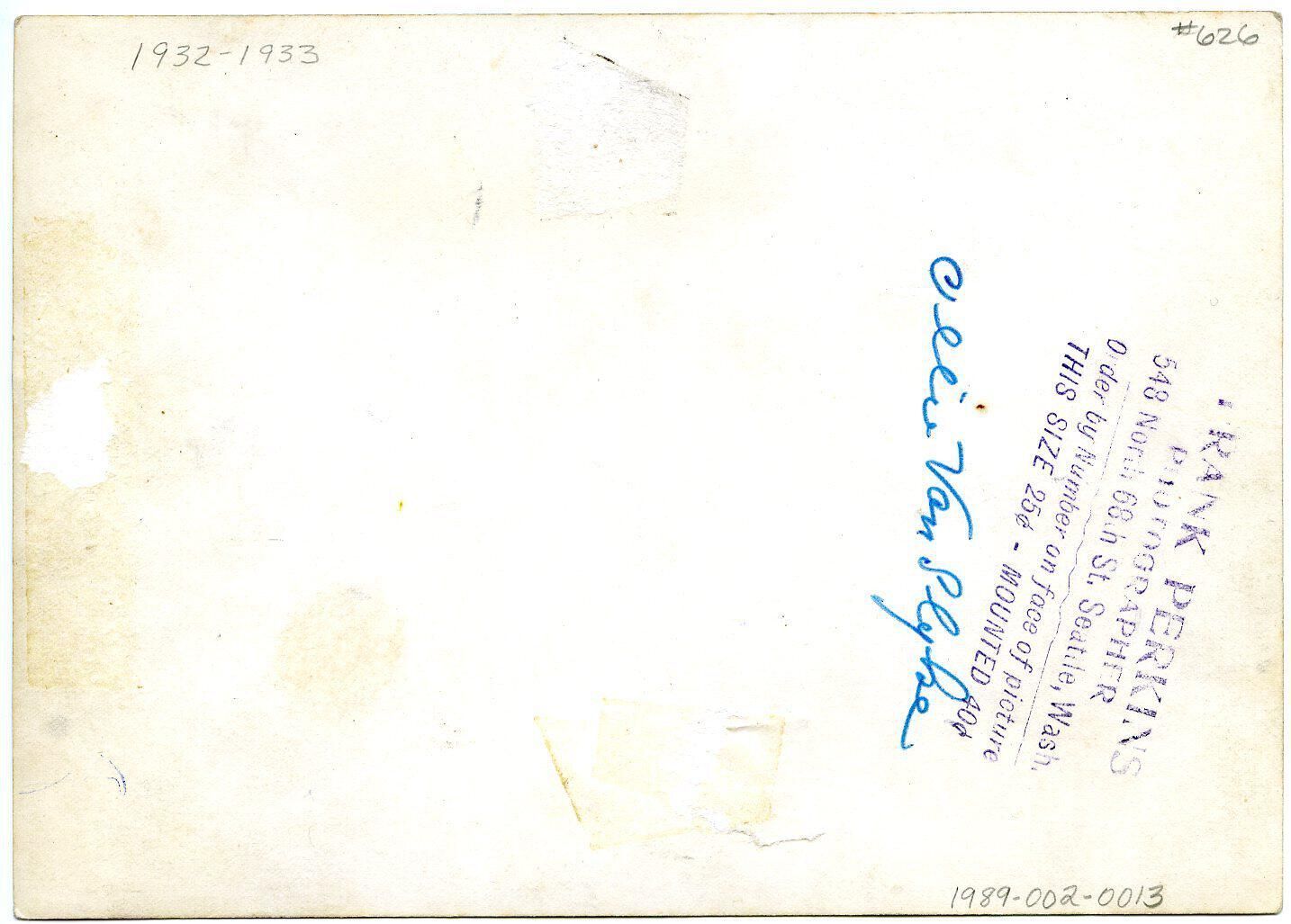 On the back of the photo, in the upper right is written in pencil: "#626" and at upper left is "1932-1933", presumably by museum staff. At right, oriented vertically is the photographer's stamp: "Frank Perkins, Photographer, 548 North 68th St., Seattle, Wash. Order by Number on face of picture, This size 25¢ - Mounted 40¢". Written vertically at right: "Ollie Van Slyke".Made/Created