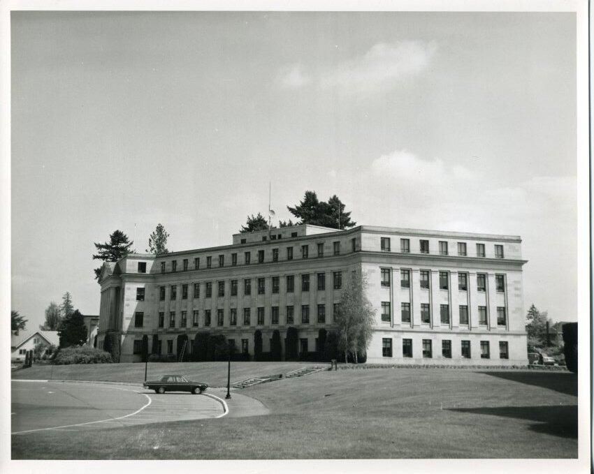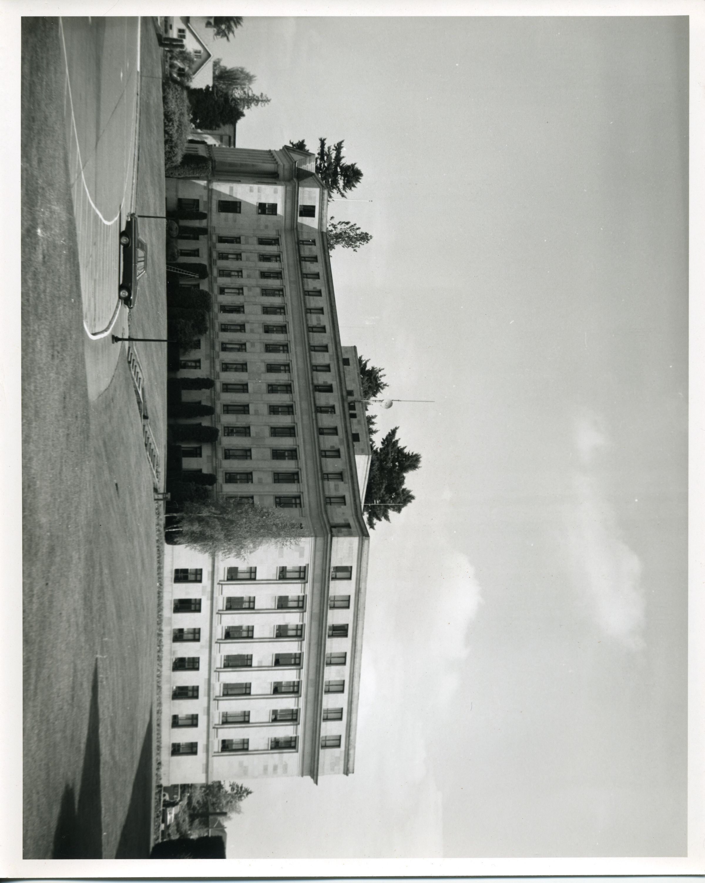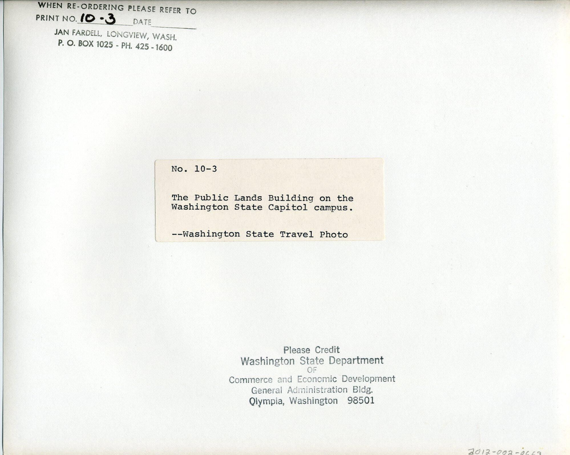 Black and white photo of the Public Lands Building on the Washington State Capitol campus. The building is constructed of sandstone. The building has ends that are at right angles to each other with the center part stretching between the two. There are four stories of windows with a smaller portion making a fifth story with a mast on top with a communication dish attached. There are evergreen and deciduous trees and shrubs around the bottom of the building and behind it. At the left, a portion of a house and another building is visible. In the foreground is an expanse of lawn with concrete stairs between a parking area and the building. There is a curved driving area with a curved side walk and parking spaces. One vehicle is parked. There are lamp posts and a wooden sign near the stairs. There is a white border on all sides. On the back is a pasted-on paper that has typed "No. 10-3 The Public Lands Building on the Washington State Capitol campus. --Washington State Travel Photo". A stamp in the upper left corner says "When re-ordering please refer to print No. ____ date ____ Jan Fardell, Longview, Wash. P. O. Box 1025 - Ph. 425-1600". In a blank after the word "No." is written in black pen "10-3". A stamp at the bottom says "Please Credit Washington State Department of Commerce and Economic Development General Administration Bldg. Olympia, Washington 98501".Made/Created