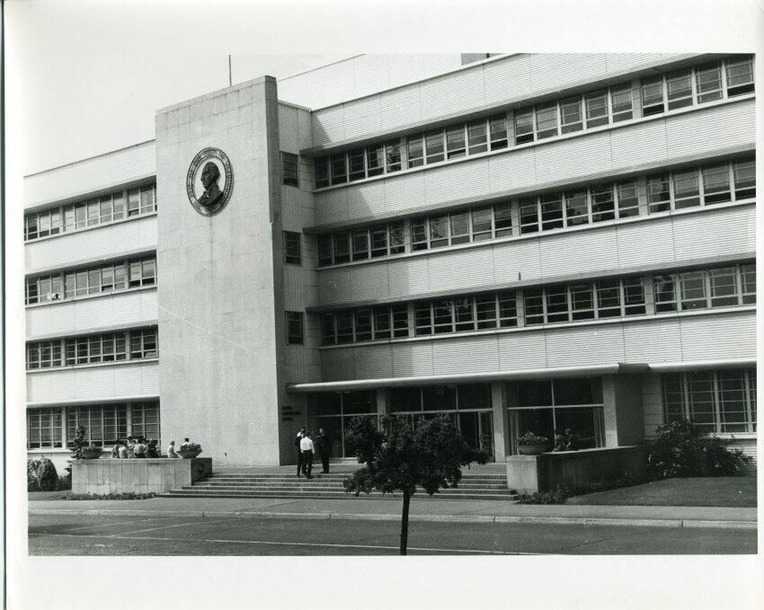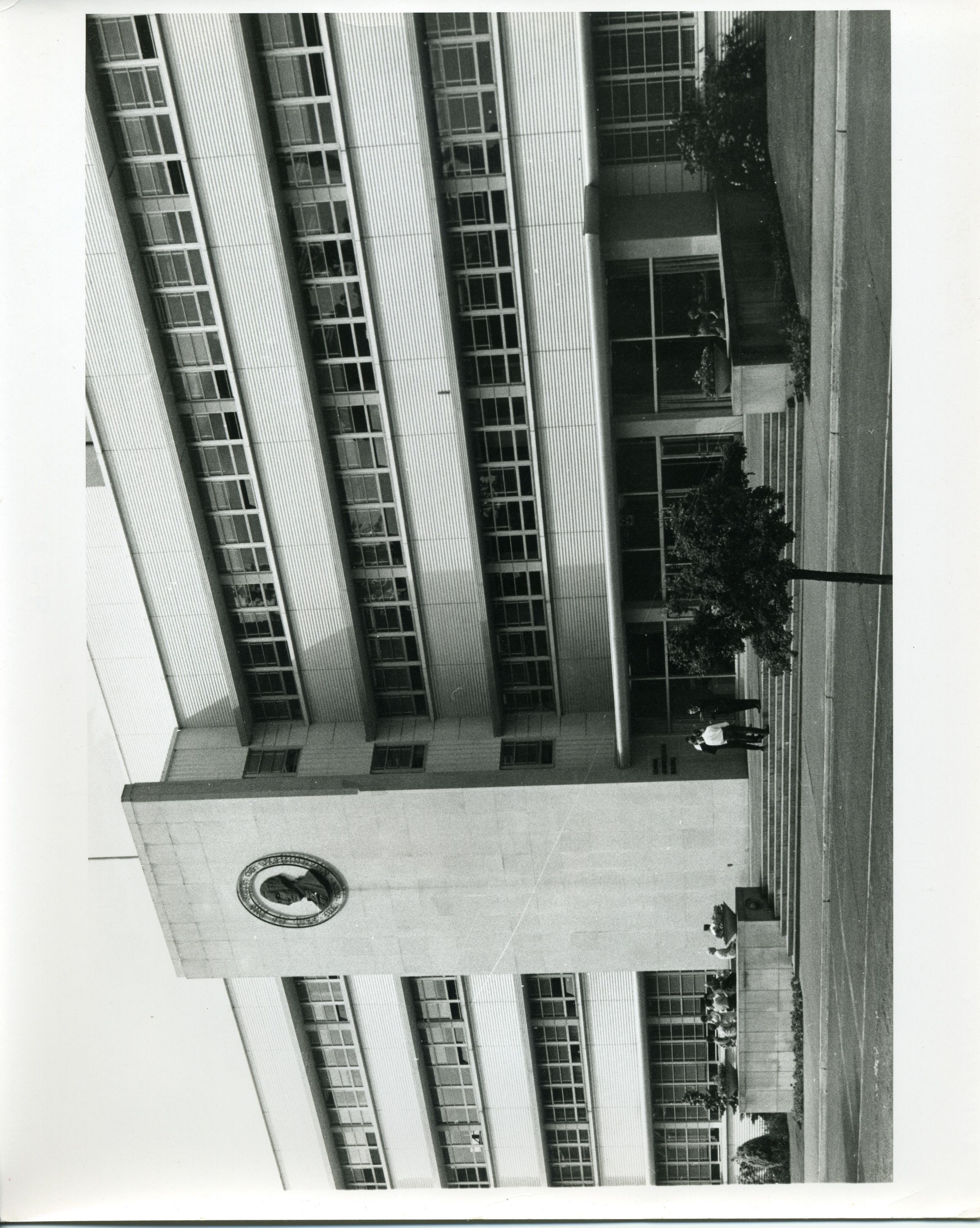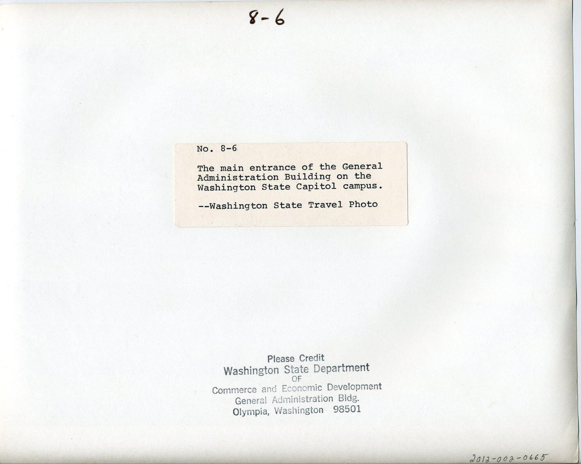 Black and white photo of the General Administration Building on the Washington State Capitol campus. The building has four stories. At the lower level is a wide porch-like area with walls and planters around some of the edges. People are sitting or standing in the area. From the porch, steps lead down to a sidewalk and then to a street. There are shrubs and trees visible around the bottom of the building and across the street in the immediate foreground. Behind the porch is an entrance with many glass doors and at the left and right of the image are windows. At the left of the image is a portion of the building that extends forward and has a flat face with a metal image of the state seal with an image of George Washington in the center. The remainder of the building above the first floor has alternate horizontal rows of molded concrete and windows on each floor. there is a flag pole on top of the building and a smaller portion of another floor. There is a white border on all sides with the top and bottom border being larger. On the back in ink is "8-6". On a pasted-on paper is typed "No. 8-6 The main entrance of the General Administration Building on the Washington State Capitol campus. --Washington State Travel Photo". A stamp says "Please credit Washington State Department of Commerce and Economic Development General Administration Bldg. Olympia, Washington 98501".Made/Created