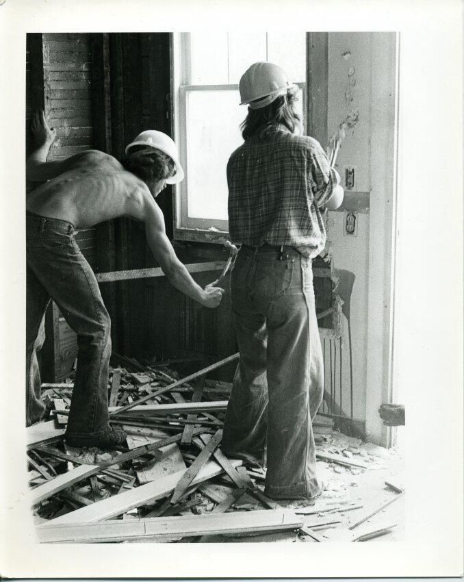 Black and white photo of workers inside the house that became the Lacey Historical Museum after it was moved to its present location. The workers are wearing hard hats and have their backs to the camera. The one on the left has no shirt and is wearing jeans. He is wielding a hammer at a wall below a window. The worker on the right has on a checked shirt and jeans. He is holding a tool against a wall with electrical outlets visible. The wall on the left shows plaster lath strips and the floor is littered with lath pieces and other debris. At the bottom right of the image there appears to be a hand in a glove. There is a white border on all sides. On the back in felt pen is "E" in a circle, "2 col" crossed out, and "1 1/2 col". In green felt pen is "2 + at 63%". In pencil is "H3 fil 35 secs F 8".