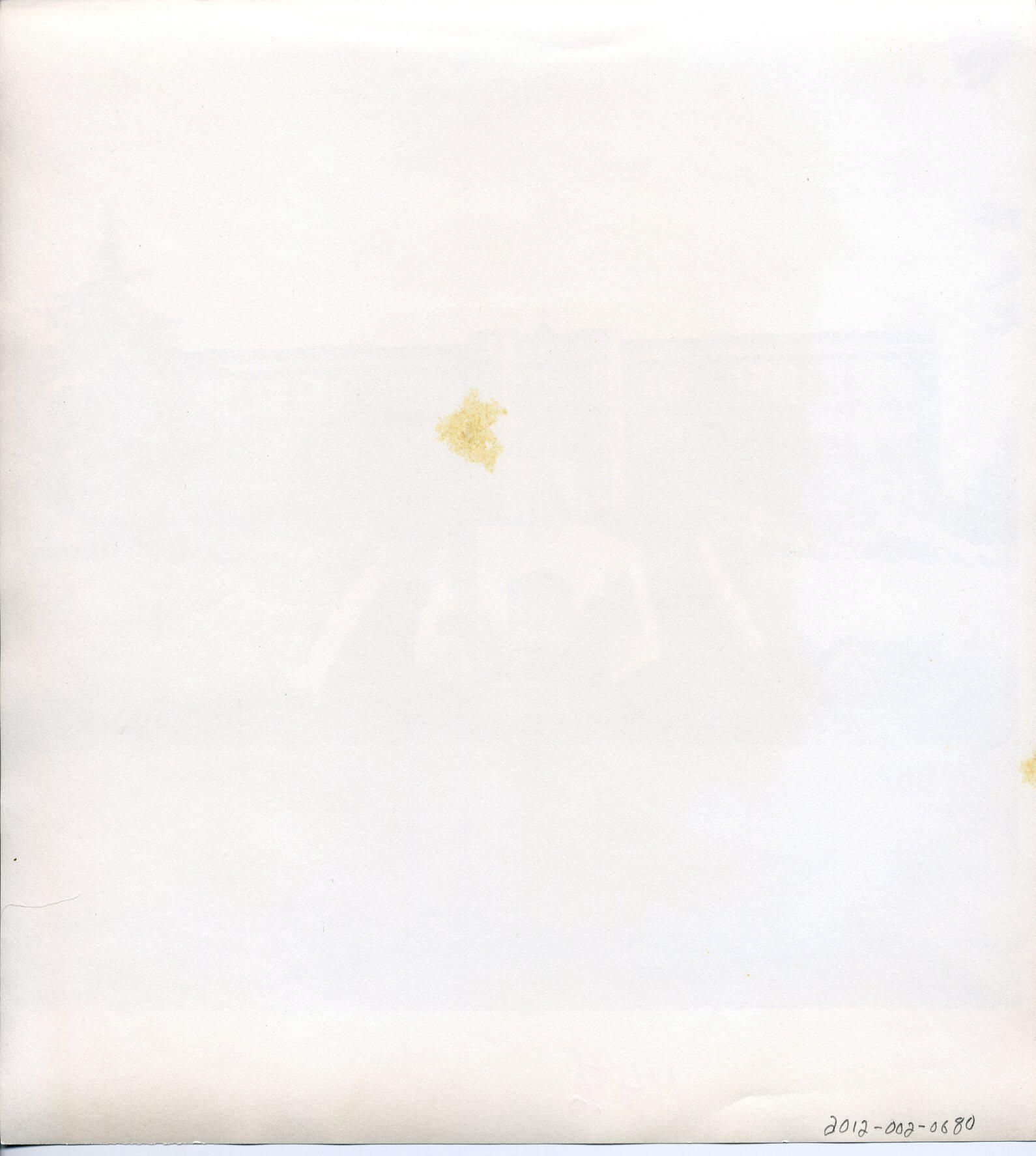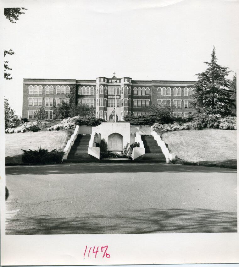 Black and white photo of the main building at Saint Martin's College. In the foreground is lawn and a roadway. Behind that is a pair of stairs on either side of an enclosed area with foliage and a religious image on stone. Above that area is a flag pole and a statue. There are shrubs and trees in front of the building which is three stories in height. It is built of stone with a row of windows on each floor. On either side of the entrance is a conical tower of the same material as the rest of the building. There is a cross on the roof. There is a white border on all sides with the bottom border being larger and having written on it in red ink "114%". There is no information on the back.