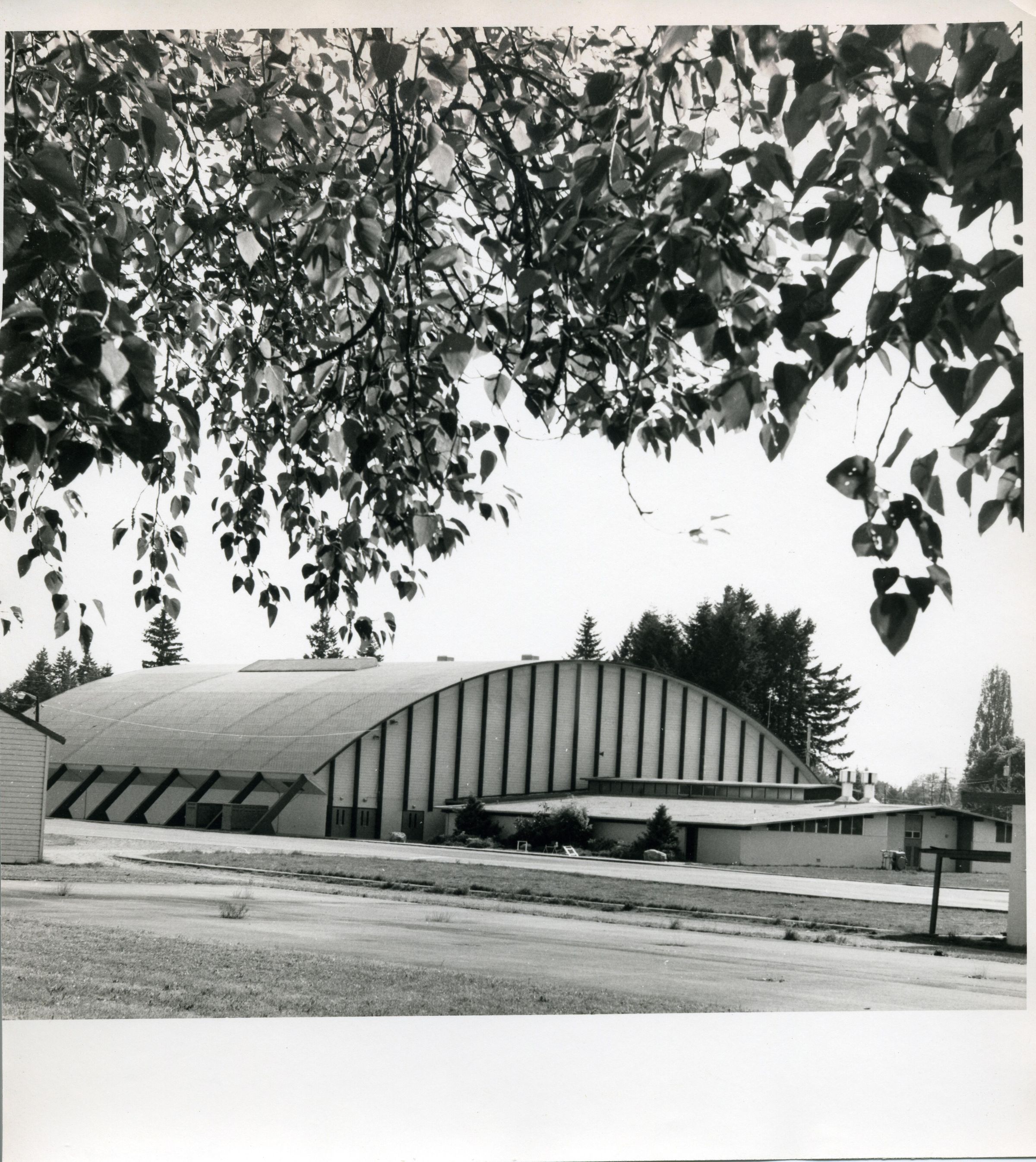 Black and white photo of the gymnasium building at St. Martin's College. In the foreground there is a street and sidewalk below and tree branches above. The building's roof is a hemisphere that comes close to the ground at each side. The ends of the building are vertical. There are support beams at the side and at the ends. There is a low extension at the right of the print with a fairly flat roof and some windows and a door visible. The image is not straight on the print so that there is an irregular border and a large border at the bottom. There is no information on the back.Made/Created