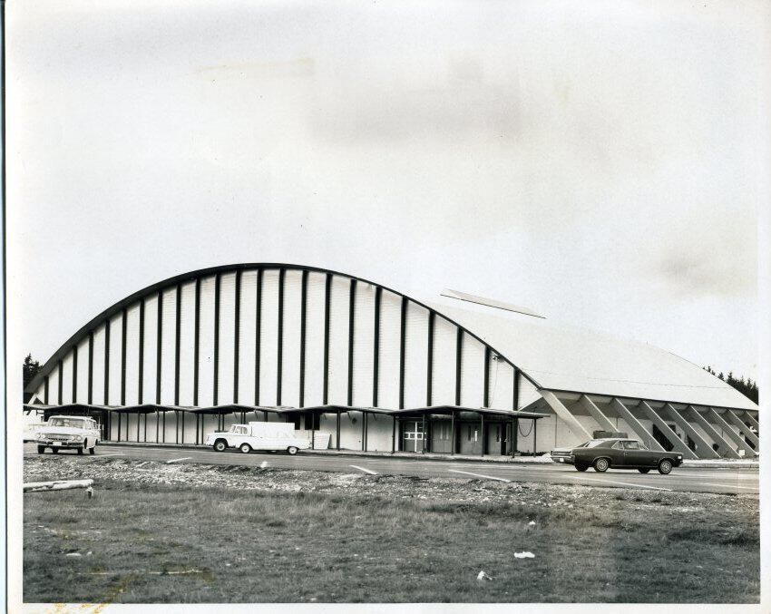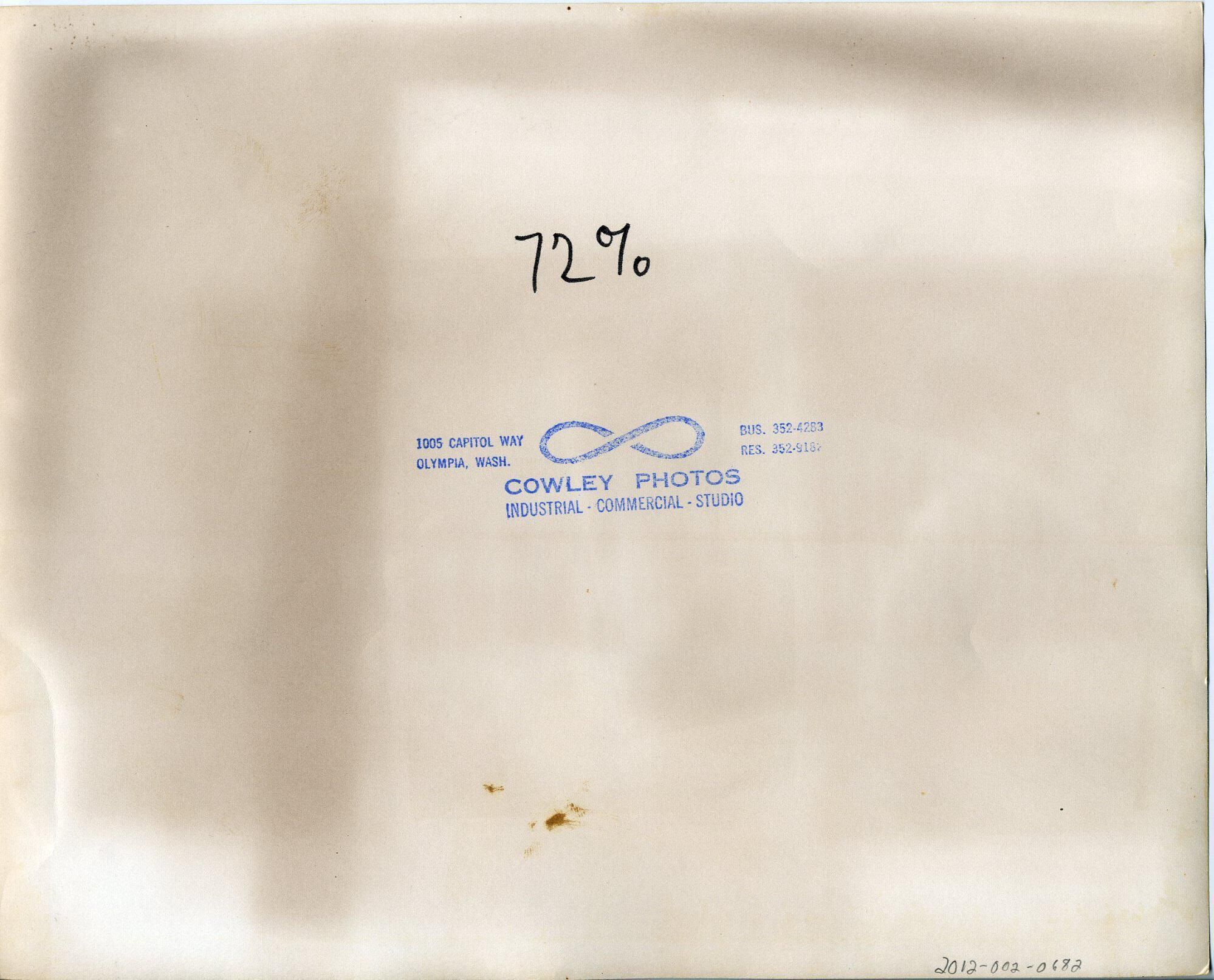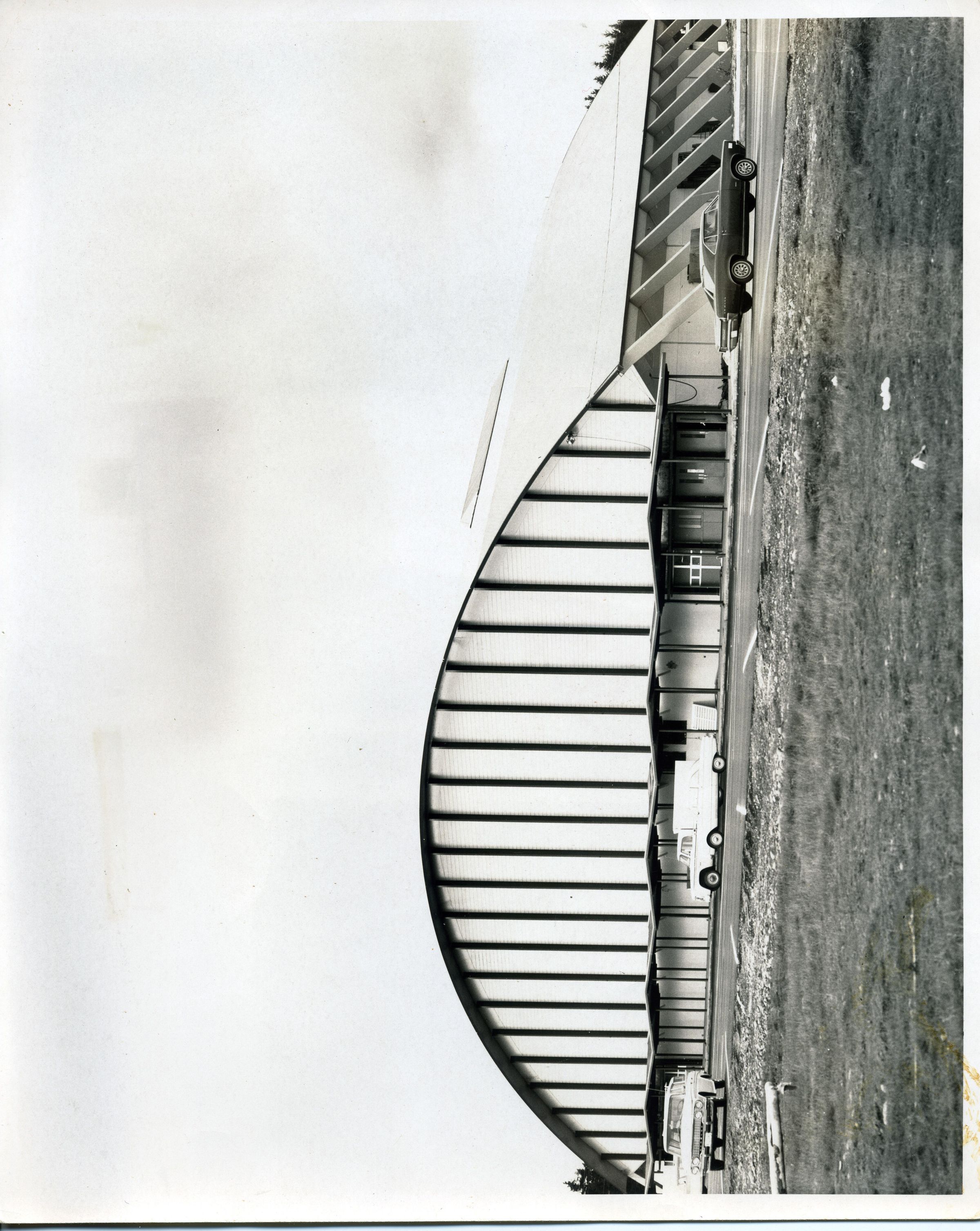 Black and white photo of the gymnasium building at St. Martin's College. The building's roof is a hemisphere that comes close to the ground at each side. The ends of the building are vertical. There are support beams at the side and at the ends. At the end of the building there is a covered walkway and closer to the camera is a street. There are several vehicles parked or moving by. In the very foreground is an area of grass and rocks. There is a white border on all sides. On the back in black ink is "72%". There is a stamp in blue ink that says "1005 Capitol Way Olympia, Wash. Bus. 352-4283 Res. 352-9187 Cowley Photos Industrial-Commercial- Studio".