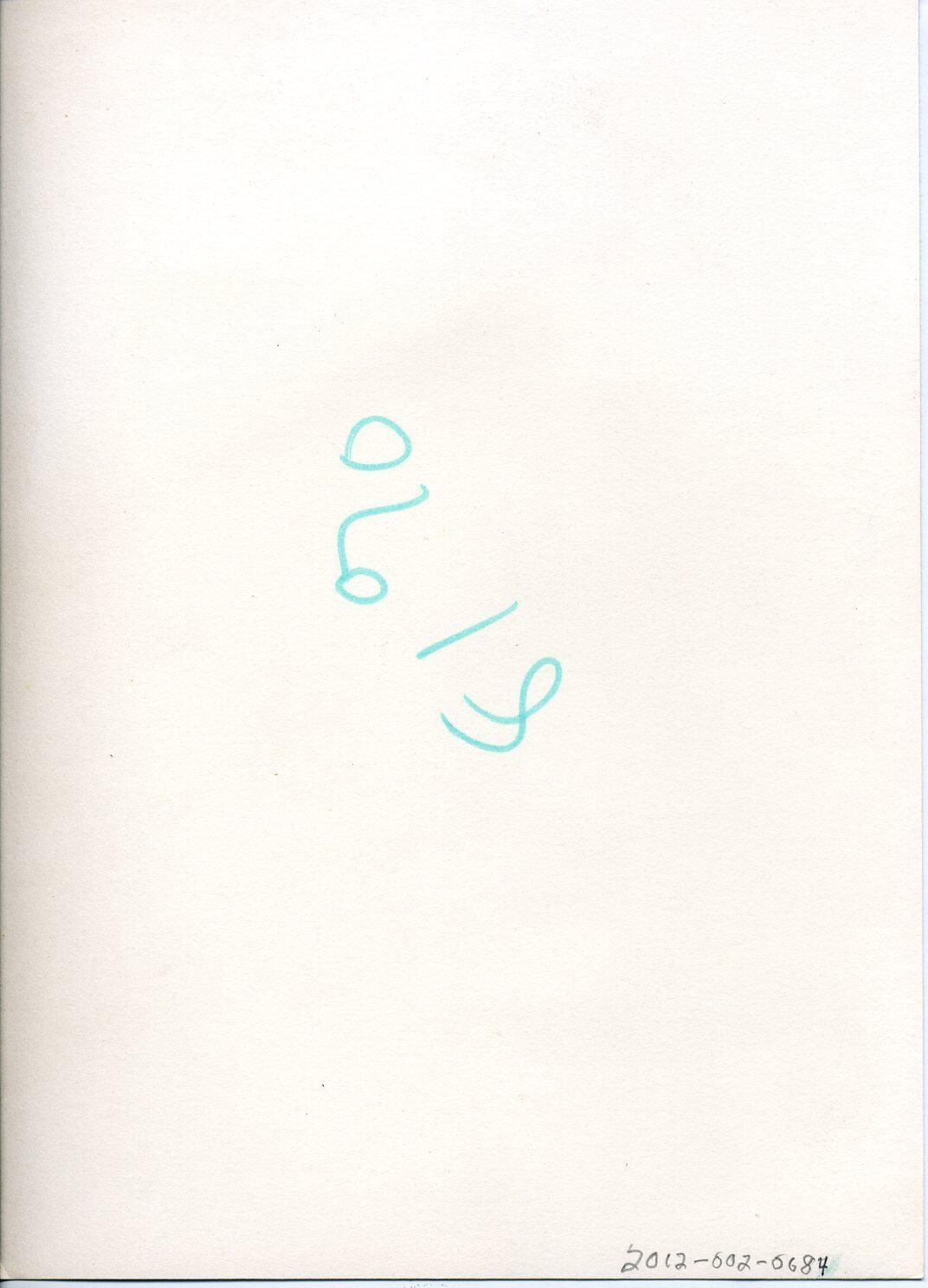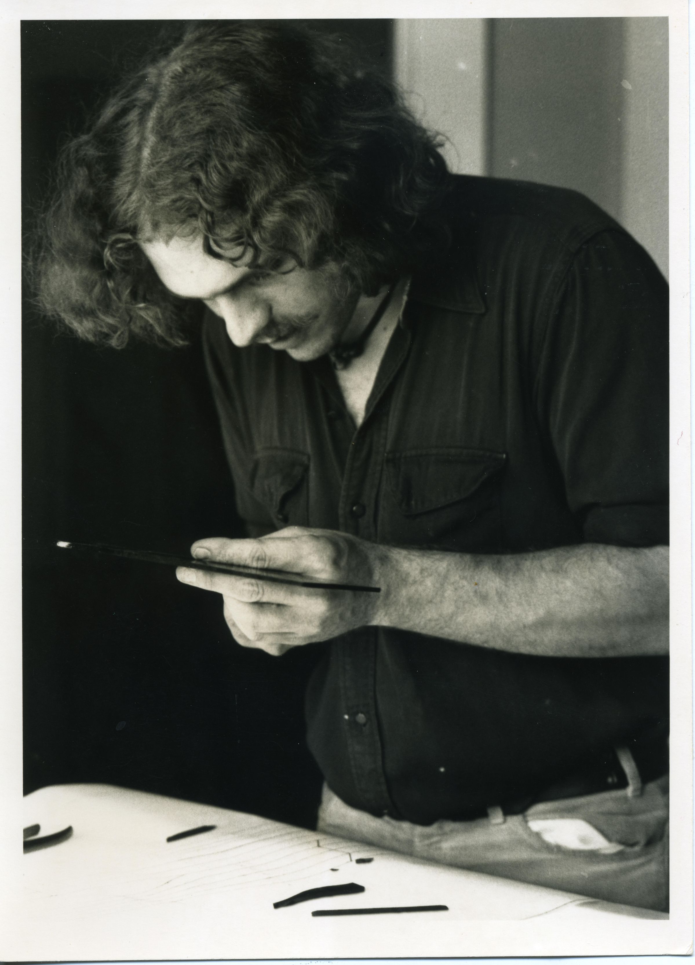 Black and white photo of a man leaning over an object he has in his hand. The man has long, dark, curly hair and is wearing a black shirt open at the collar. He has on light-colored trousers. The object is being held by his left hand. On a table in front of the man is a white surface with black marks or objects on it. In the background is what seems to be a wall. There is a white border on all sides. On the back in green ink is "81%".