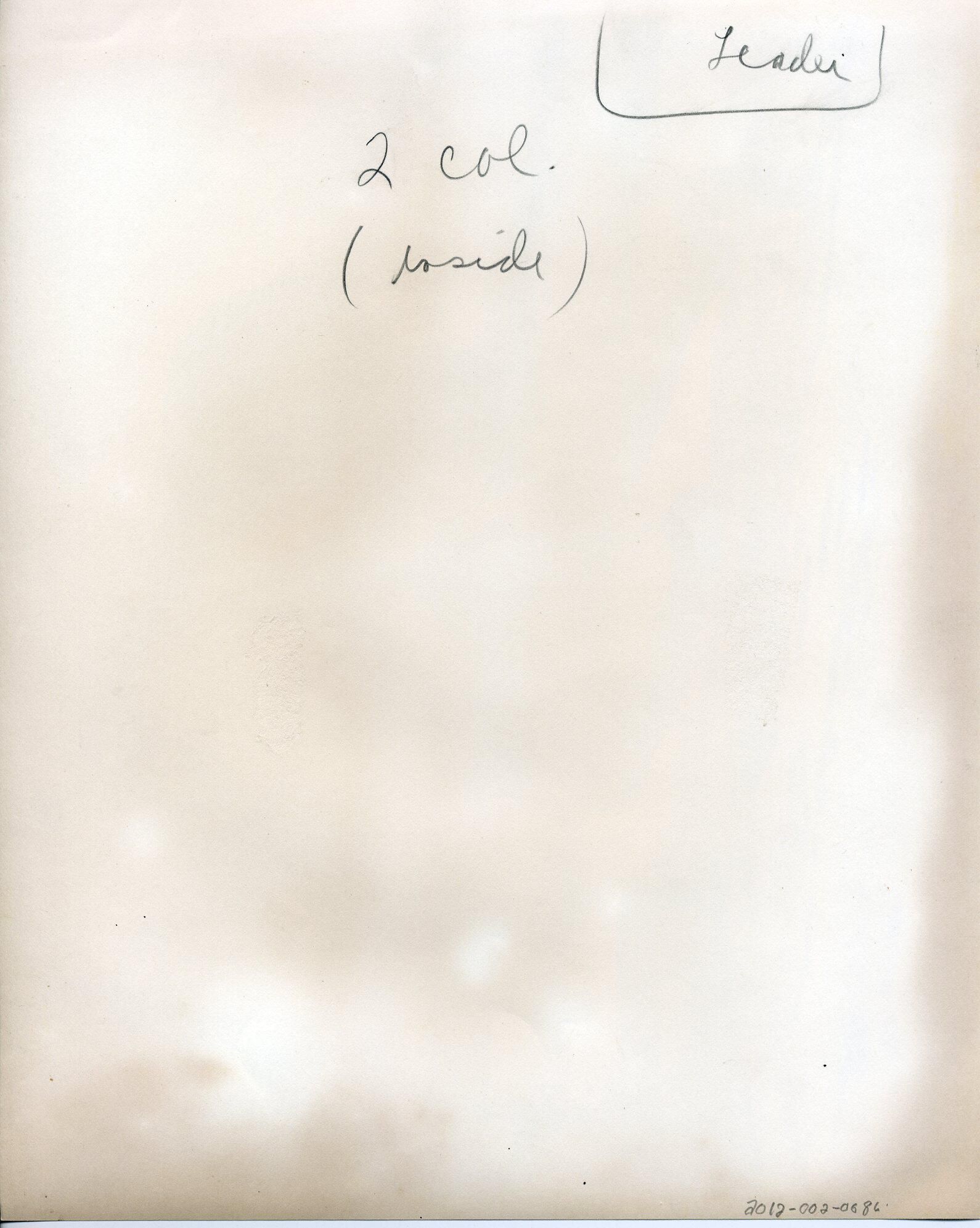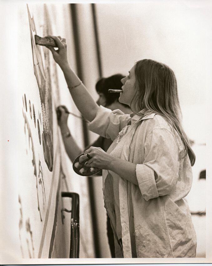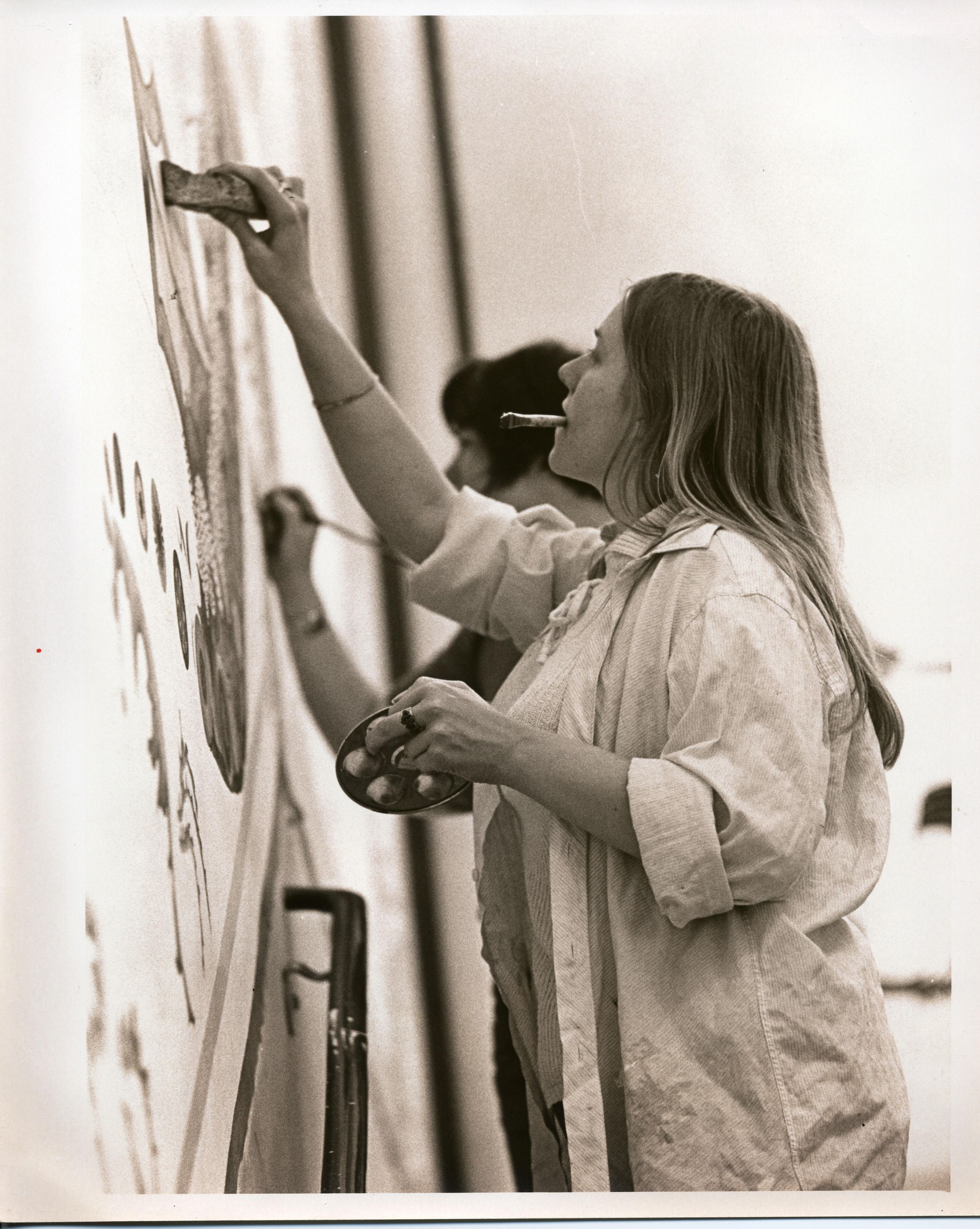 Black and white photo of two women working at a wall doing art work. The woman in the foreground has long medium dark hair and is wearing a white smock over a white bouse with a pattern. Her right hand is raised and holding a tool that is touching the wall. Her left had is holding a round object such as a paint palet. In her mouth is a object that may be a paint brush. The woman in the background is only partially visible. She has dark hair and has an arm extended to the wall with what appears to be a paint brush. On the wall is an image or design of some sort and below the image is a railing. There is a white border on all sides. On the back in ink is "Leader 2 col (inside)".